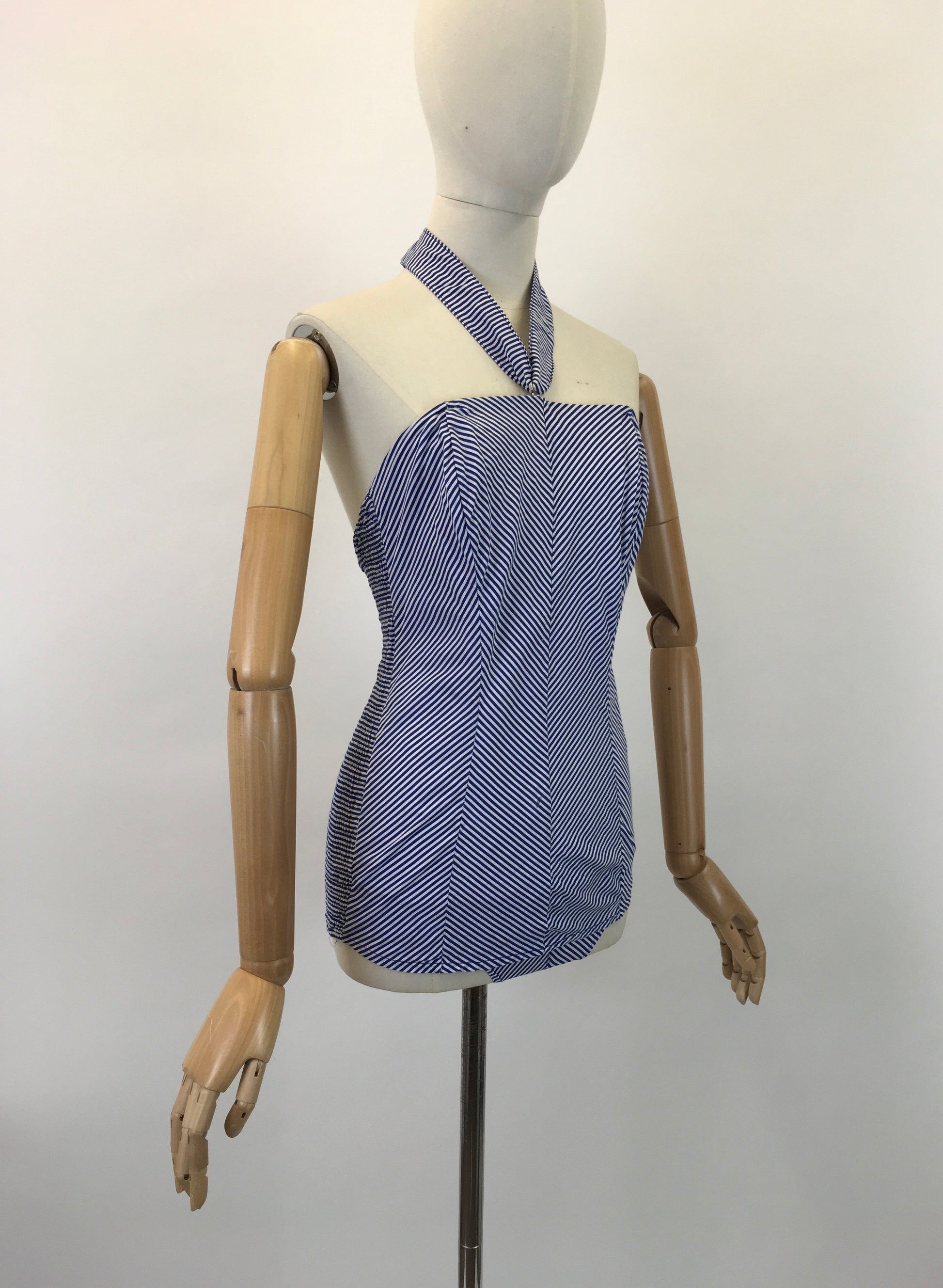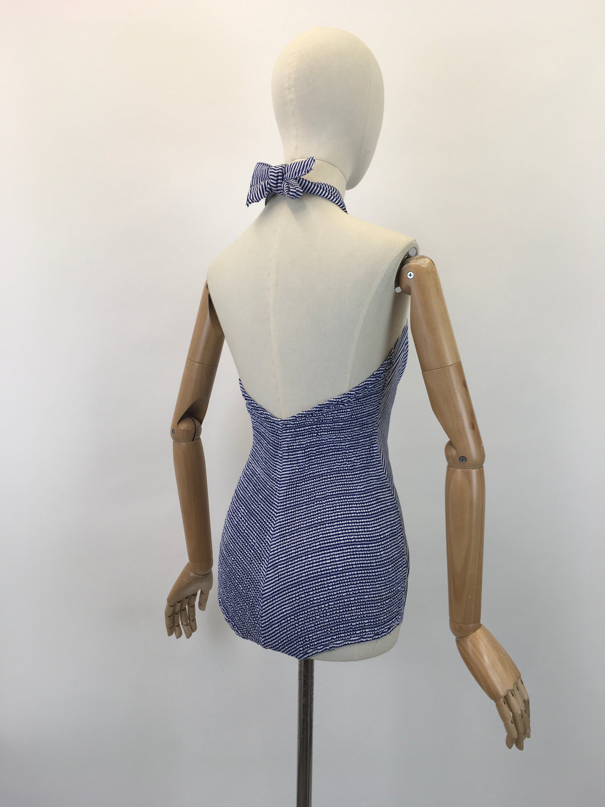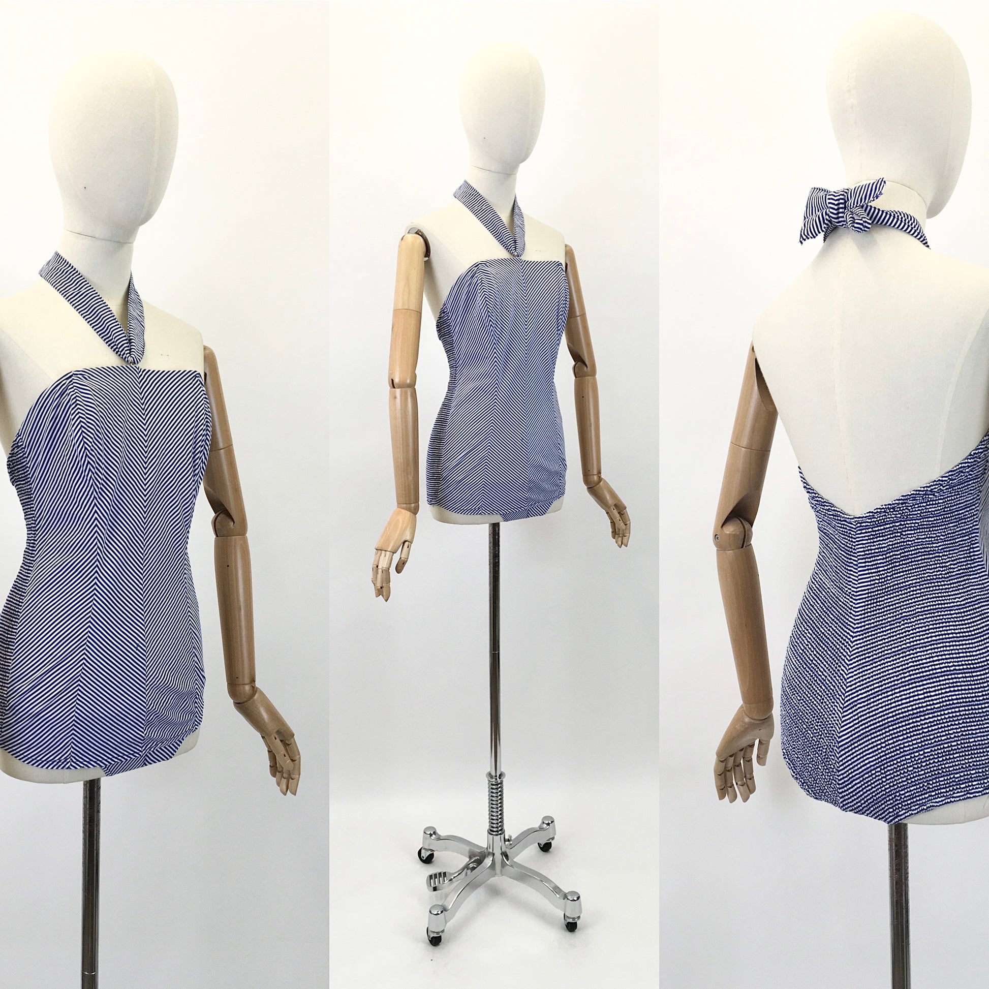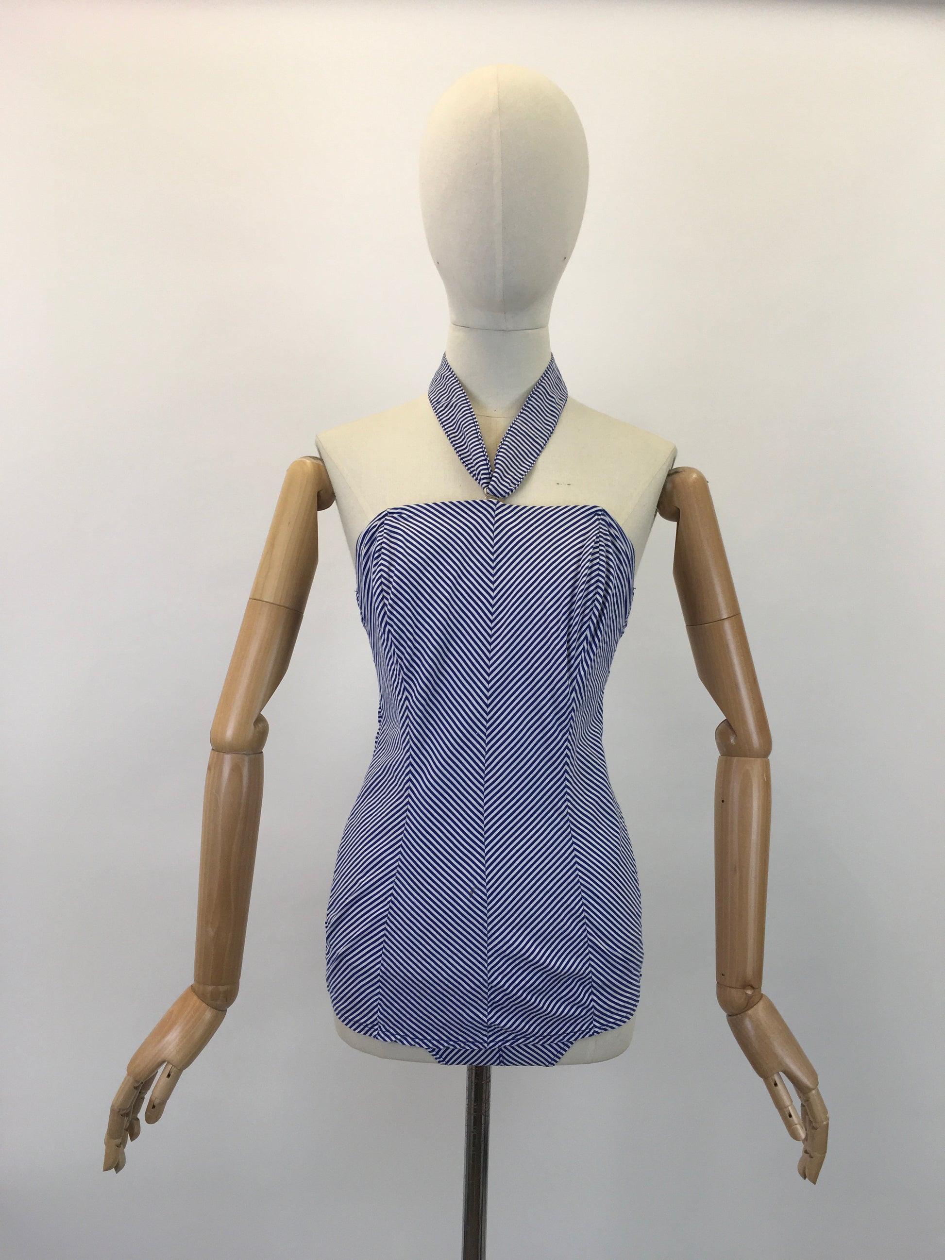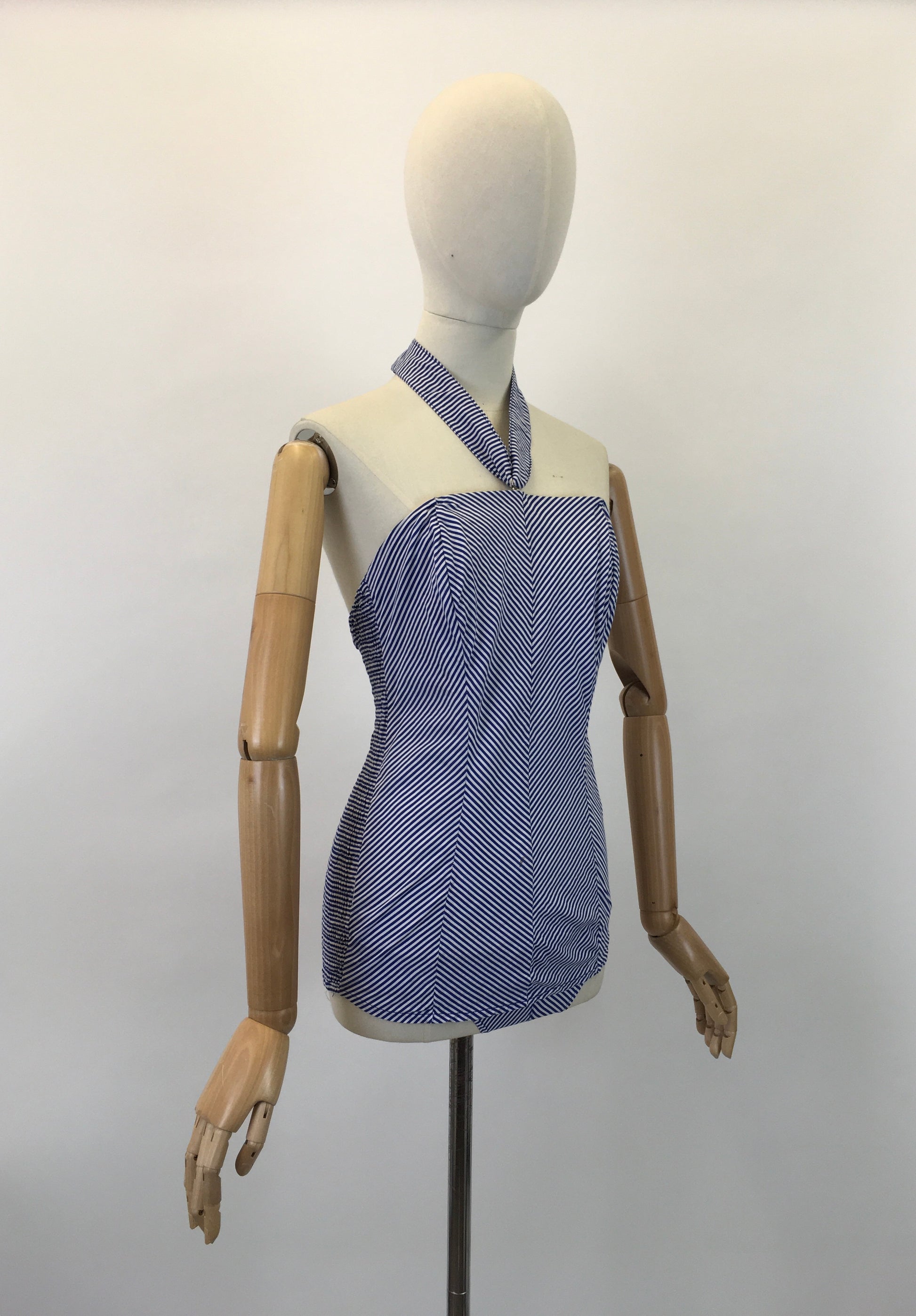 Vintage beautiful 1950's bathing suit in a blue and white stripe. This is made from a beautiful cotton and has boning to the bodice, a full smocked back panel and a lovely halterneck style wrap fastening with chrome detailing. Made by ' Martin White' - British label, this is a lovely example from its time and would be great to wear to lounge around the lido or for a day at the seaside.
