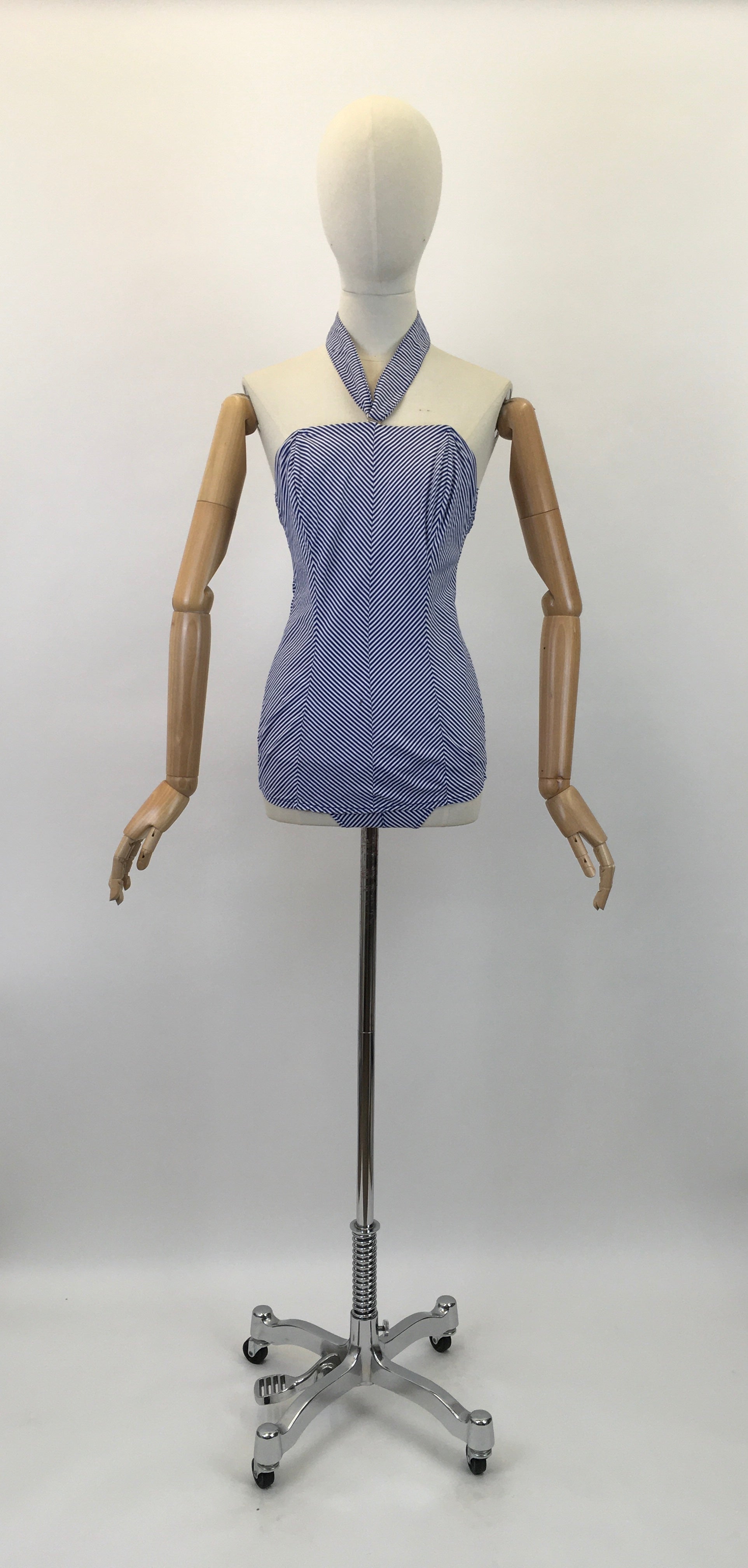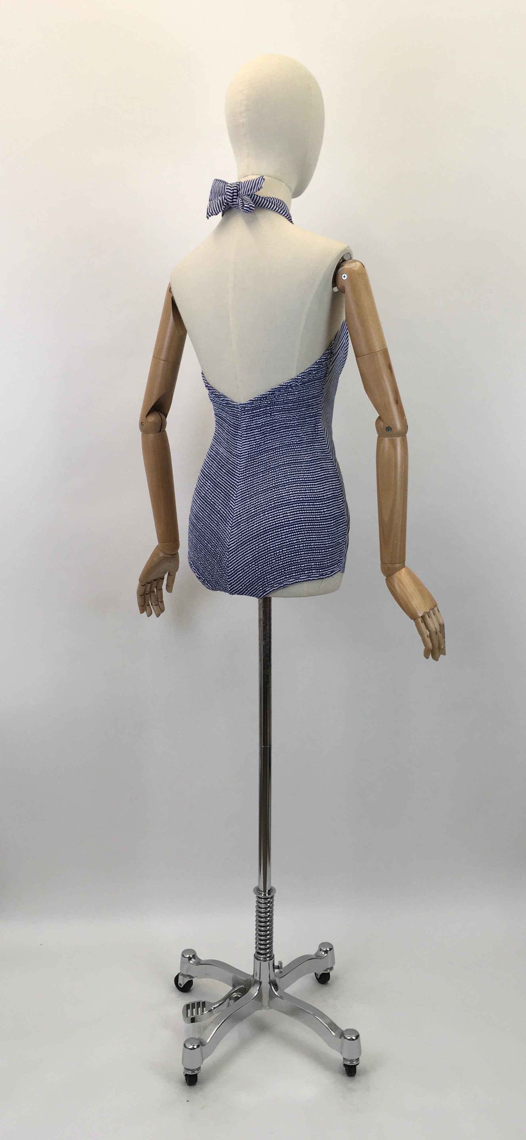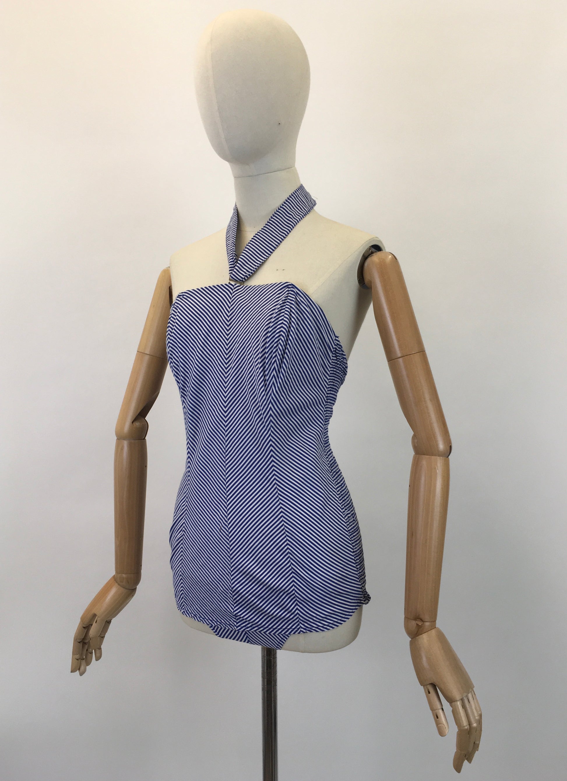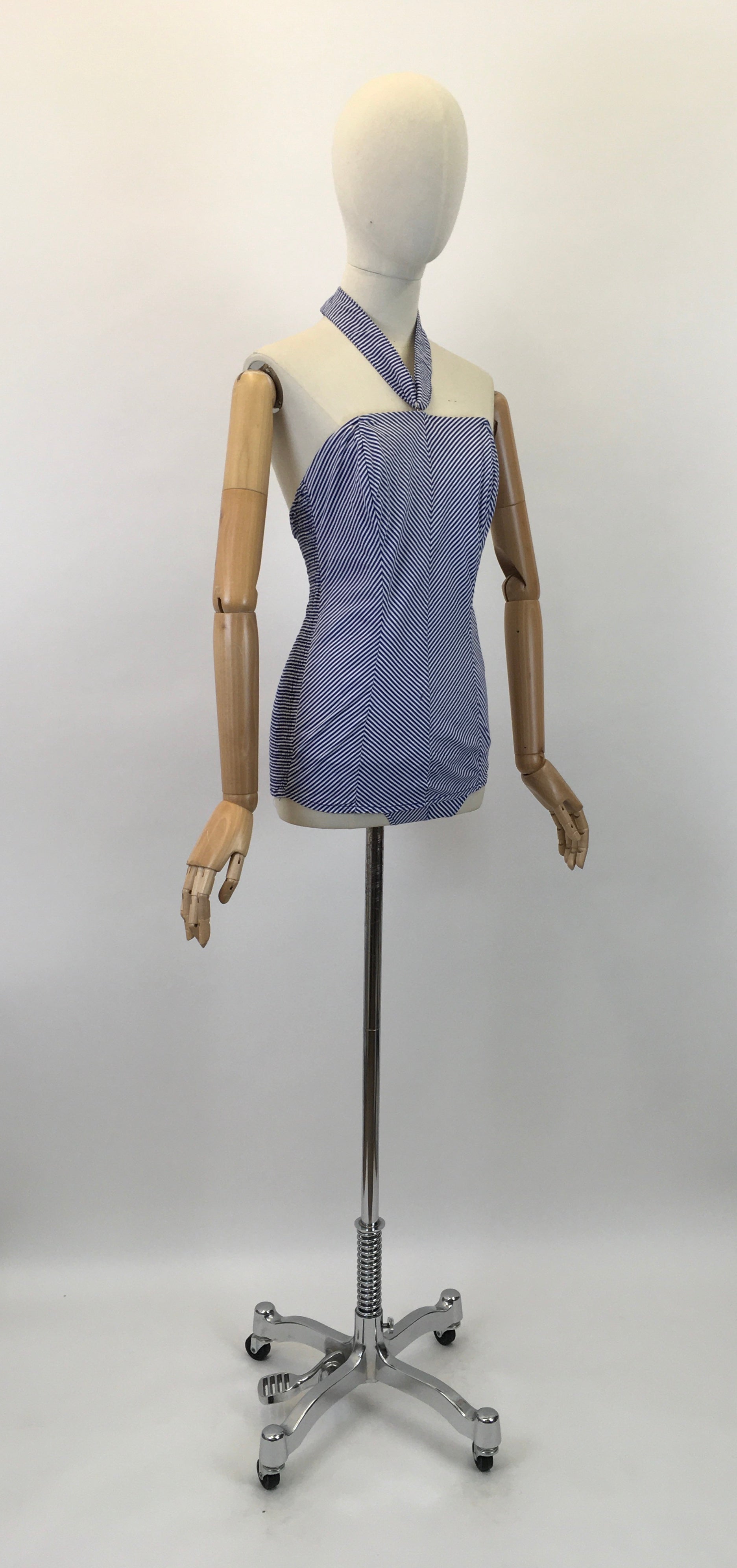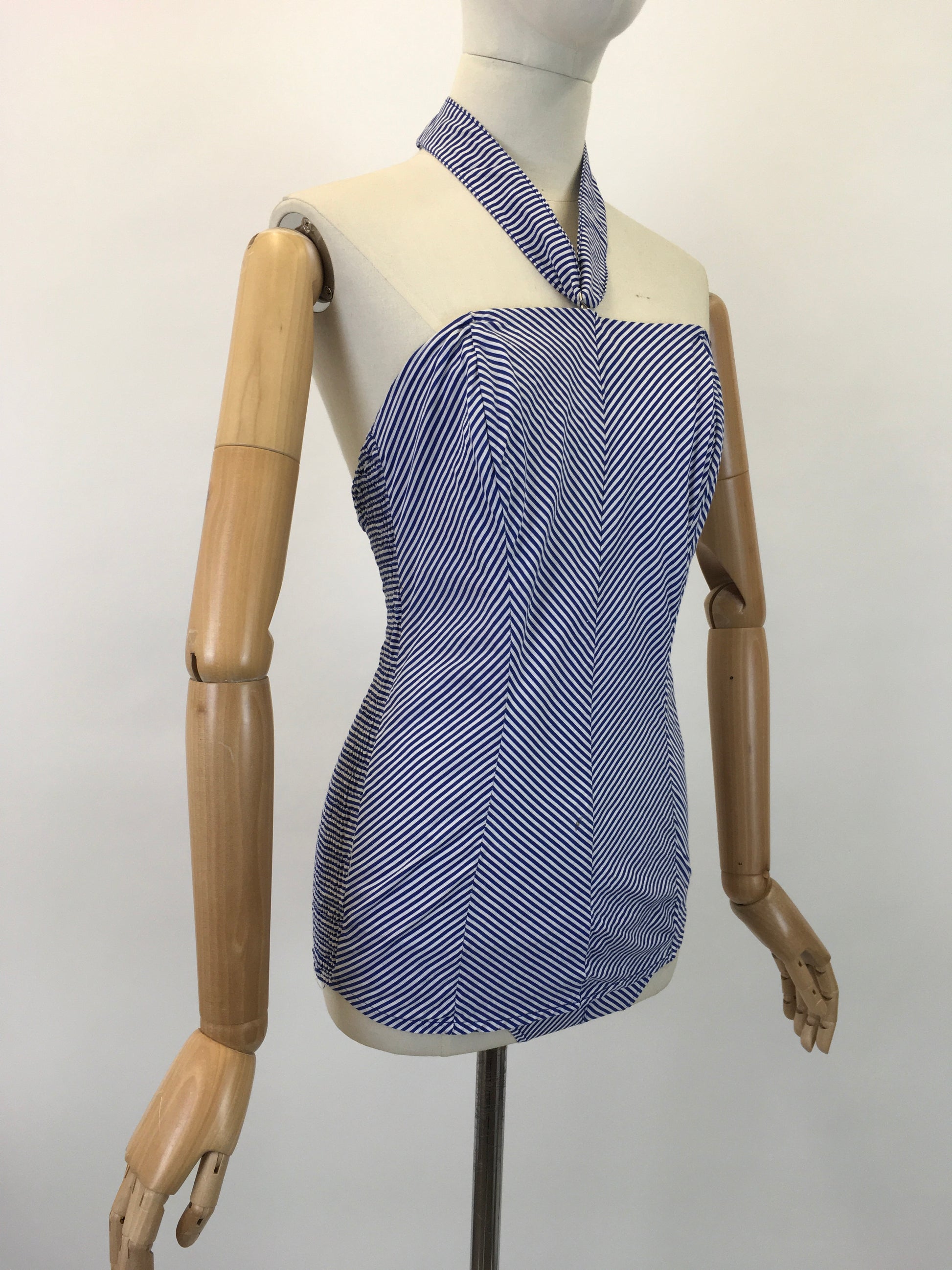 Vintage beautiful 1950's bathing suit in a blue and white stripe. This is made from a beautiful cotton and has boning to the bodice, a full smocked back panel and a lovely halterneck style wrap fastening with chrome detailing. Made by ' Martin White' - British label, this is a lovely example from its time and would be great to wear to lounge around the lido or for a day at the seaside.
