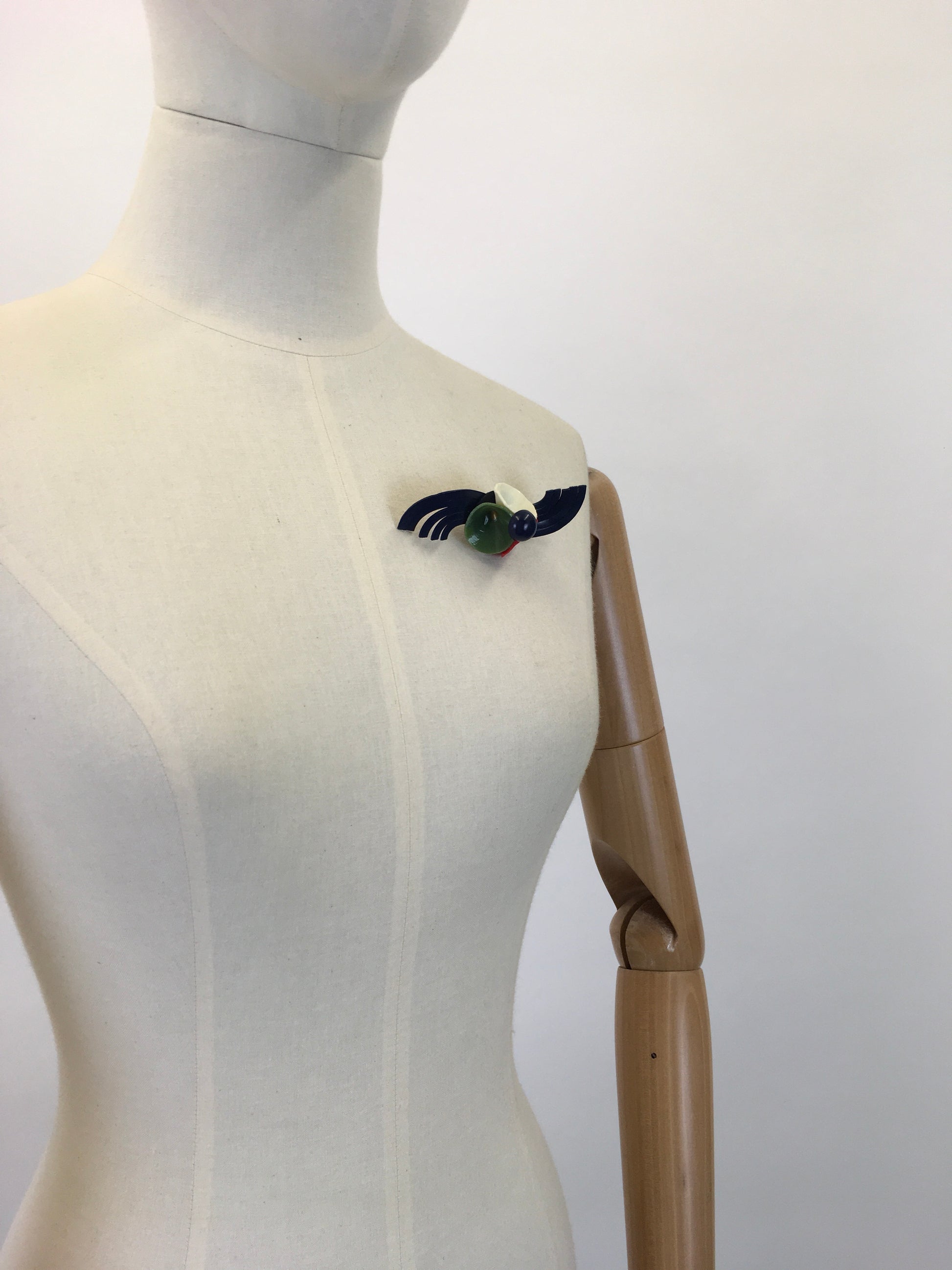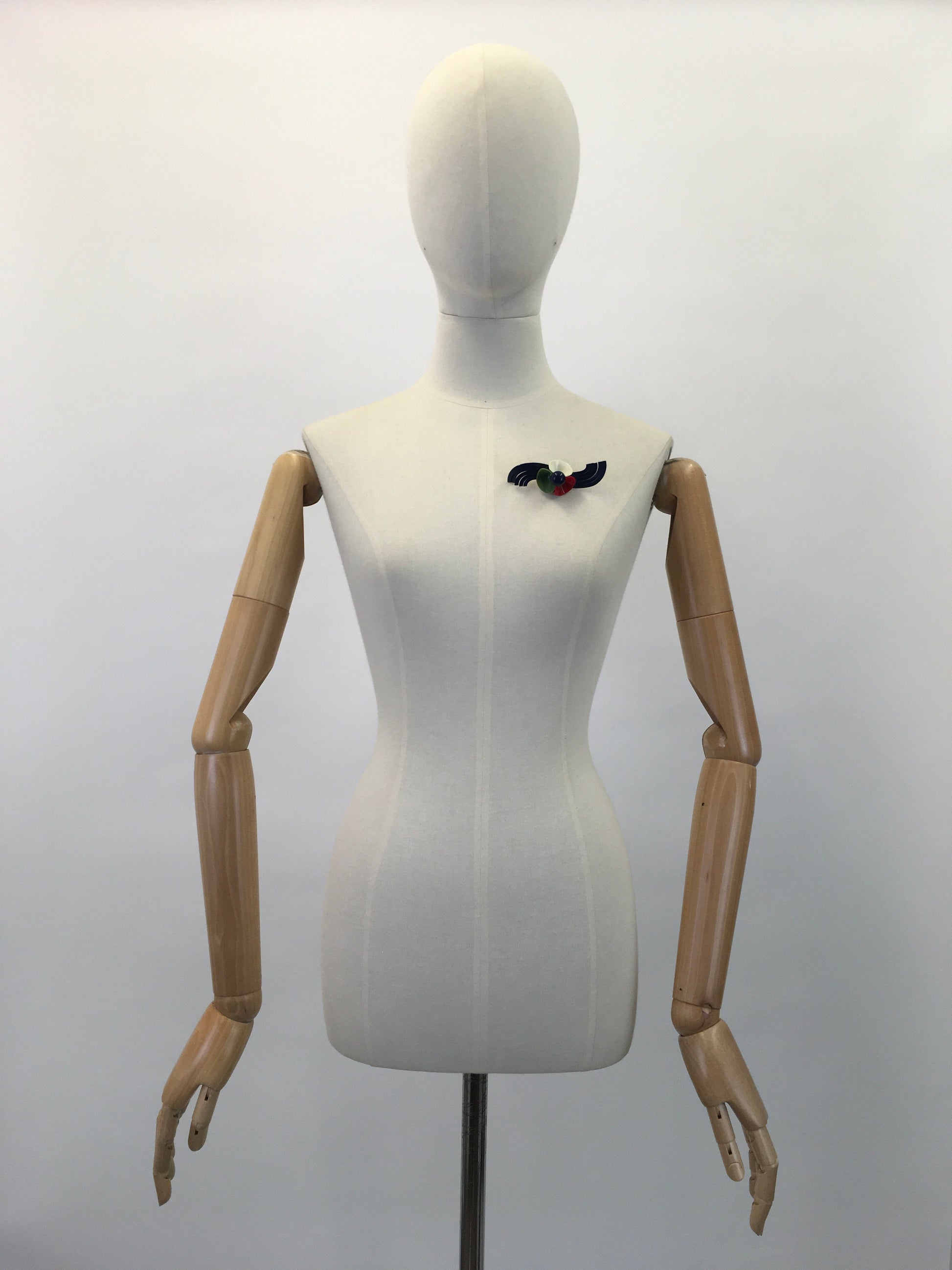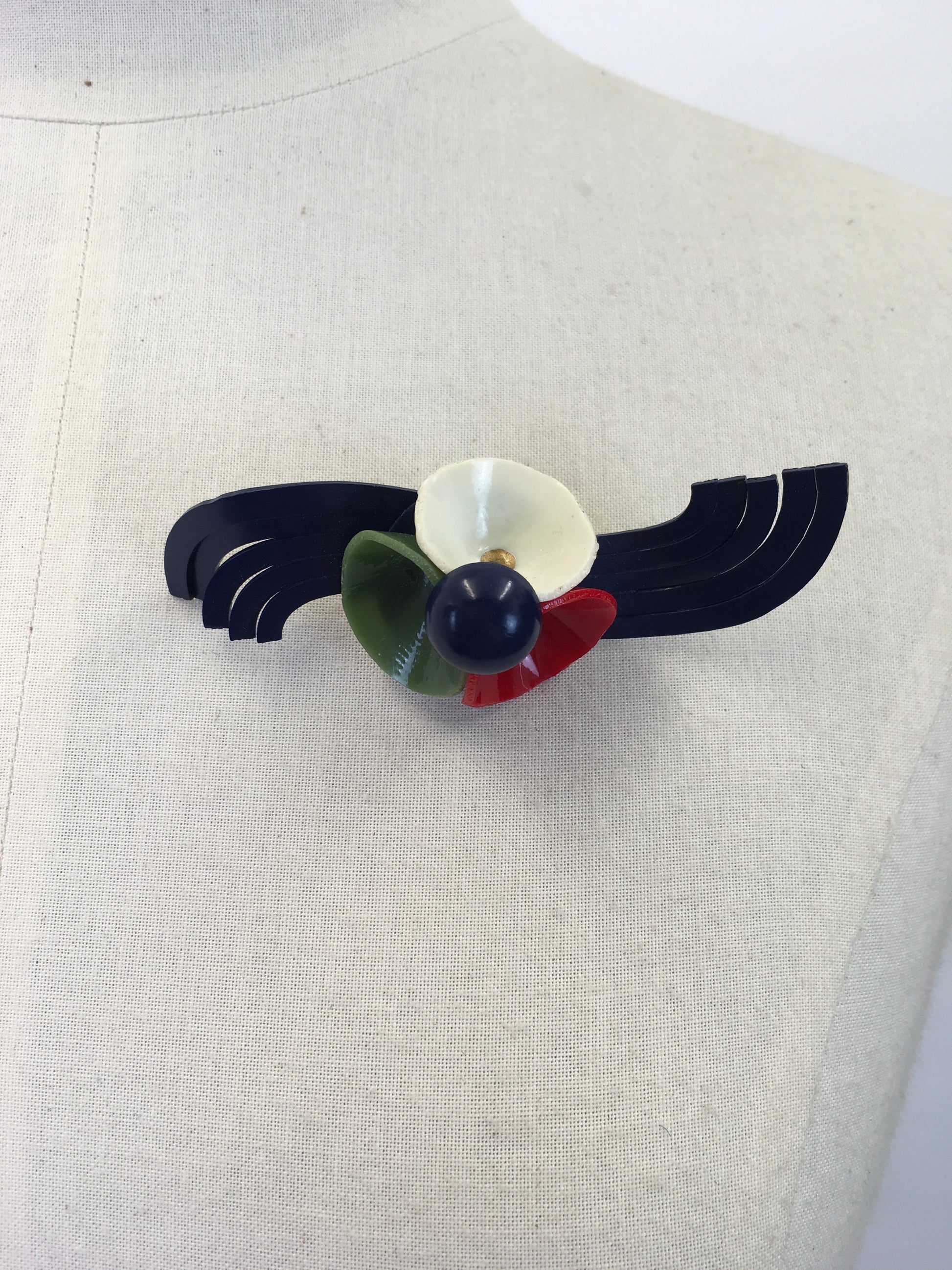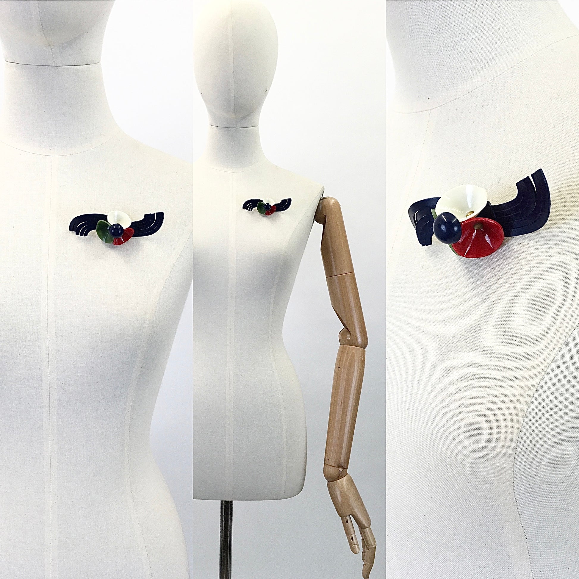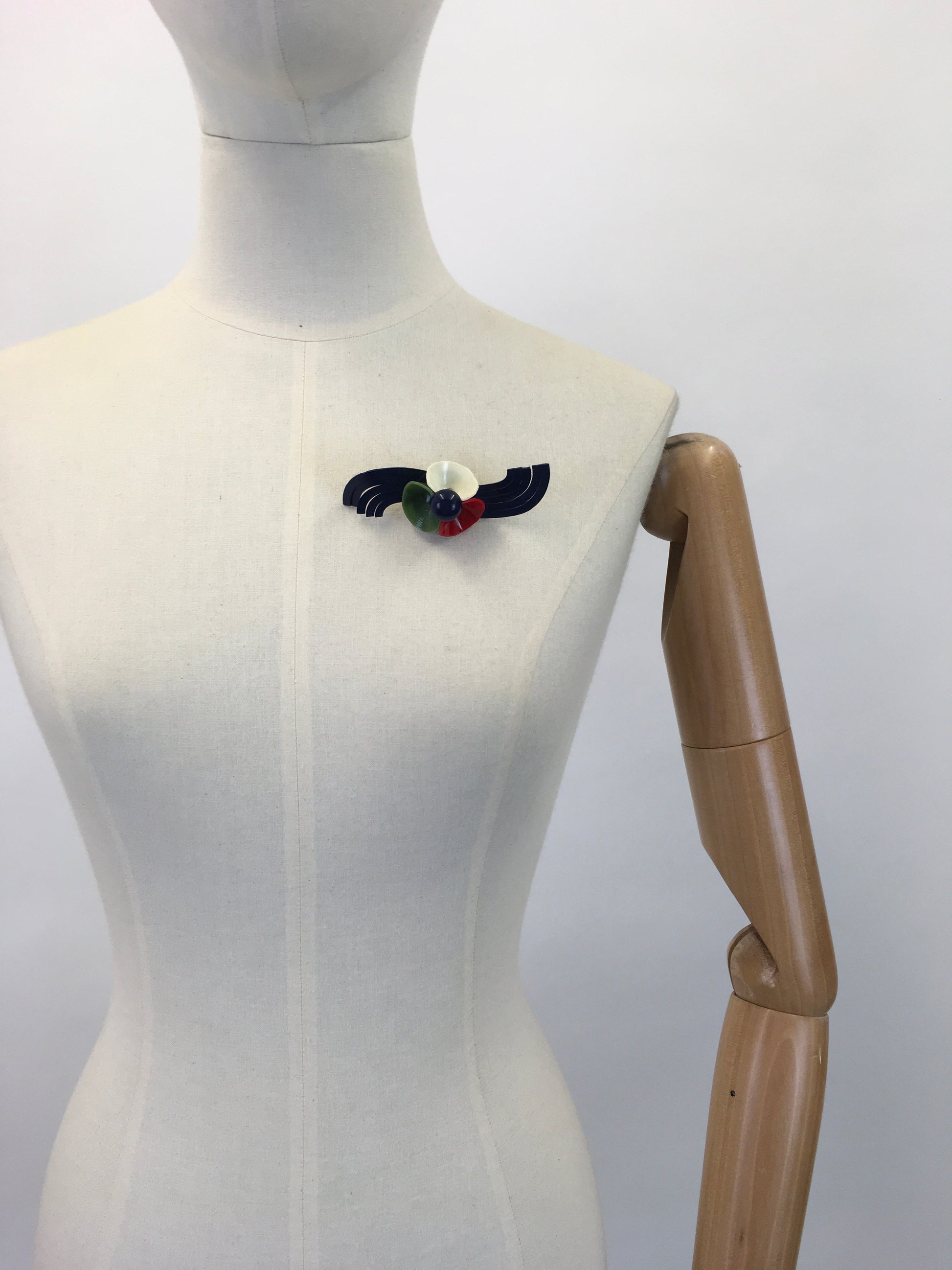 Vintage late 1930's early 1940's celluloid brooch in blue, red, white & green. This is a stunning example of its time and has such fantastic detailing. It features an almost s shaping with cutouts and a floral mid centre posy in a lovely colour pallet, popular of its time. This is a beautiful piece for any vintage wearer or collector and at a large size creates a great statement on the lapel of a Jacket, Coat or Suit.