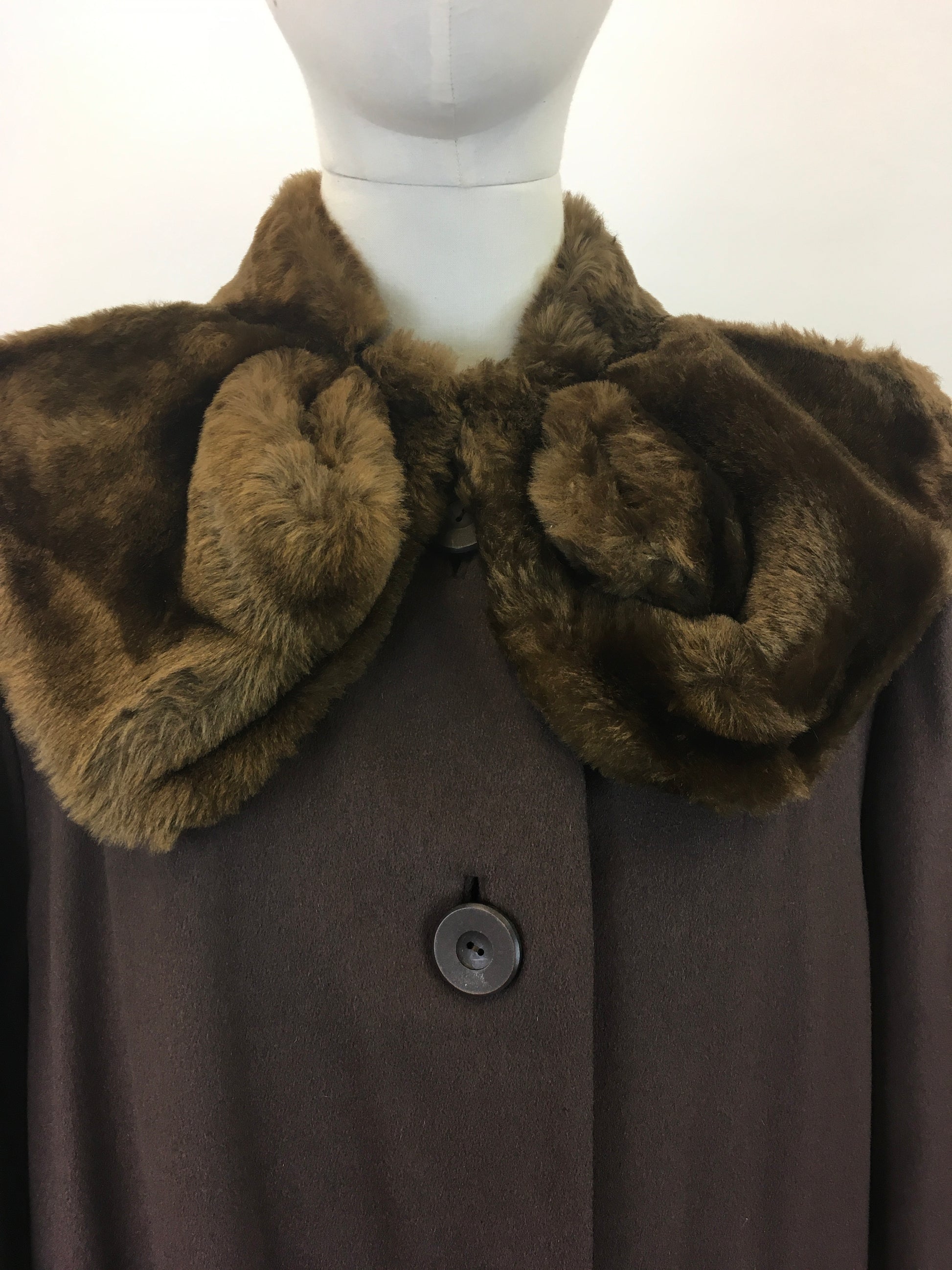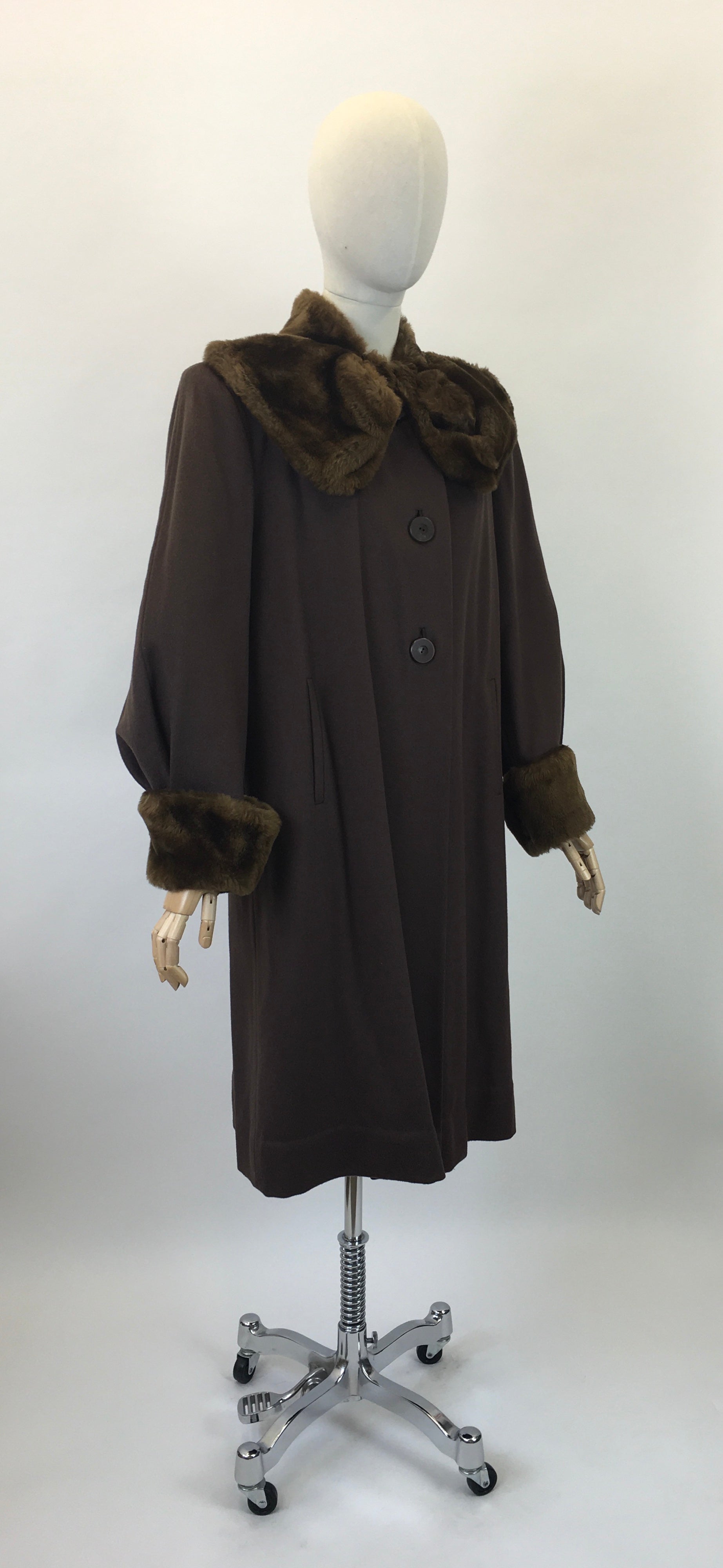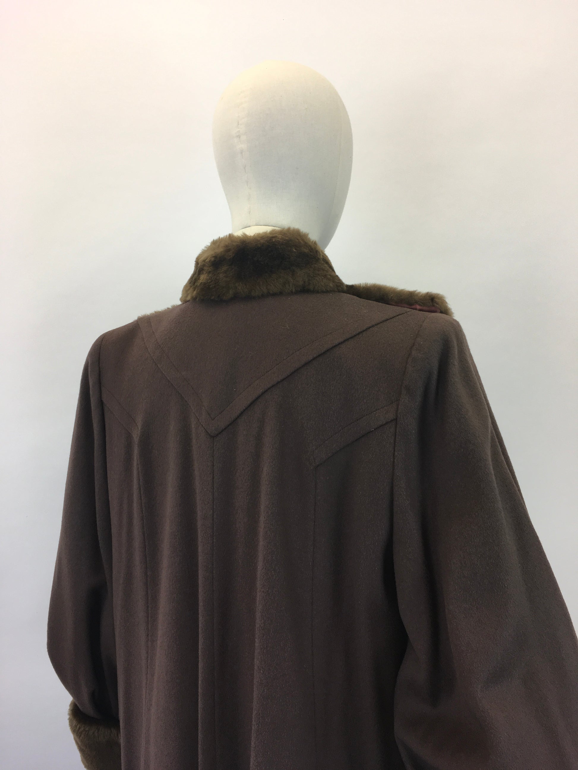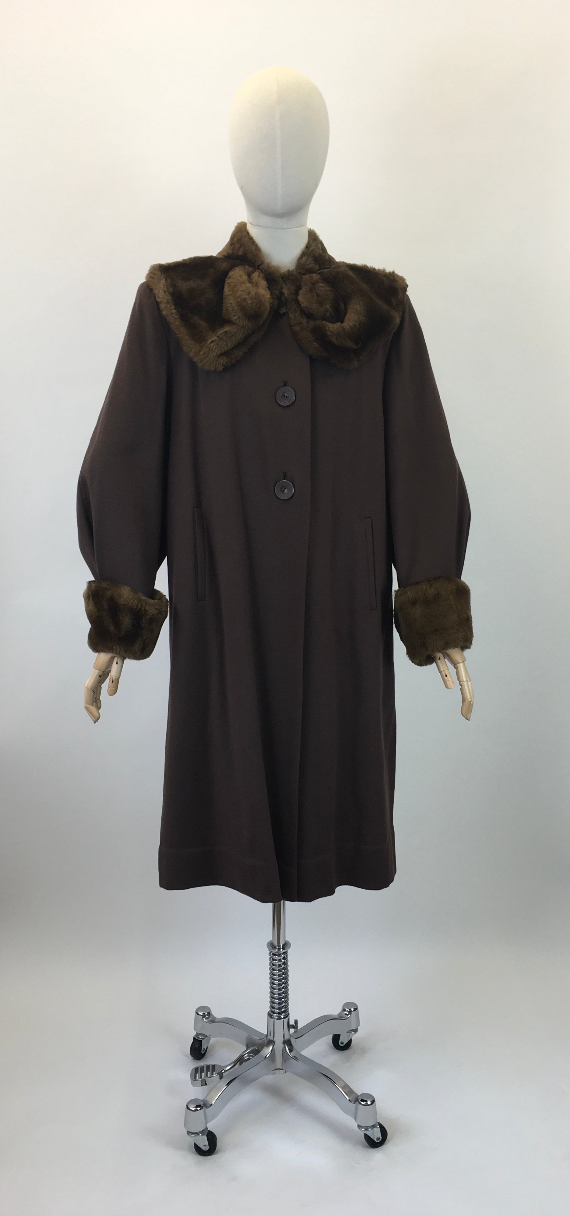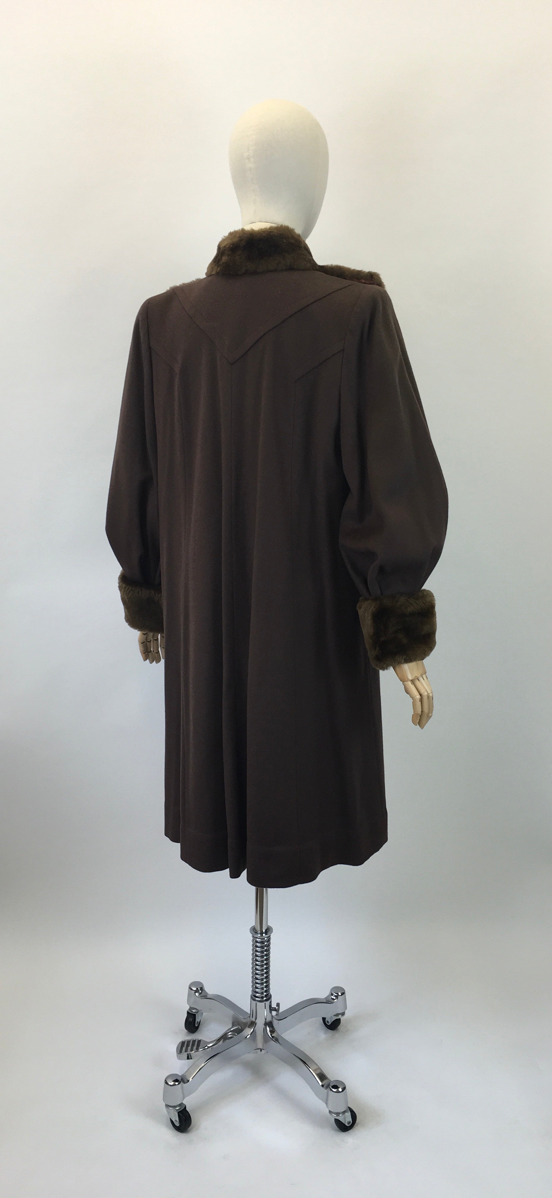 Vintage late 1930's early 1940's wool coat with fur trim details. This is a stunning example from the period and has the most iconic silhouette from the era. It is made from a divine brown heavy wool and is trimmed with a fur collar and cuffs. It has an exquisite balloon sleeve and has a fully quilted lining. It fastens to the front with 3 buttons and has a hook and eye clip to bring the collar together. It also has pockets. To the back the coat has exquisite yoke stitched detailing. This is a beautiful piece which looks equally as nice worn open draped over the top of suits or dresses.