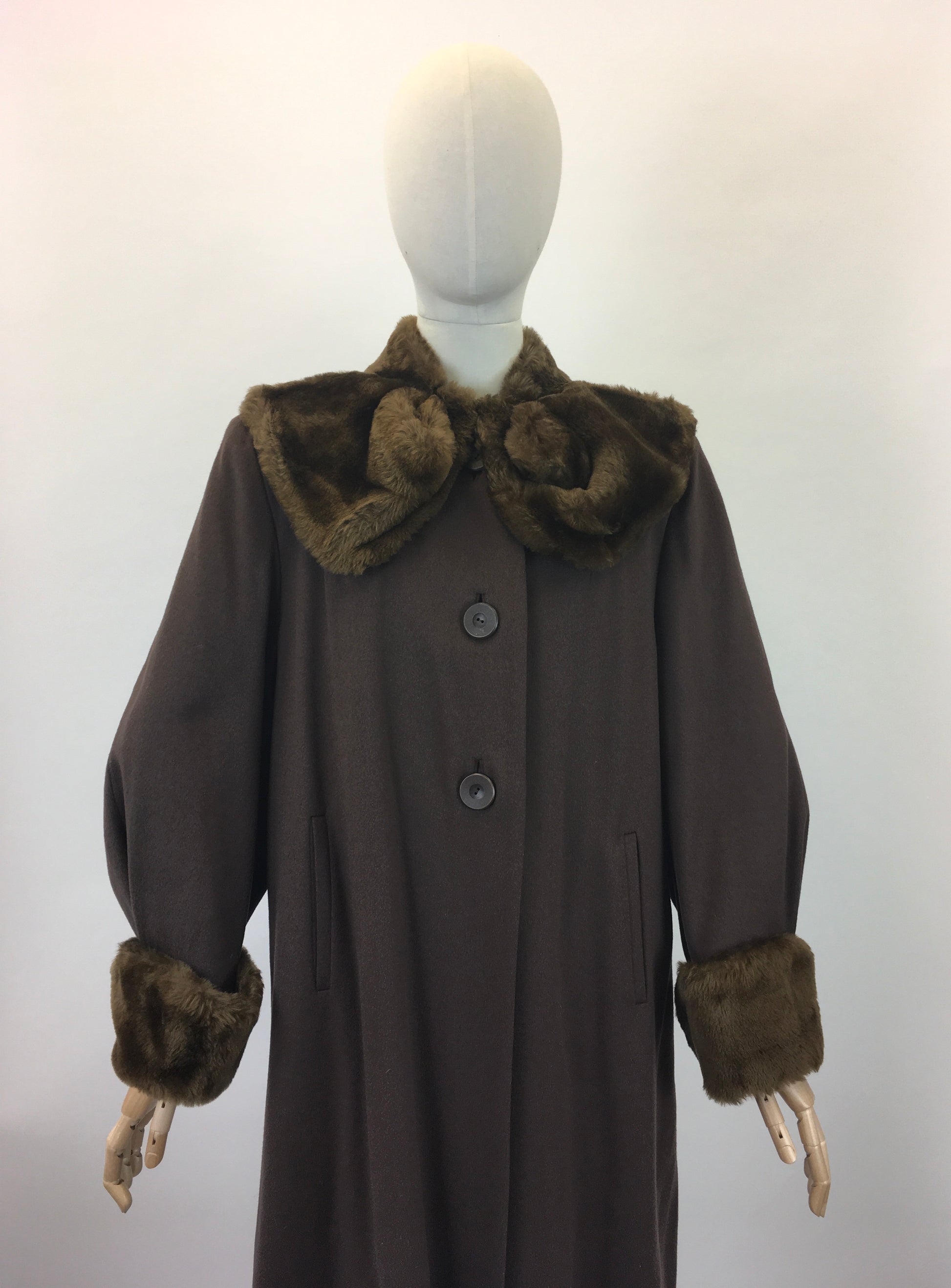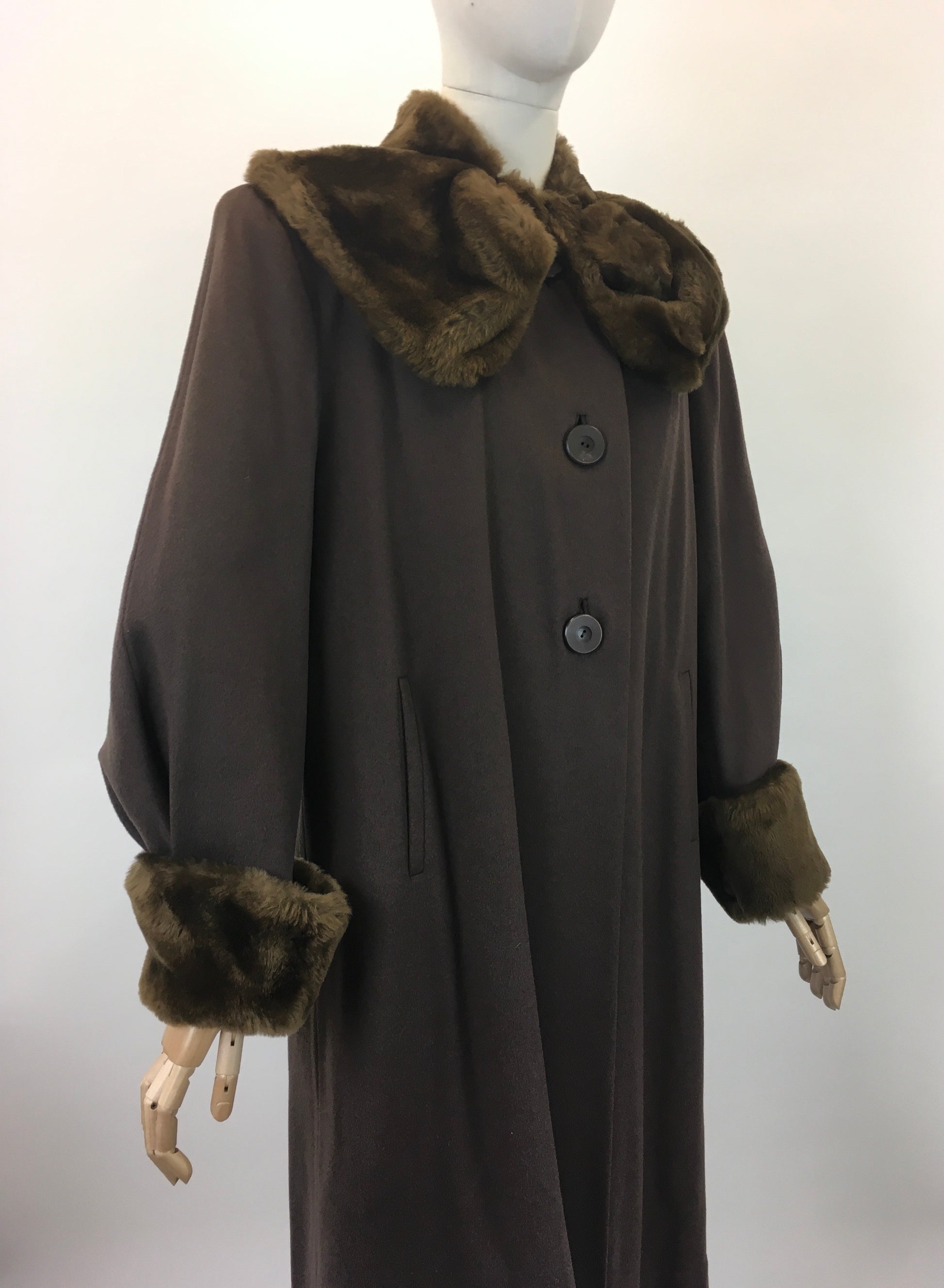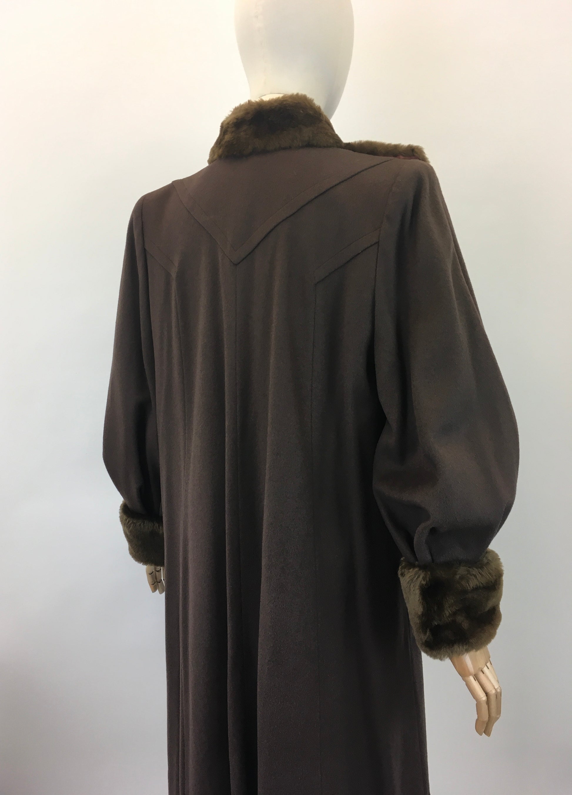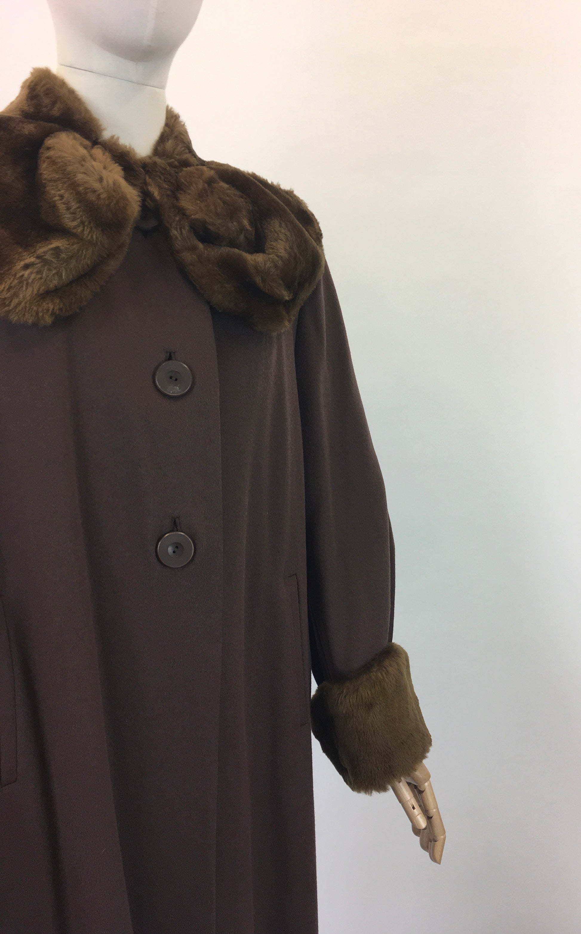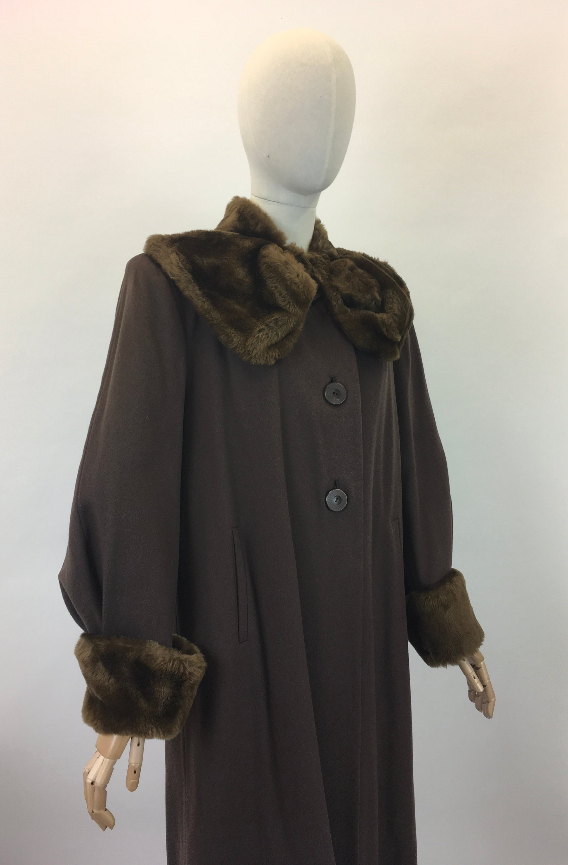 Vintage late 1930's early 1940's wool coat with fur trim details. This is a stunning example from the period and has the most iconic silhouette from the era. It is made from a divine brown heavy wool and is trimmed with a fur collar and cuffs. It has an exquisite balloon sleeve and has a fully quilted lining. It fastens to the front with 3 buttons and has a hook and eye clip to bring the collar together. It also has pockets. To the back the coat has exquisite yoke stitched detailing. This is a beautiful piece which looks equally as nice worn open draped over the top of suits or dresses.
