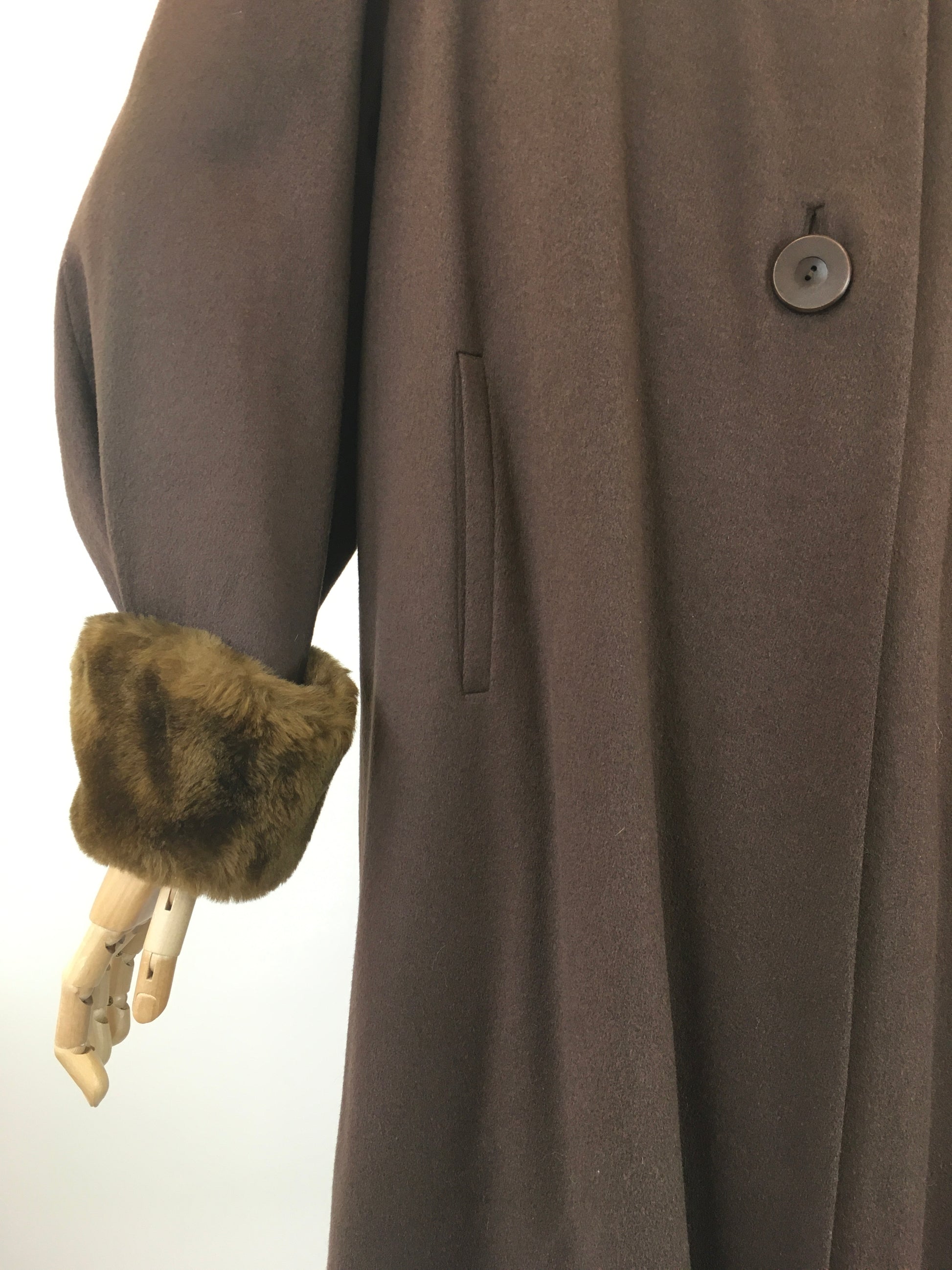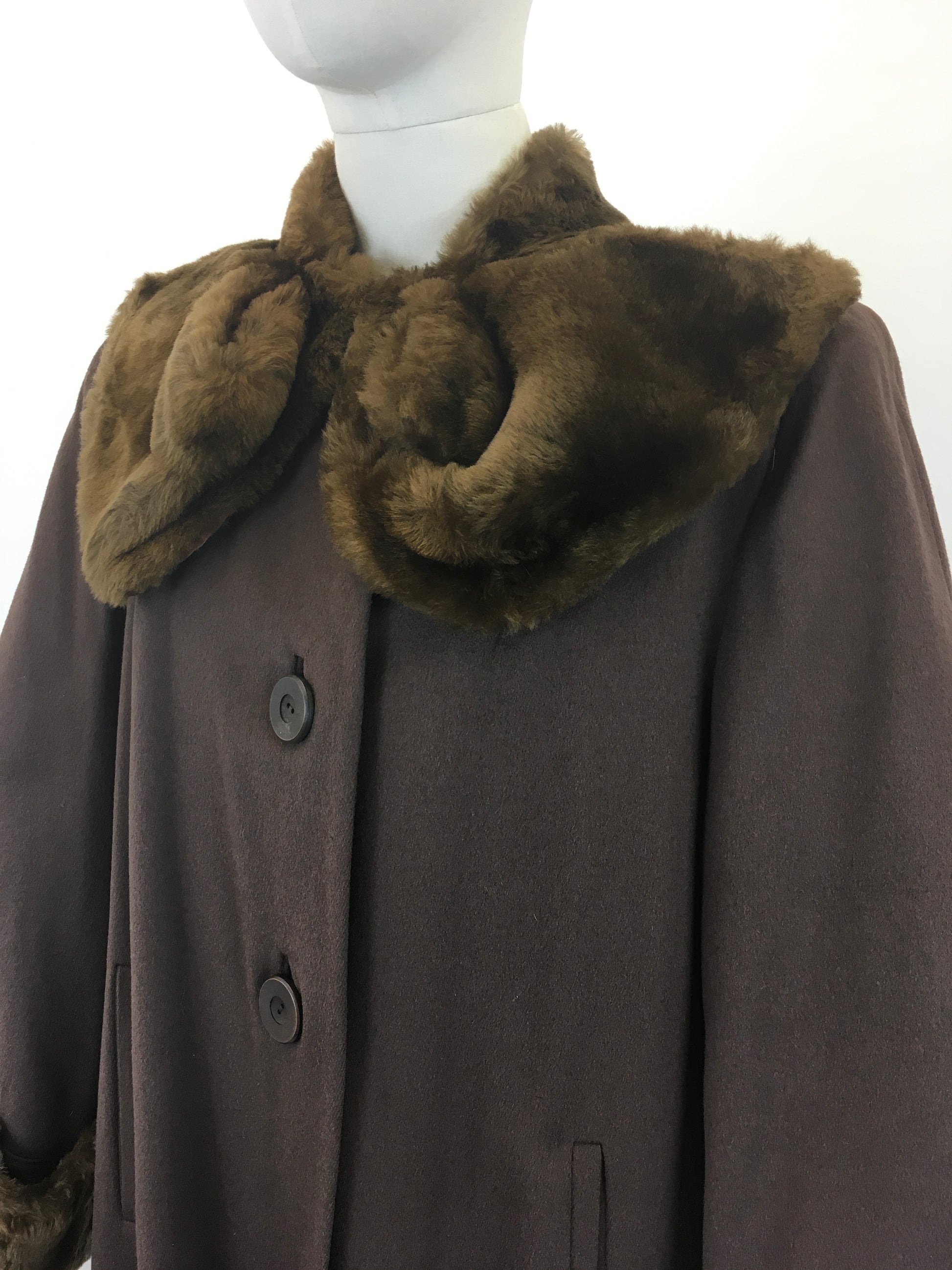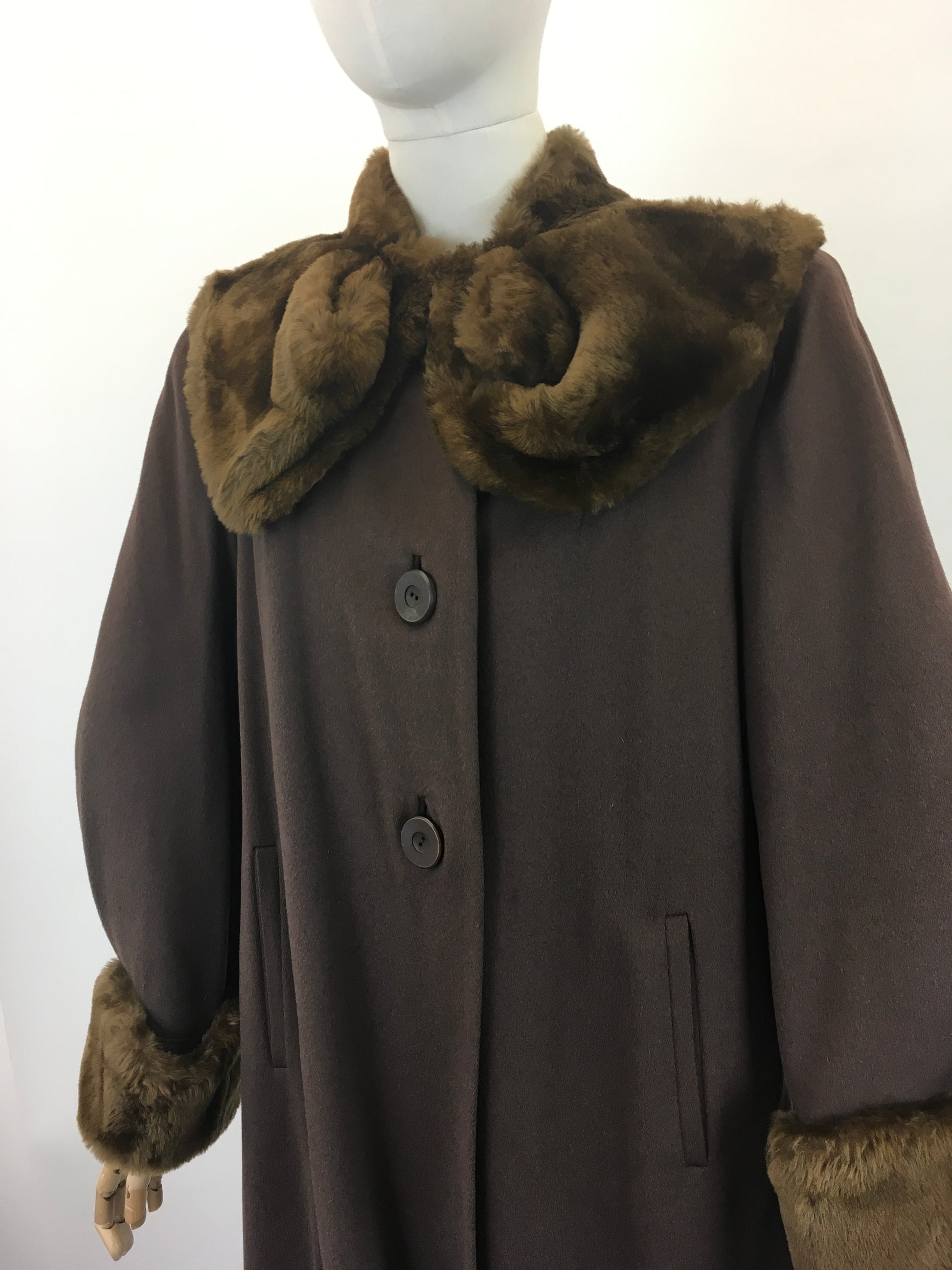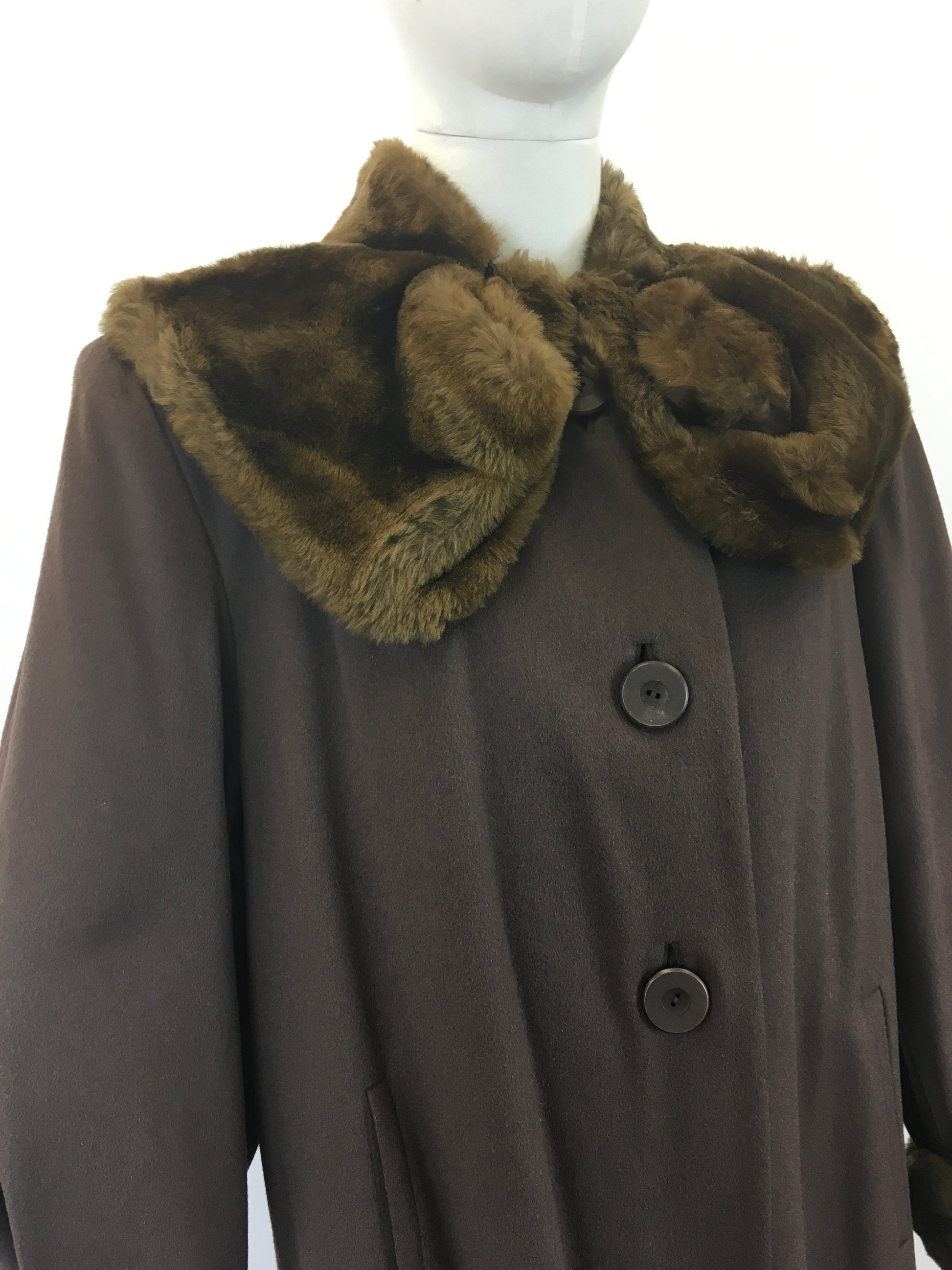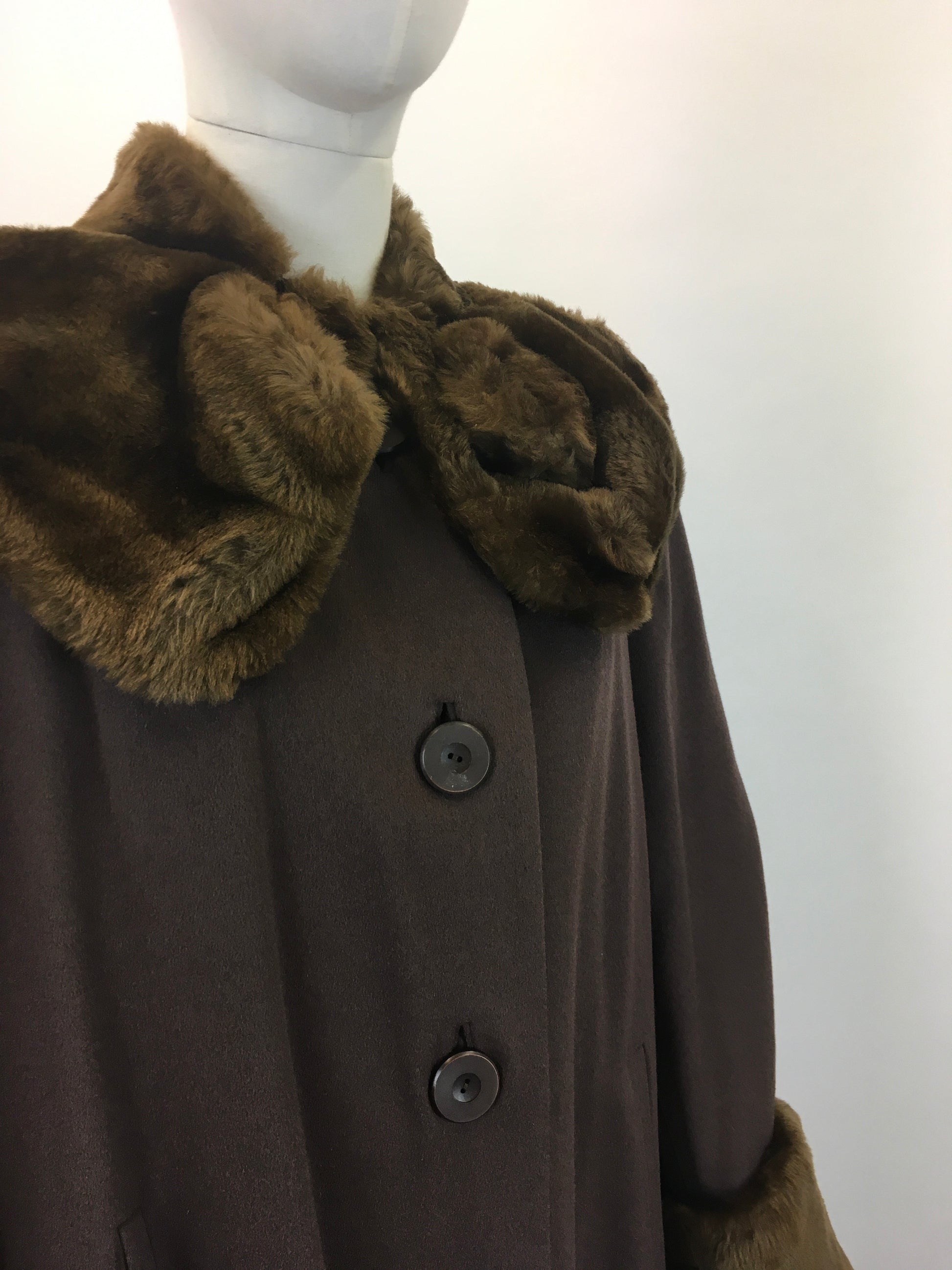 Vintage late 1930's early 1940's wool coat with fur trim details. This is a stunning example from the period and has the most iconic silhouette from the era. It is made from a divine brown heavy wool and is trimmed with a fur collar and cuffs. It has an exquisite balloon sleeve and has a fully quilted lining. It fastens to the front with 3 buttons and has a hook and eye clip to bring the collar together. It also has pockets. To the back the coat has exquisite yoke stitched detailing. This is a beautiful piece which looks equally as nice worn open draped over the top of suits or dresses.
