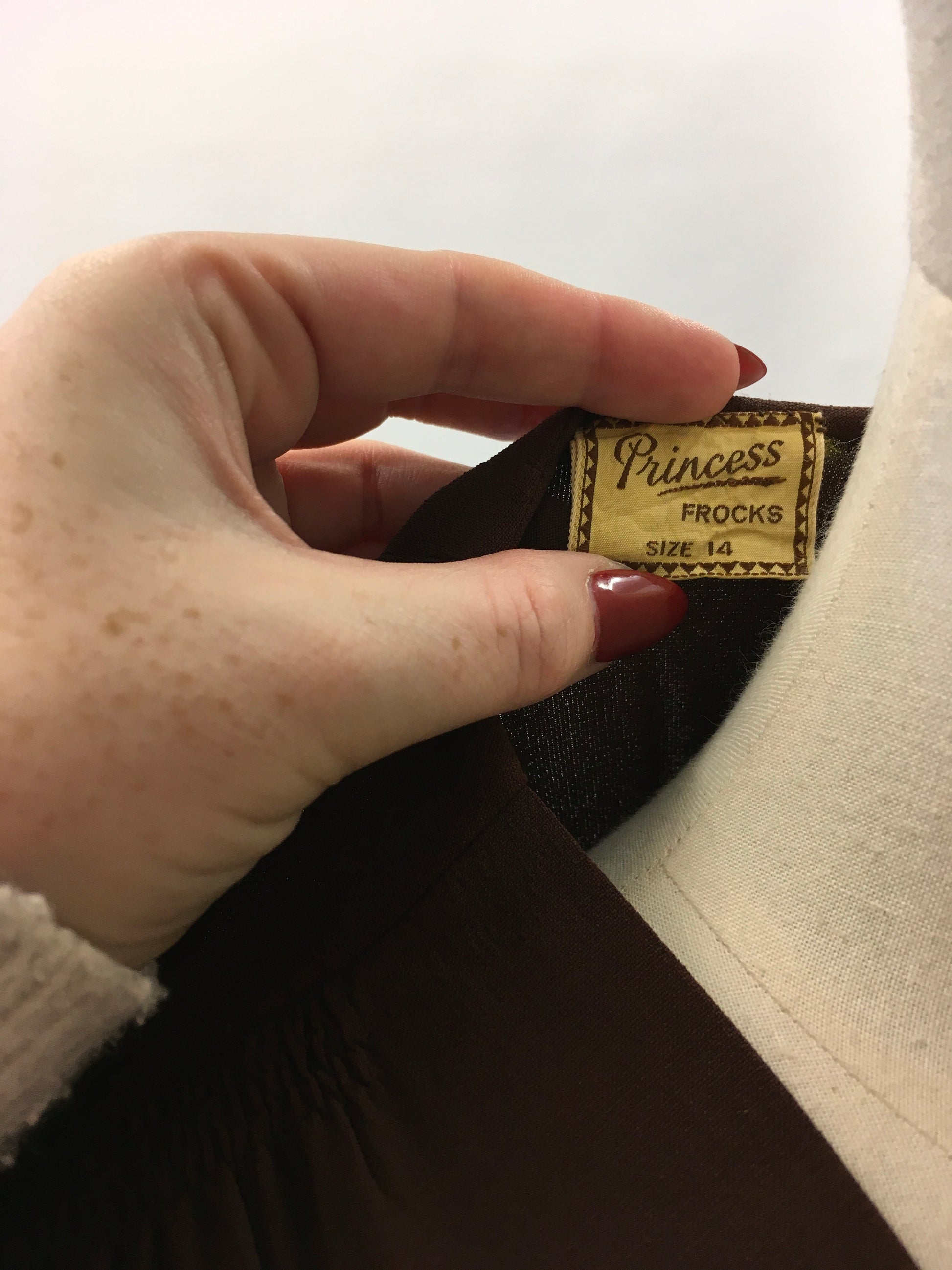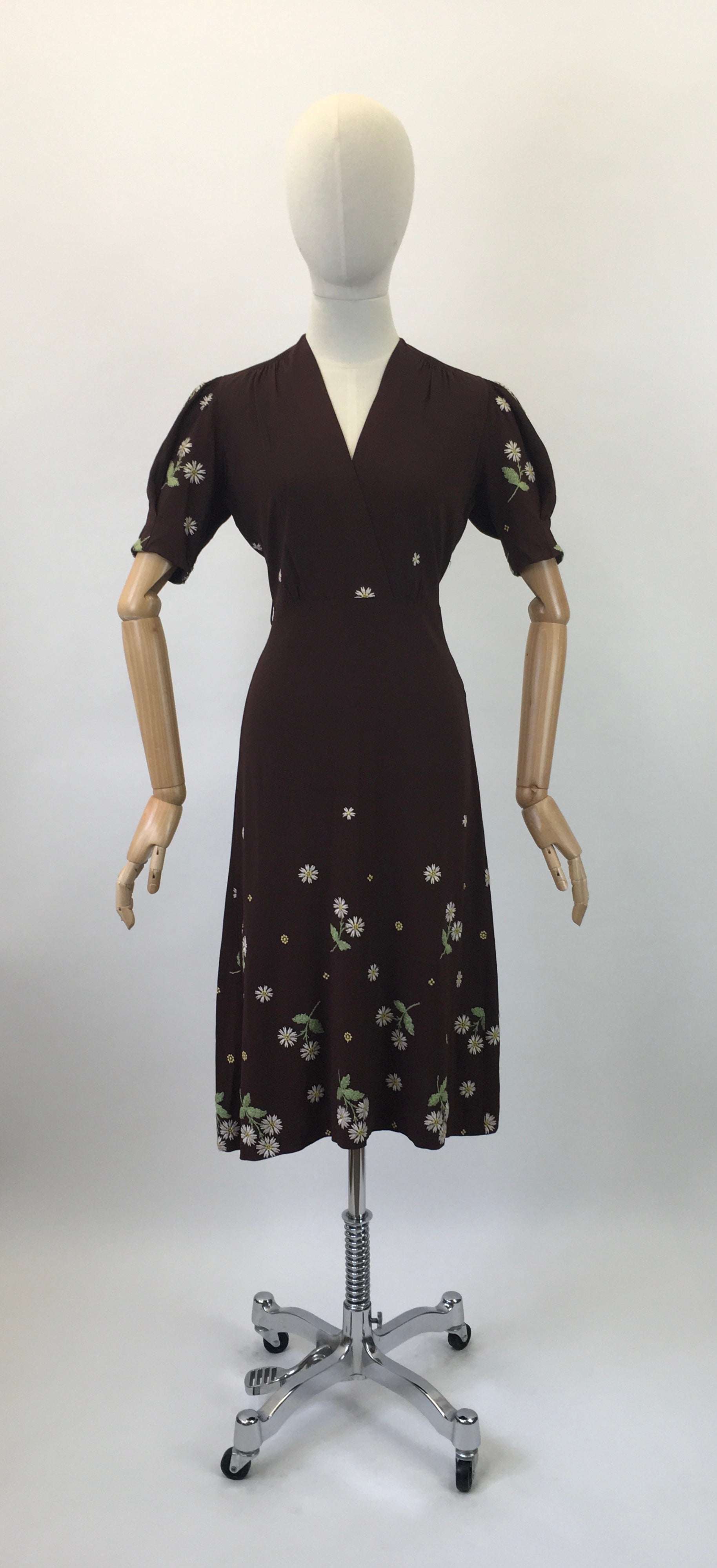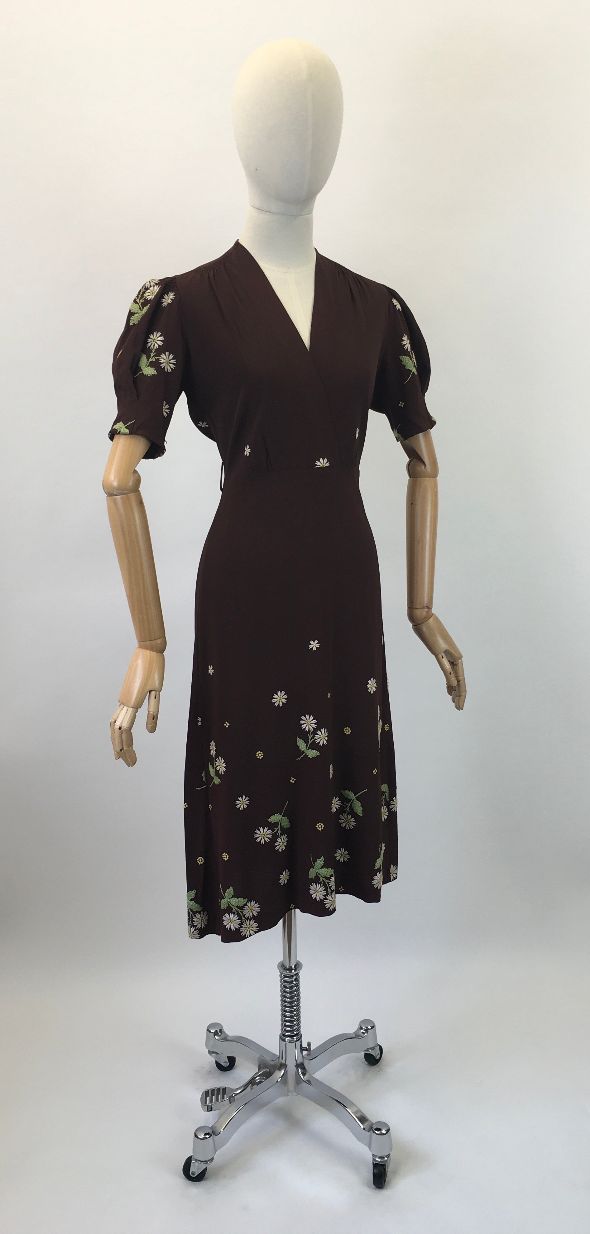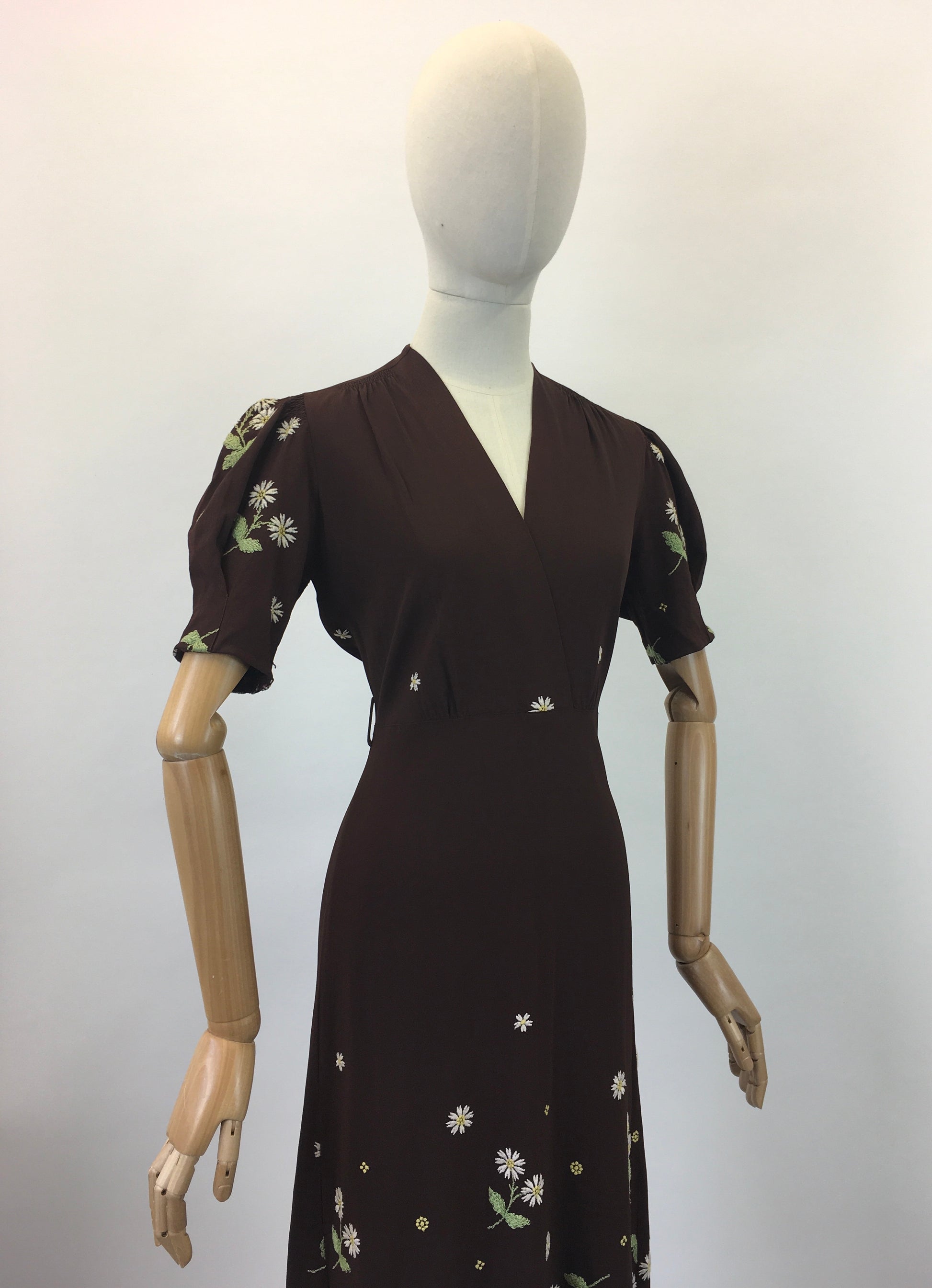 Vintage sensational late 1930's early 1940's ' Princess Frocks' Dress in a warm brown with embroidery in sunshine yellow and grassy green. This piece has a beautiful silhouette and stunning details very typical of the era and evokes the times gone by. It has been made by ' Princess Frocks' and features their wonderful label to the nape of the neck. It has a crossover front bodice detailing, short sleeves with ruched and pleated details which enhance the shaping. To the skirt the rayon crepe has been adorned with embroidered floral and leaf details in sunshine yellow and grassy green. It fastens with poppers to the side. Has belt loops but missing original belt so it could be worn with a contrast piece to co ordinate with accessories.
