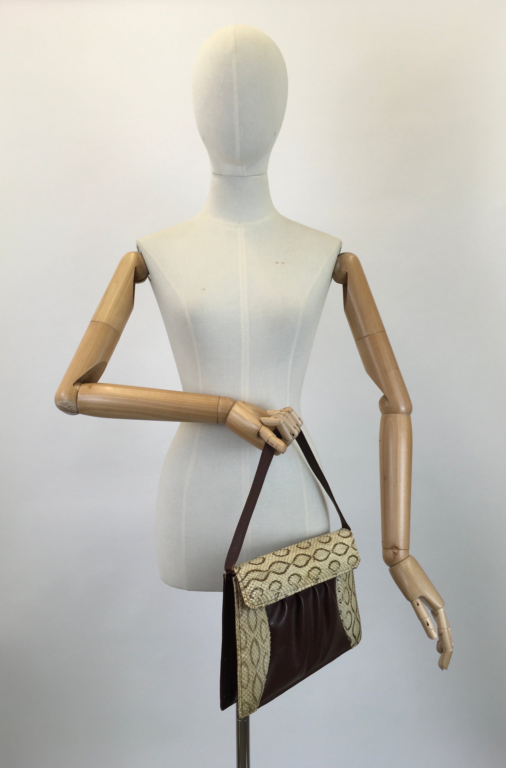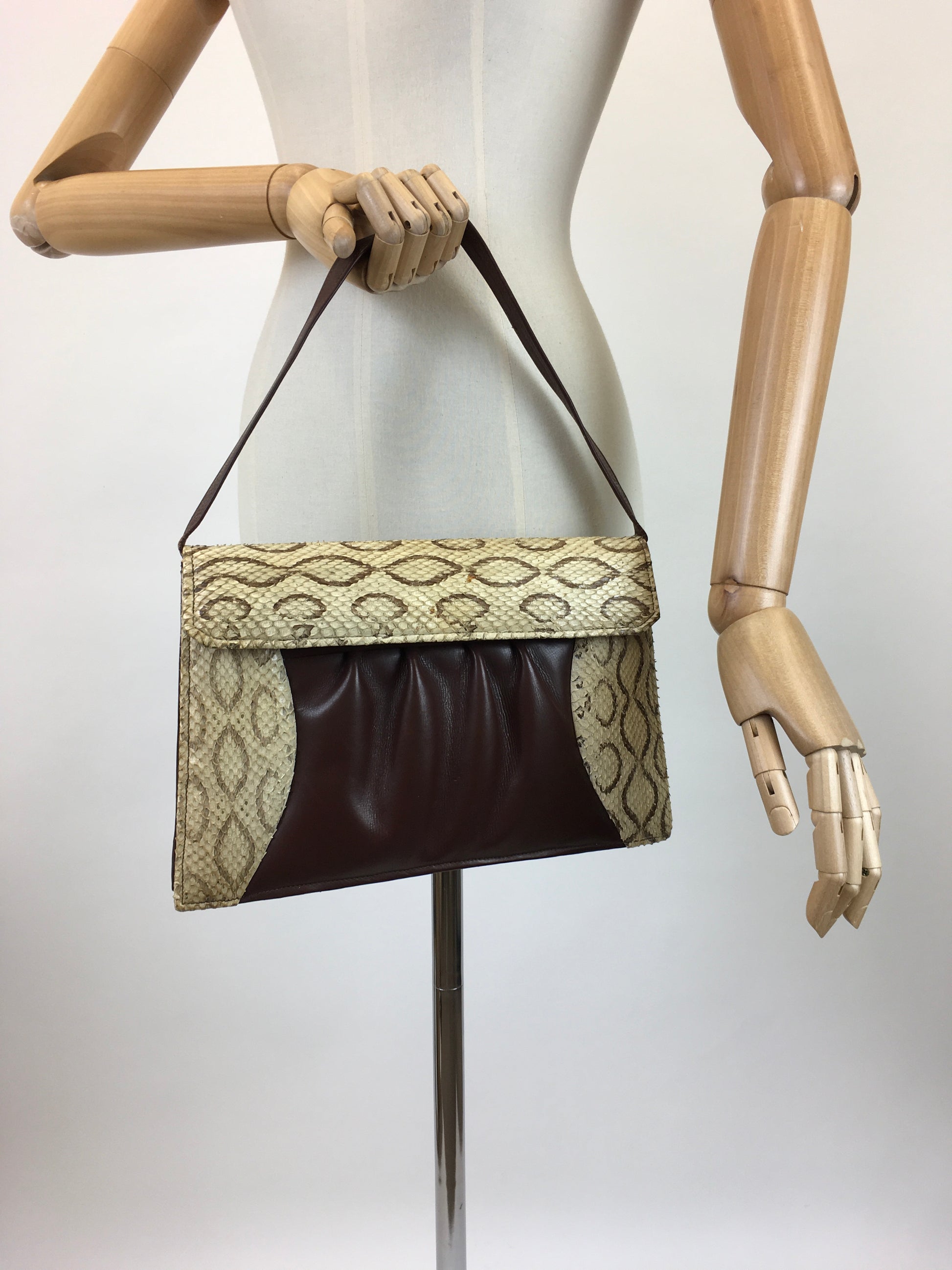 Vintage 1940's darling snakeskin and leather handbag with lovely details. This is a beautiful example and a great size for wearing and using everyday. It fits in all the modern gals mod cons! It features a large compartment, single strap handle and contrast snakeskin and leather outer.