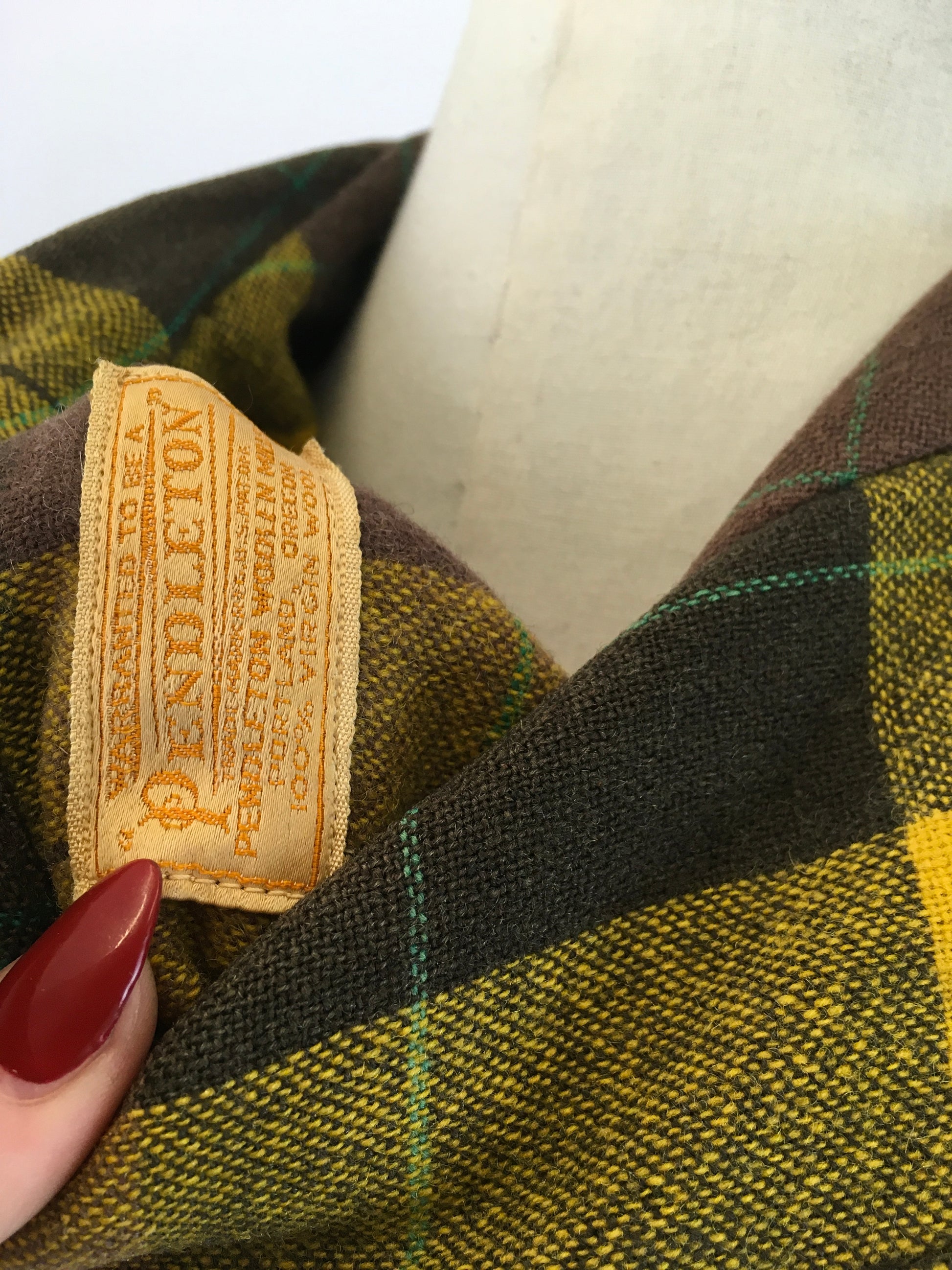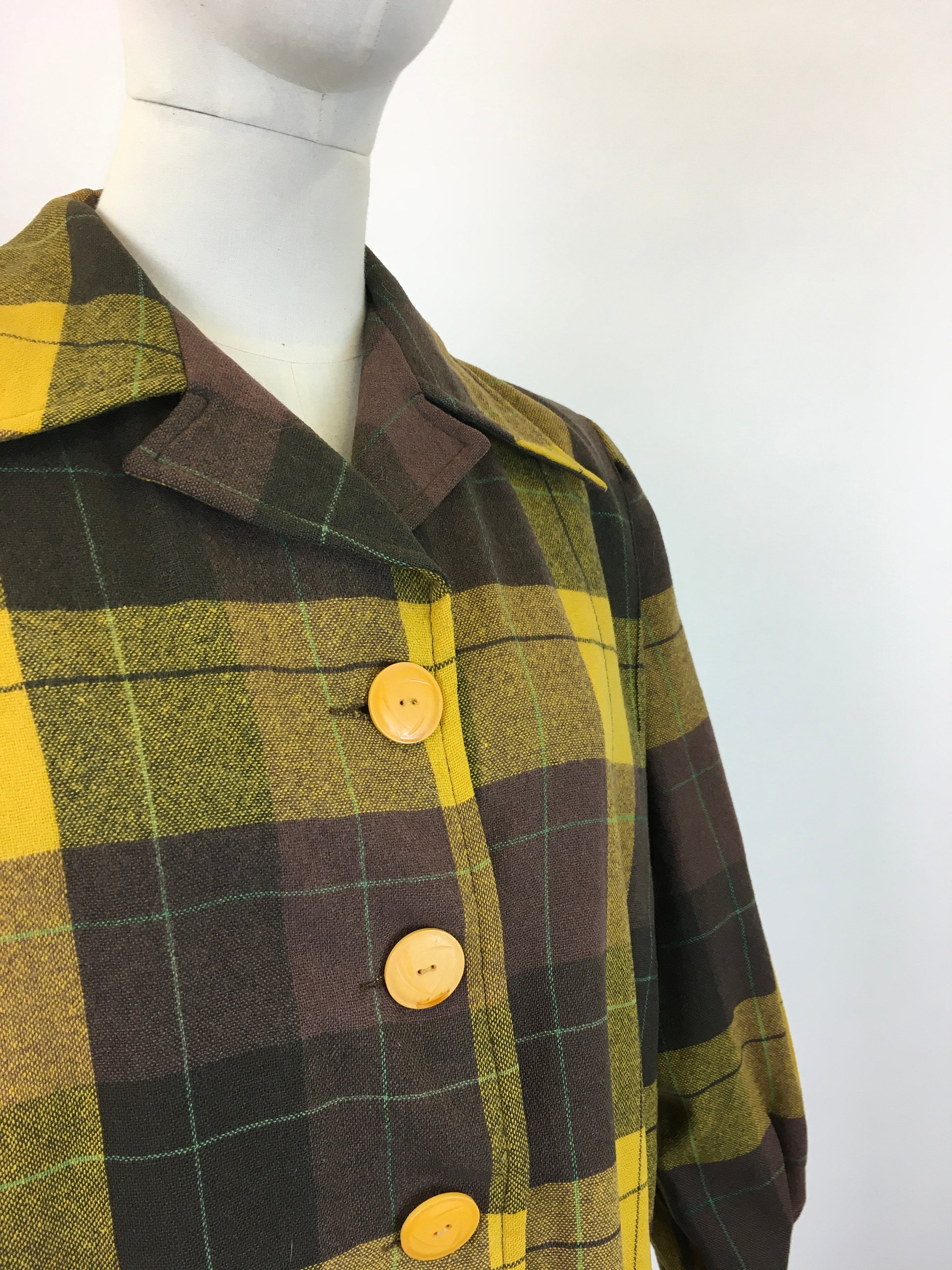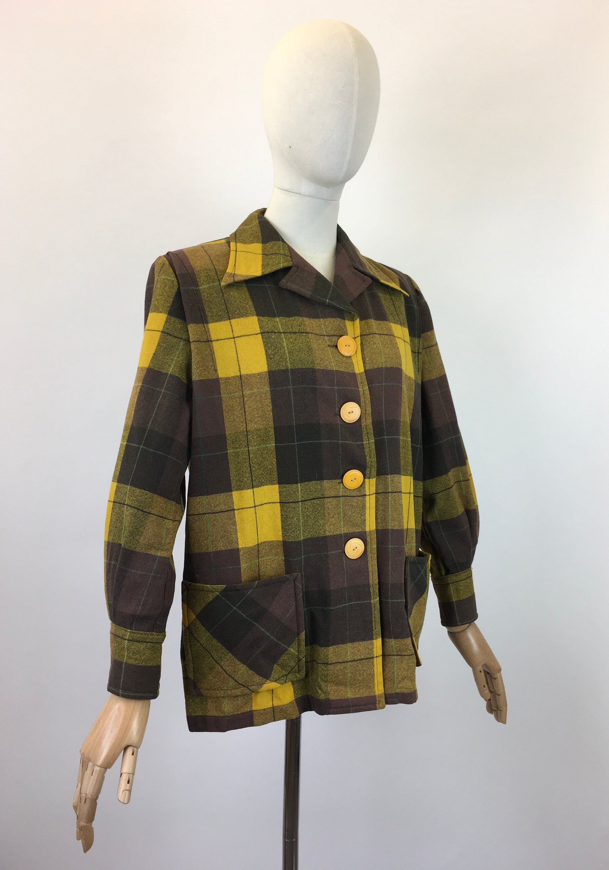 Vintage fabulous 1940's Pendelton Jacket in a warm brown, mustard and bottle green check wool. This piece features a fantastic Pendelton label and has its iconic details. It has a beautiful casual silhouette and features a sharp pointed collar, 4 button front fastening, long sleeve with cuff and button fastening and 2 handy front pockets. This piece looks great worn buttoned up or open over the top of blouses and slacks or knitwear and jeans. A great piece to style casually over the autumn / winter months for an extra layer.