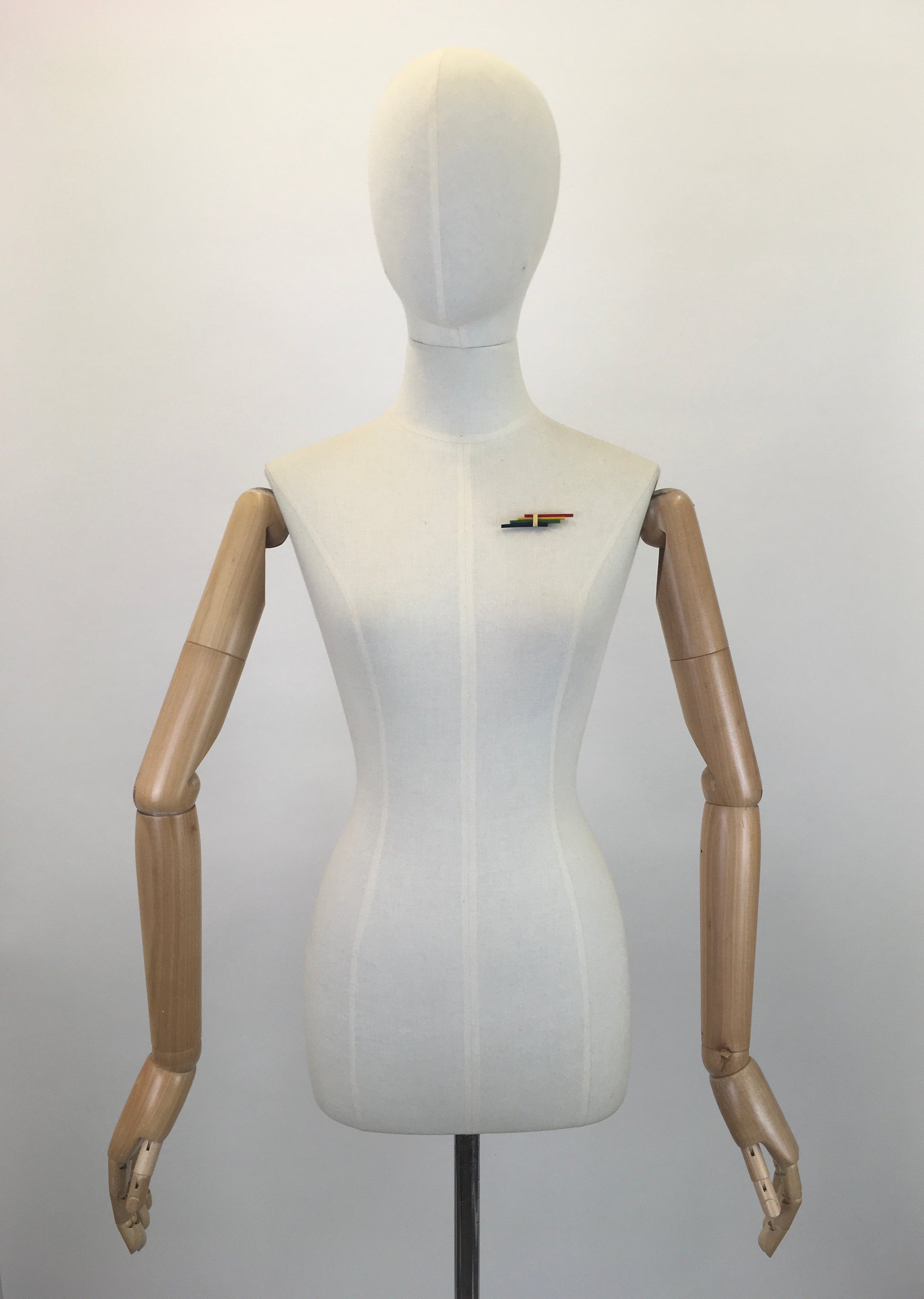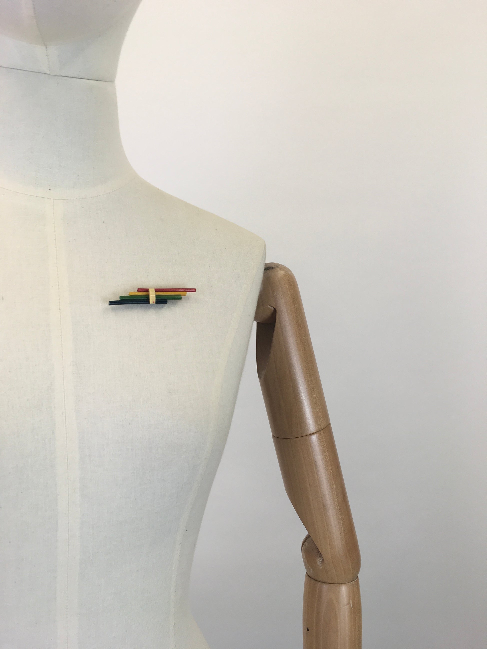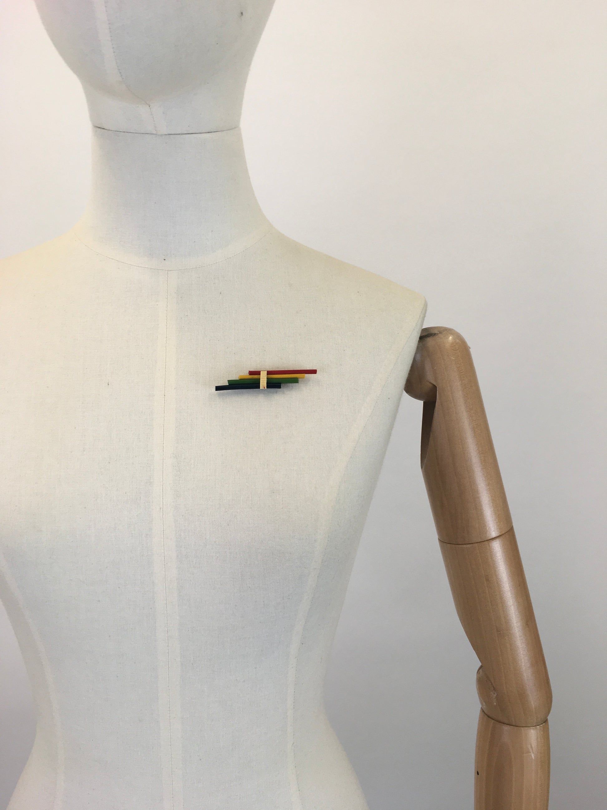 Vintage stunning 1930's celluloid bar brooch in a striking colour pallet of red, yellow, green and blue. A fabulous example from its time this piece is so iconic with its stylised shape and detailing. It measures 6cm by 1cm and is a great staple sat on the lapel of a Jacket, Coat or to add a pop of colour to a dress.