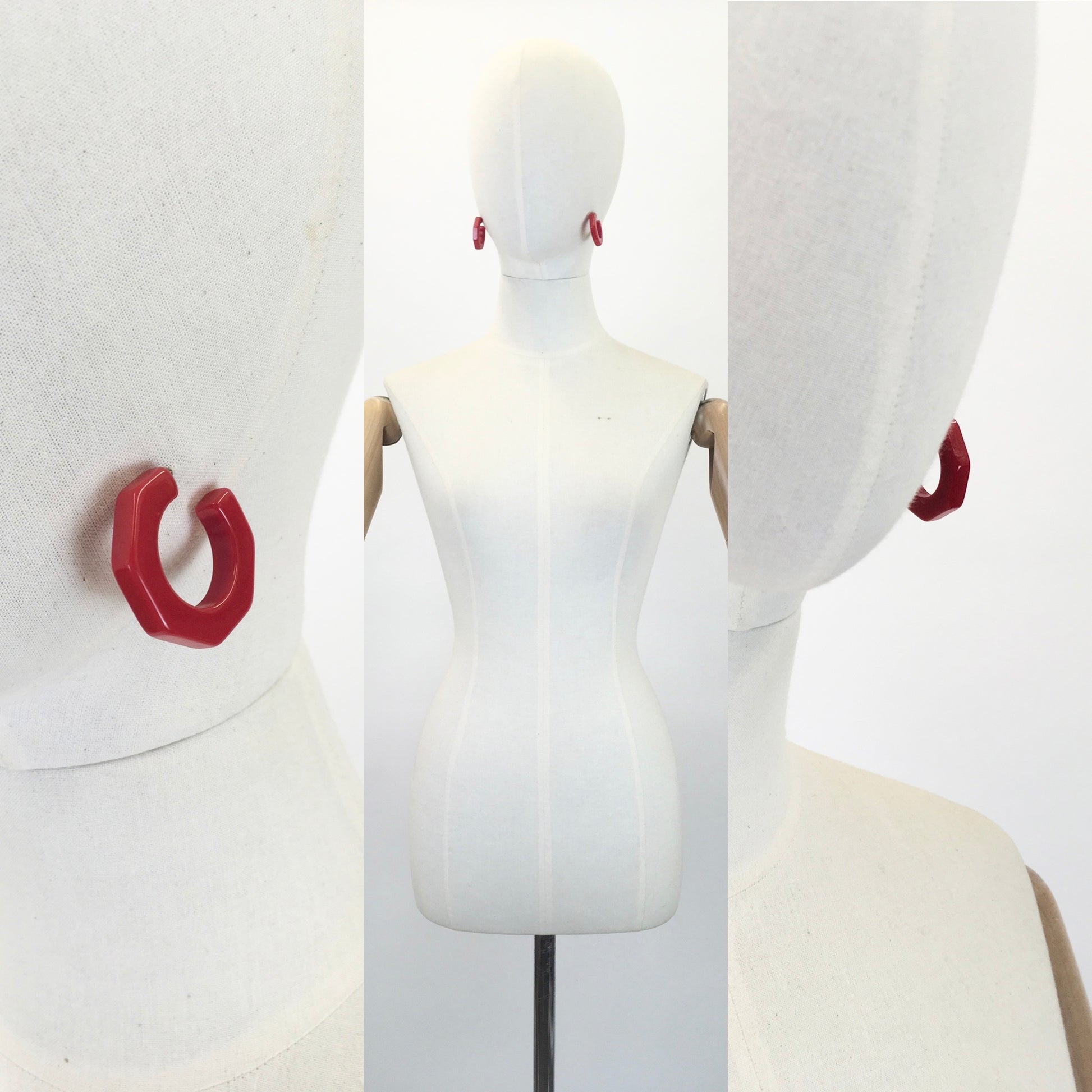 Vintage darling 1950's bakelite earrings in cherry red. These are fabulous pair of earrings in a classic hexagonal shape with butterfly clip back for pierced ears. They are in a beautiful cherry red colourway.