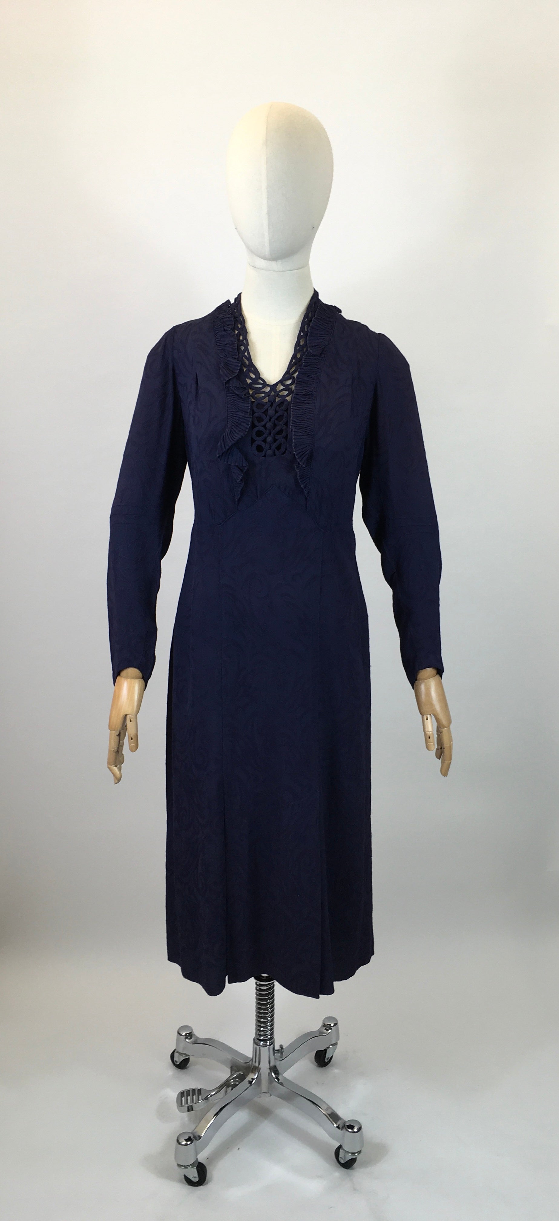 Vintage 1930s Darling Crepe dress in a classical timeless Navy colour. Gorgeous pleated frill to the neckline with an open ribbon effect front panel , adorned with covered buttons. Cut on the bias as were a lot from the 30's era, in a gorgeous crepe with a faint pattern to it. This dress just simply oozes classical style. Can be worn with a slip underneath ( note not supplied ) or a modesty dickie or slightly risqué without anything.