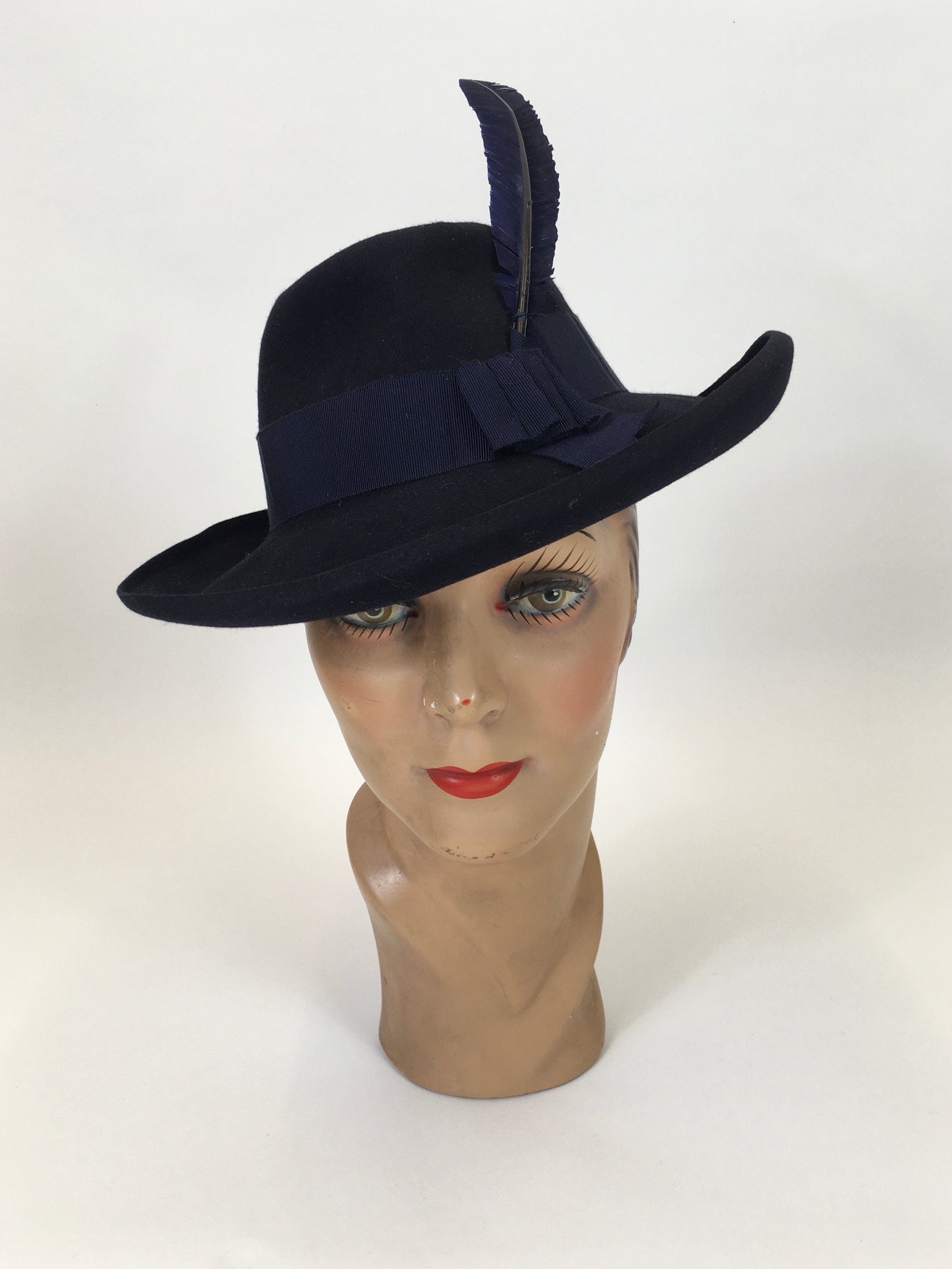 Vintage Late 30's/ early 40's Stunning Fedora in a Deep Navy Felt with a striking Blue feather. Such an amazing shape to this hat with its deep crown and lovely old Jacoll Hat British Made Label still attached. A Navy gross grain ribbon band around the crown with feather ( believed to be original ) with an internal elastic hair band. A fabulous accessory for many occasions, depending on the preferred hairstyle.