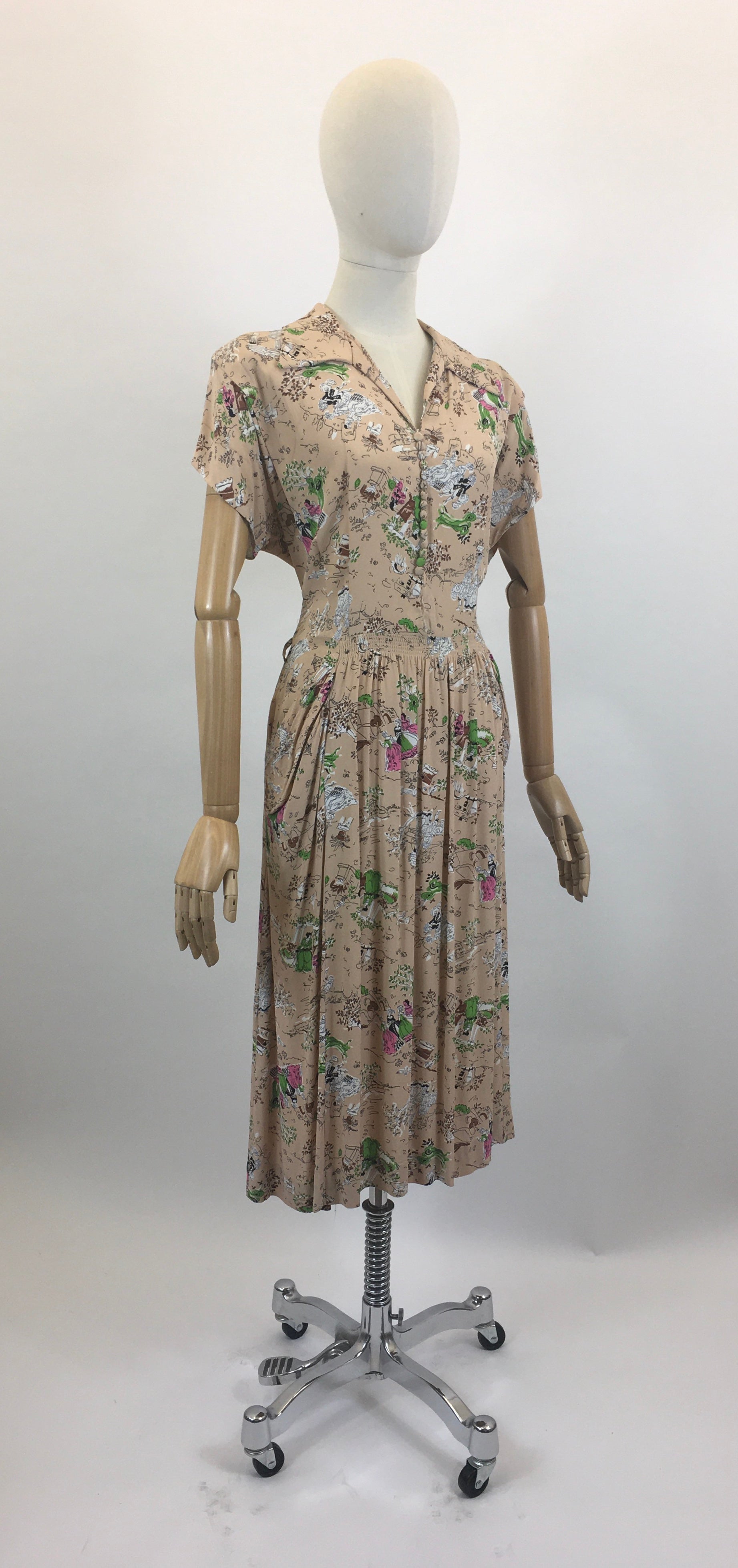 Vintage 1940's beautiful novelty print dress with characters and buildings of pinks, greens figurines and buildings on a pale peach background. Beautiful rayon crepe, so the drape is fabulous. Good shoulder pads, a metal side zip. Short sleeves. Lovely collar, centre covered buttons to the waist ( these do not open ) Fabulous shirring to the centre waist forming into pleats with the lovely draped pockets.