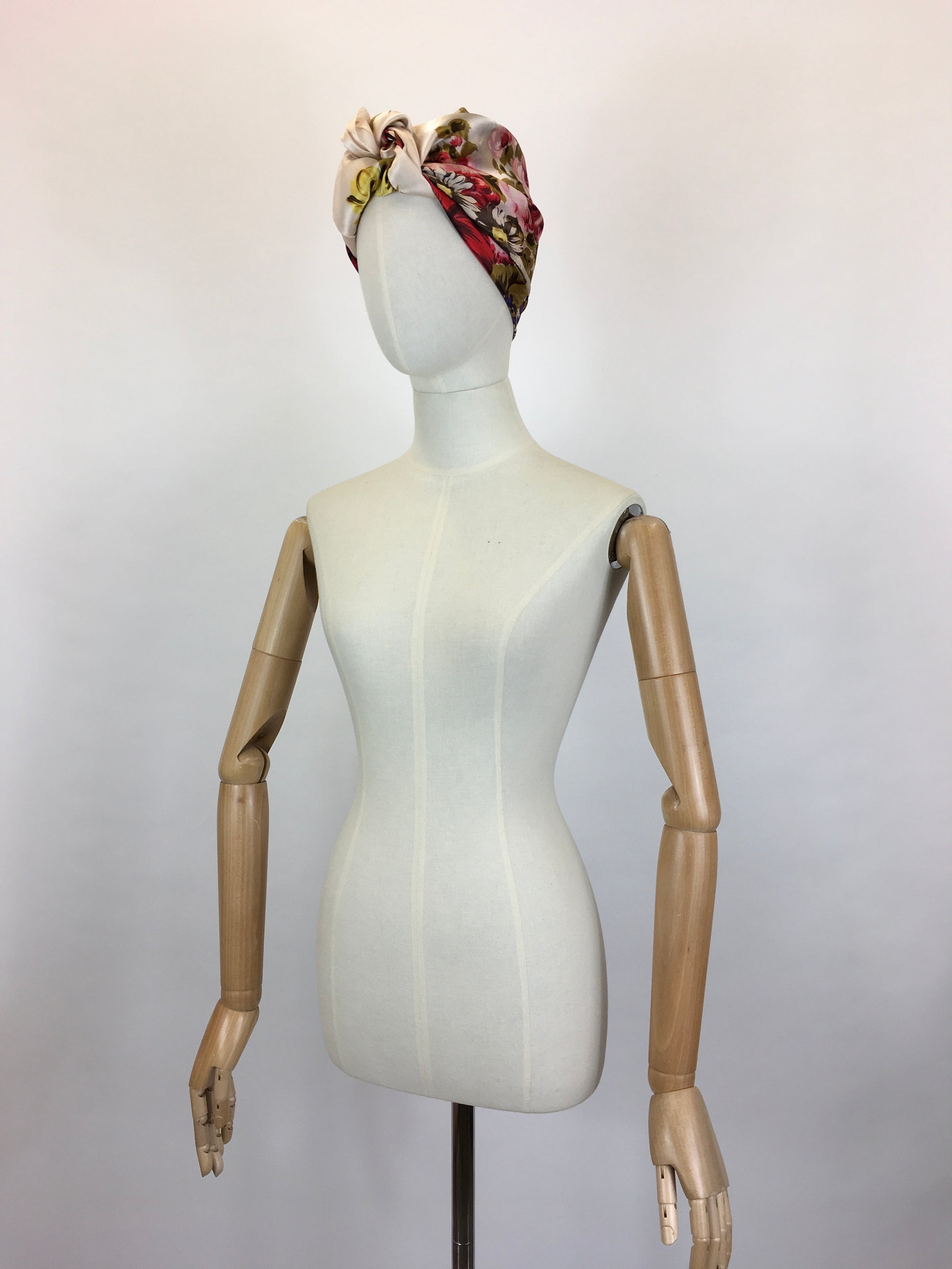 Vintage 1950’s silk floral scarf with a rolled edge. This piece has the most beautiful pops of vibrant pinks, purples,blues, yellows,greens, red and whites. A very versatile piece to wear numerous ways and with so many ensembles. Please see condition report below. A lovely addition to any vintage wearers collection.