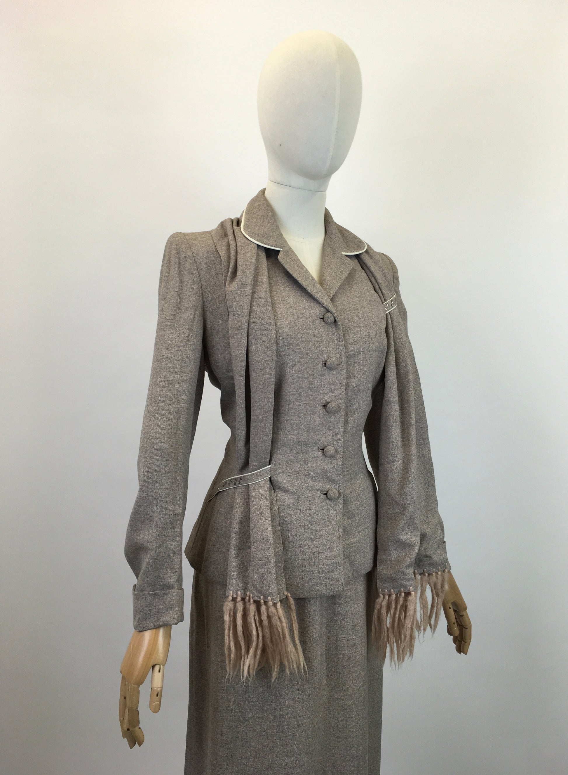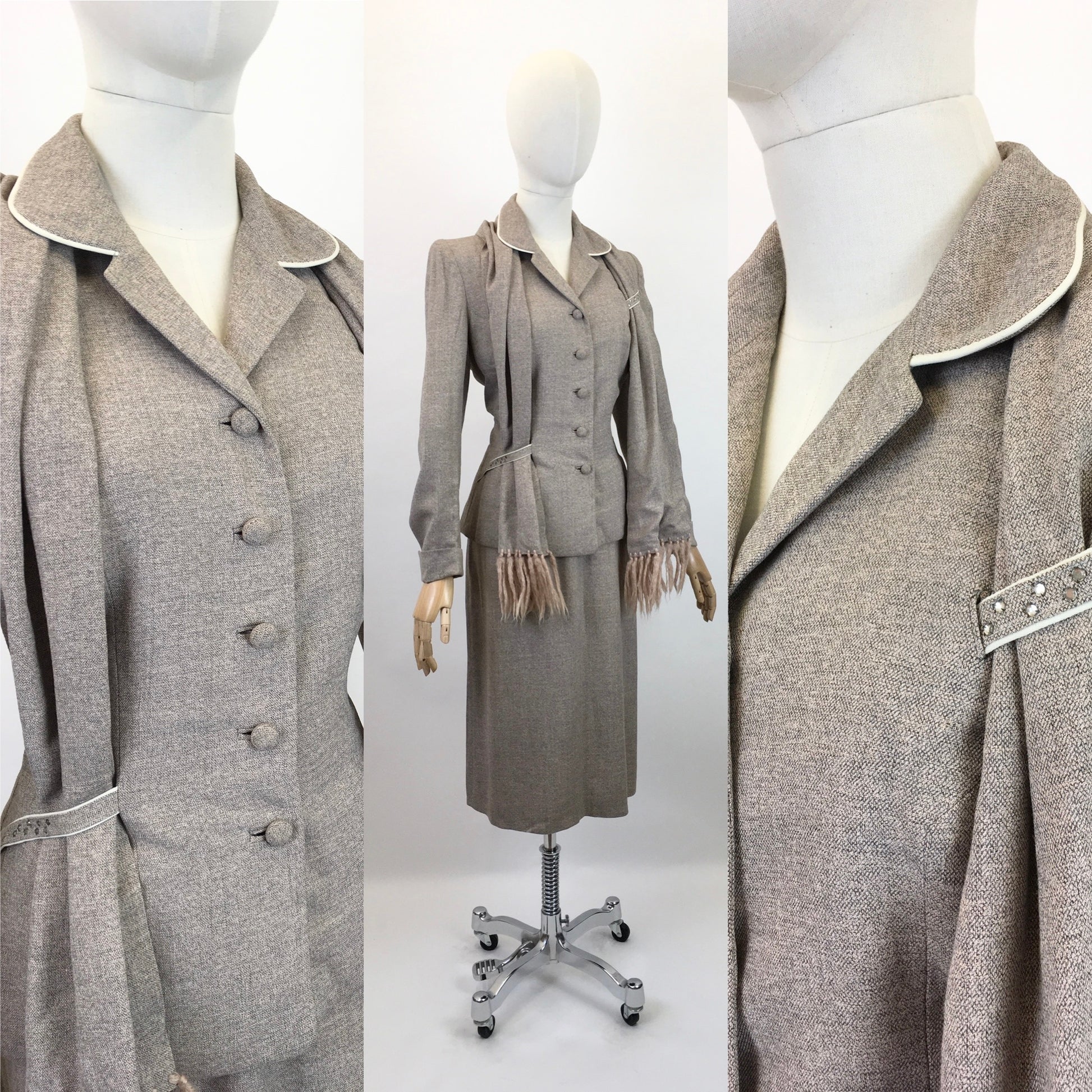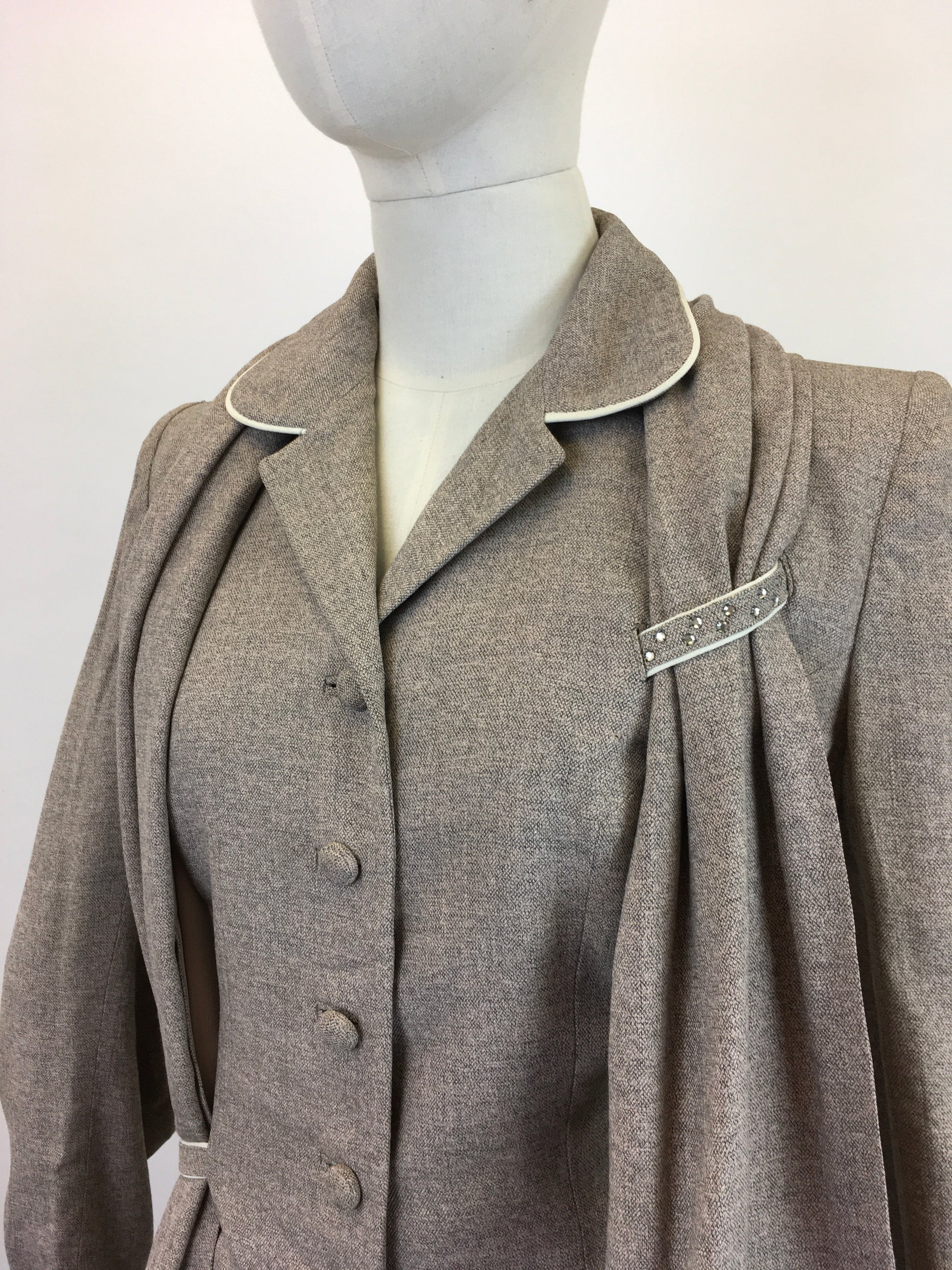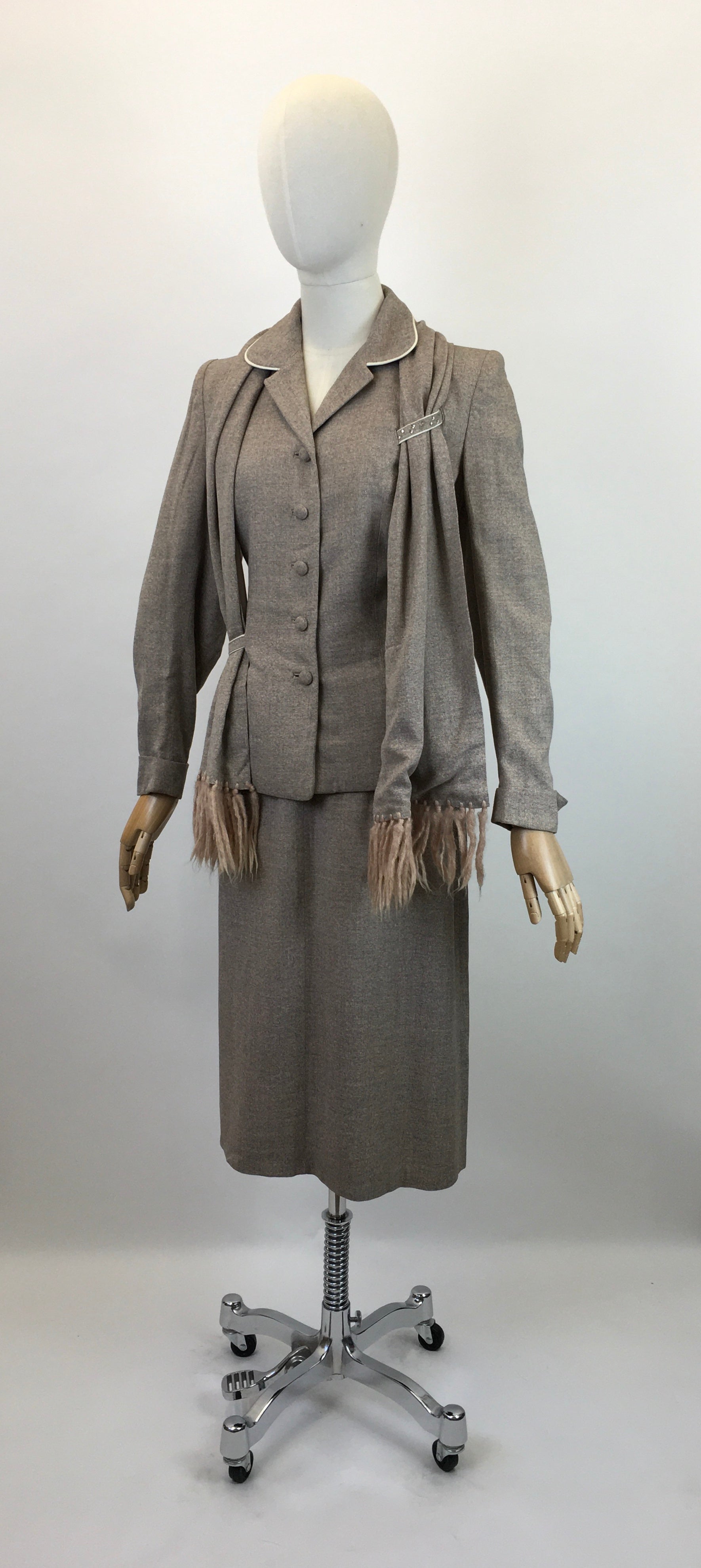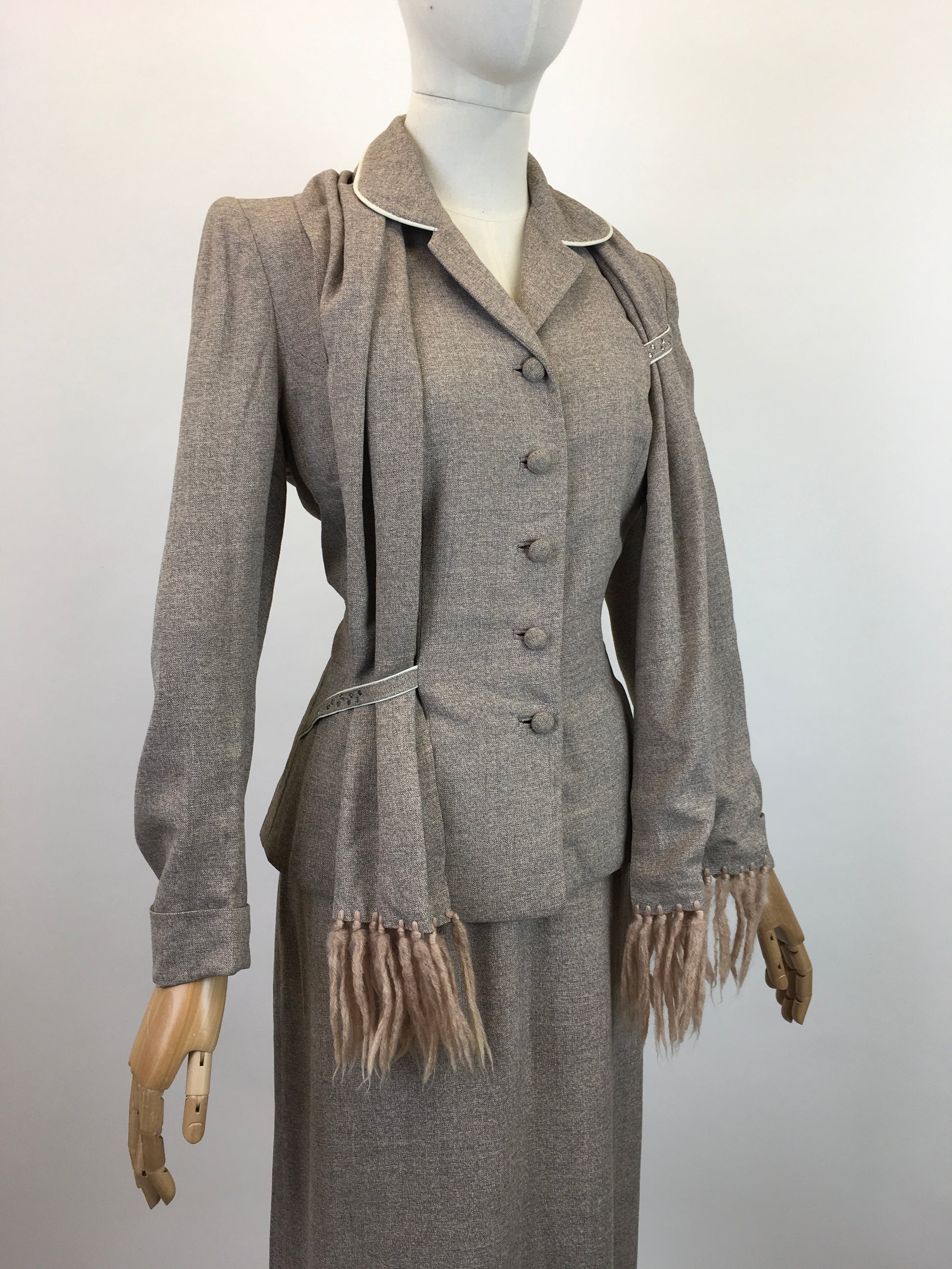 Vintage 1940's stunning 3pc suit in a soft fawn with a draped tasselled scarf. This is a sensational example of its kind from the era and oozes ' Hollywood Glamour' in its style and silhouette. The jacket has all the details and features a classic ' New Look' shape. It has a rounded collar with contrast piped trim, full length sleeve, button front and an attached scarf which drapes through small pockets to the front of the jacket encrusted in paste gems with matching pipework details. The skirt is an a line shape and fastens with a metal side zip and button fastening. The set can be worn as is or worn with contrasting separates for varying ensembles. It also looks lovely styled with and without the attached scarf which can un threaded and worn without if desired. The jacket is fully lined and is made beautifully.