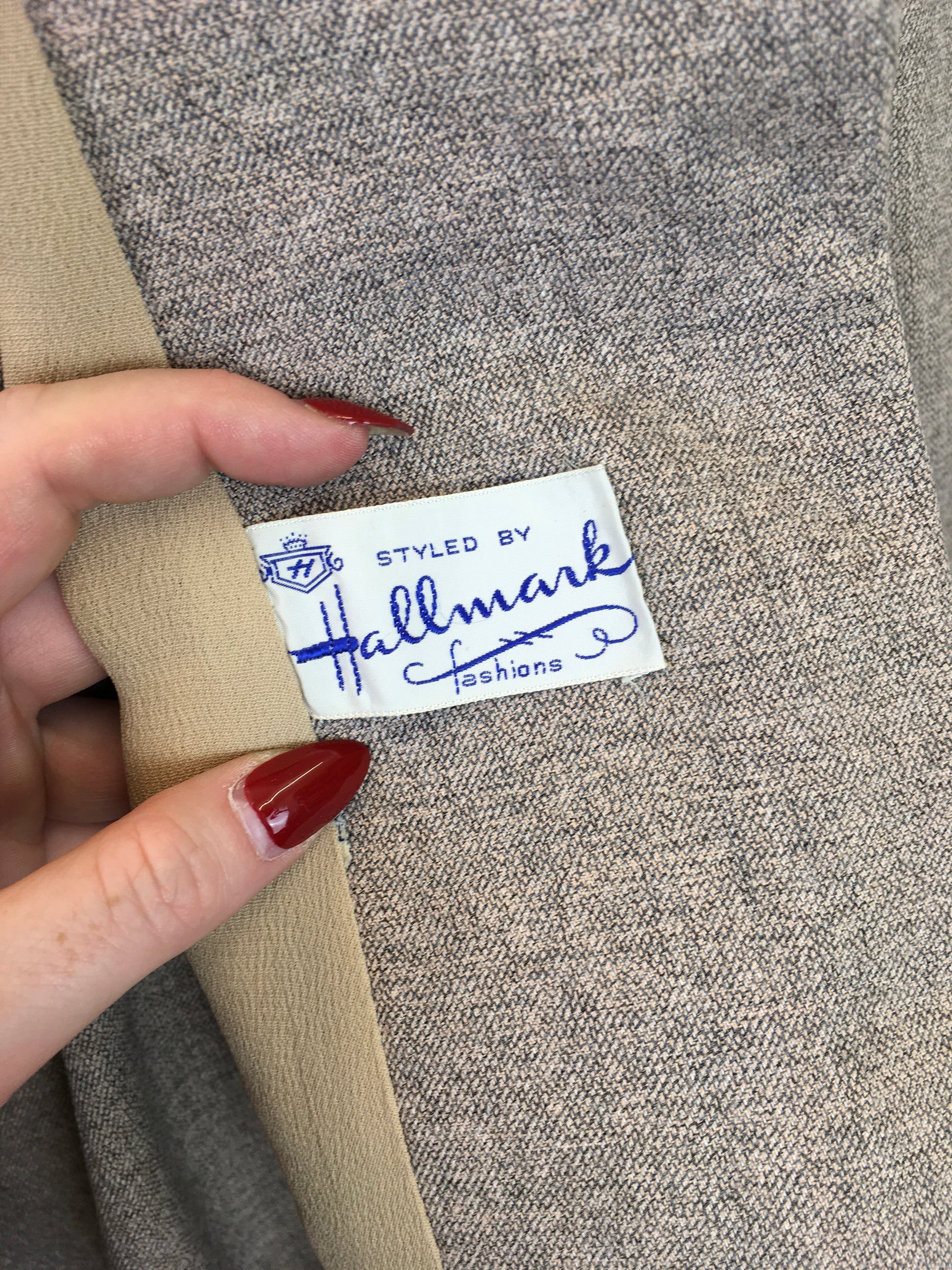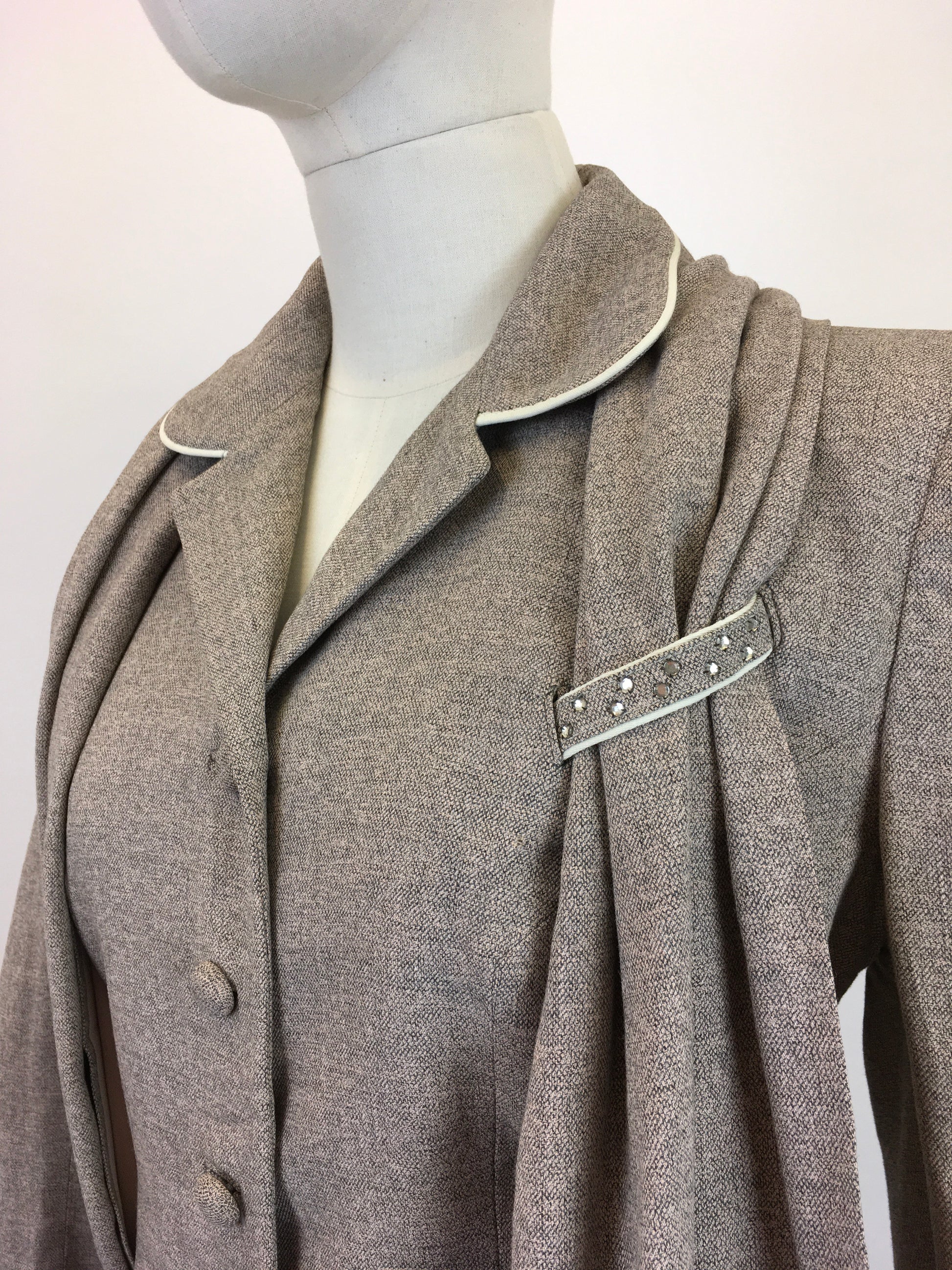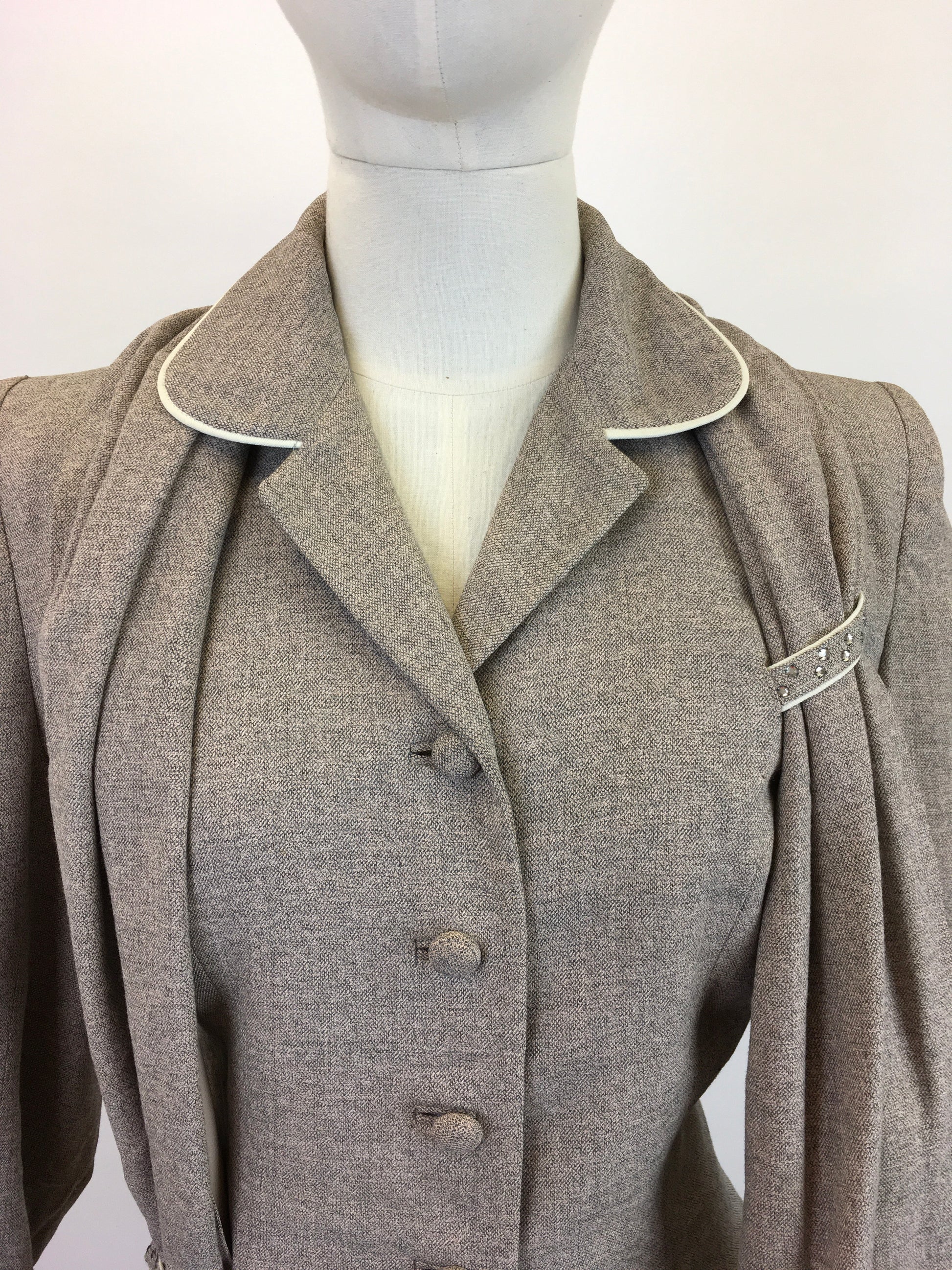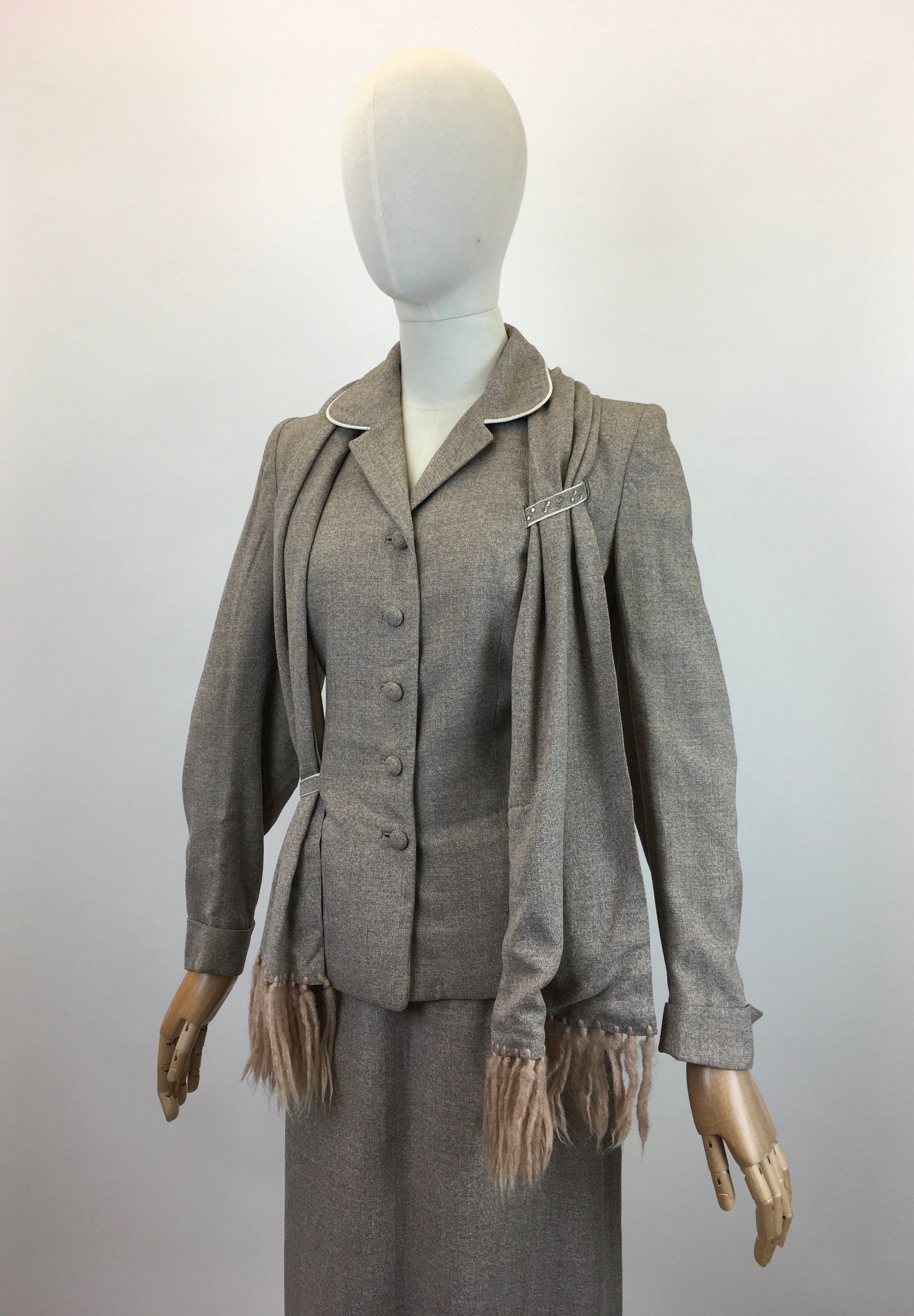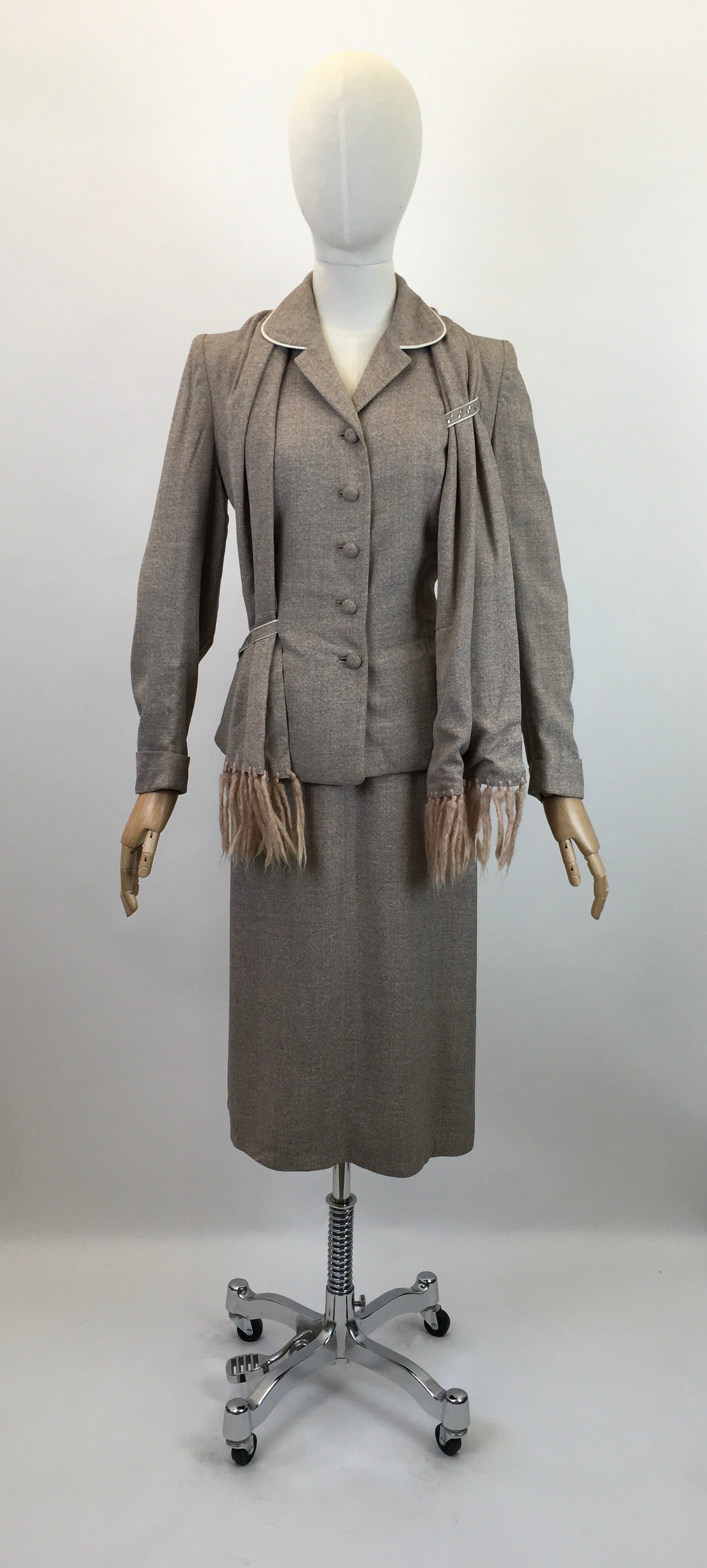 Vintage 1940's stunning 3pc suit in a soft fawn with a draped tasselled scarf. This is a sensational example of its kind from the era and oozes ' Hollywood Glamour' in its style and silhouette. The jacket has all the details and features a classic ' New Look' shape. It has a rounded collar with contrast piped trim, full length sleeve, button front and an attached scarf which drapes through small pockets to the front of the jacket encrusted in paste gems with matching pipework details. The skirt is an a line shape and fastens with a metal side zip and button fastening. The set can be worn as is or worn with contrasting separates for varying ensembles. It also looks lovely styled with and without the attached scarf which can un threaded and worn without if desired. The jacket is fully lined and is made beautifully.