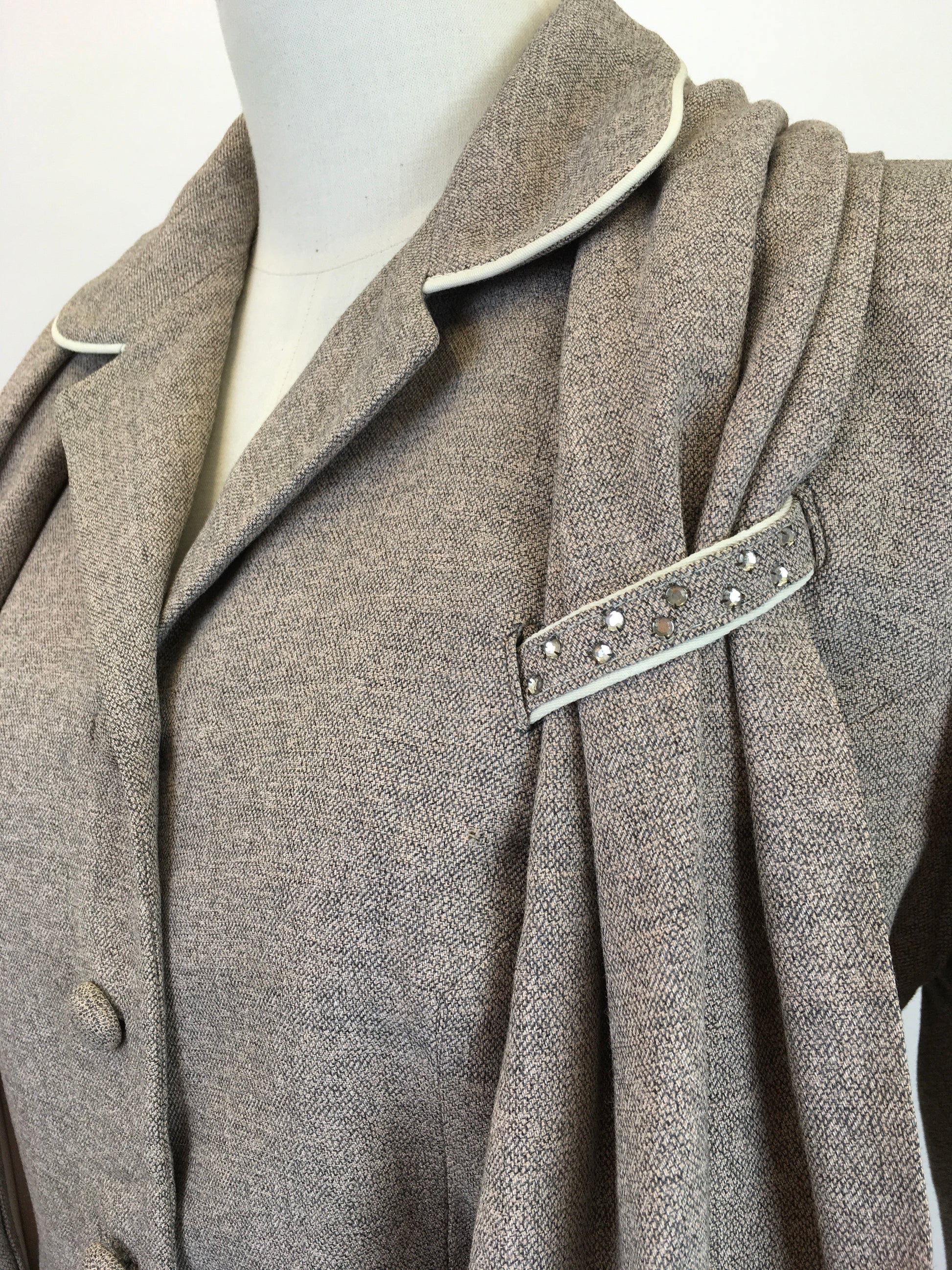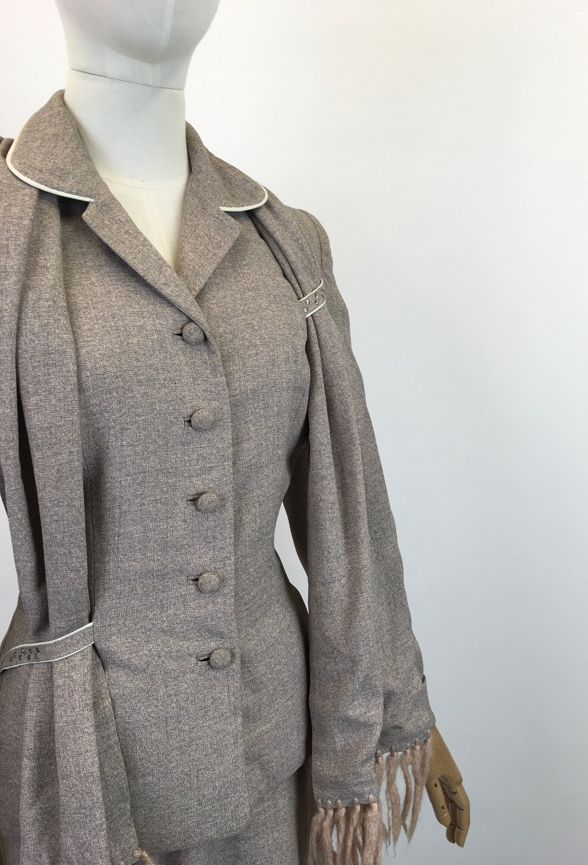 Original 1940's STUNNING 3pc Suit - In Soft Fawn with A Draped Tasselled Scarf