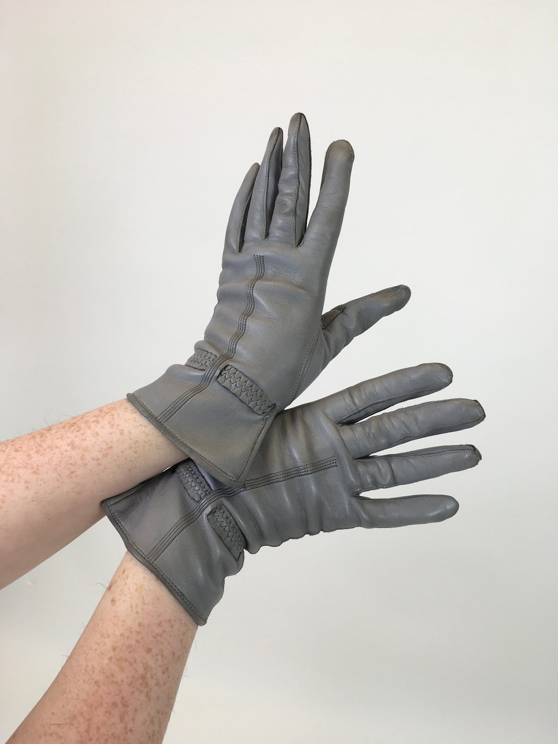 Vintage fabulous 1940's CC41 utility gloves in a powdered grey leather. A great pair of leather gloves with the great utility stamp showcasing they are from the British wartime period. They are in a lovely powdered grey leather which has a great patina. They have a great braided detailing to the wrist.