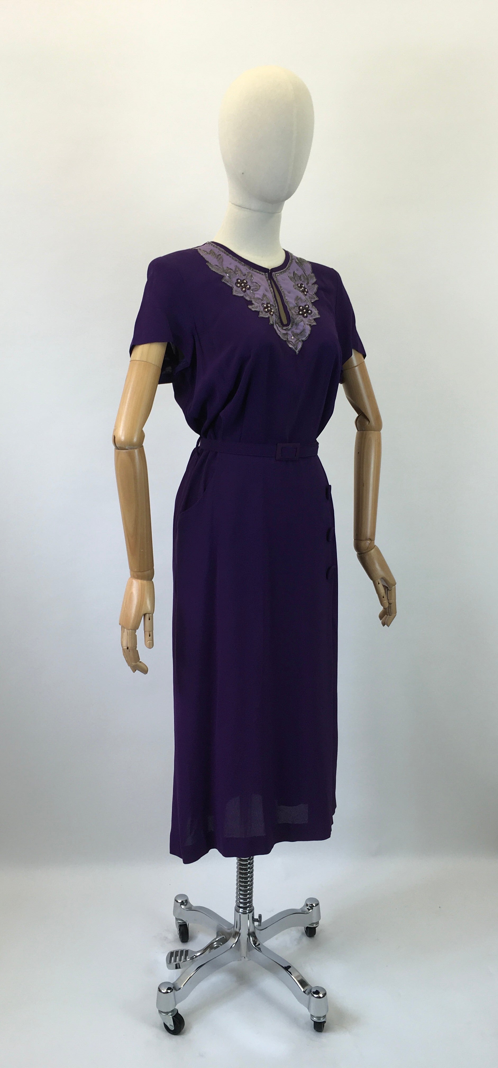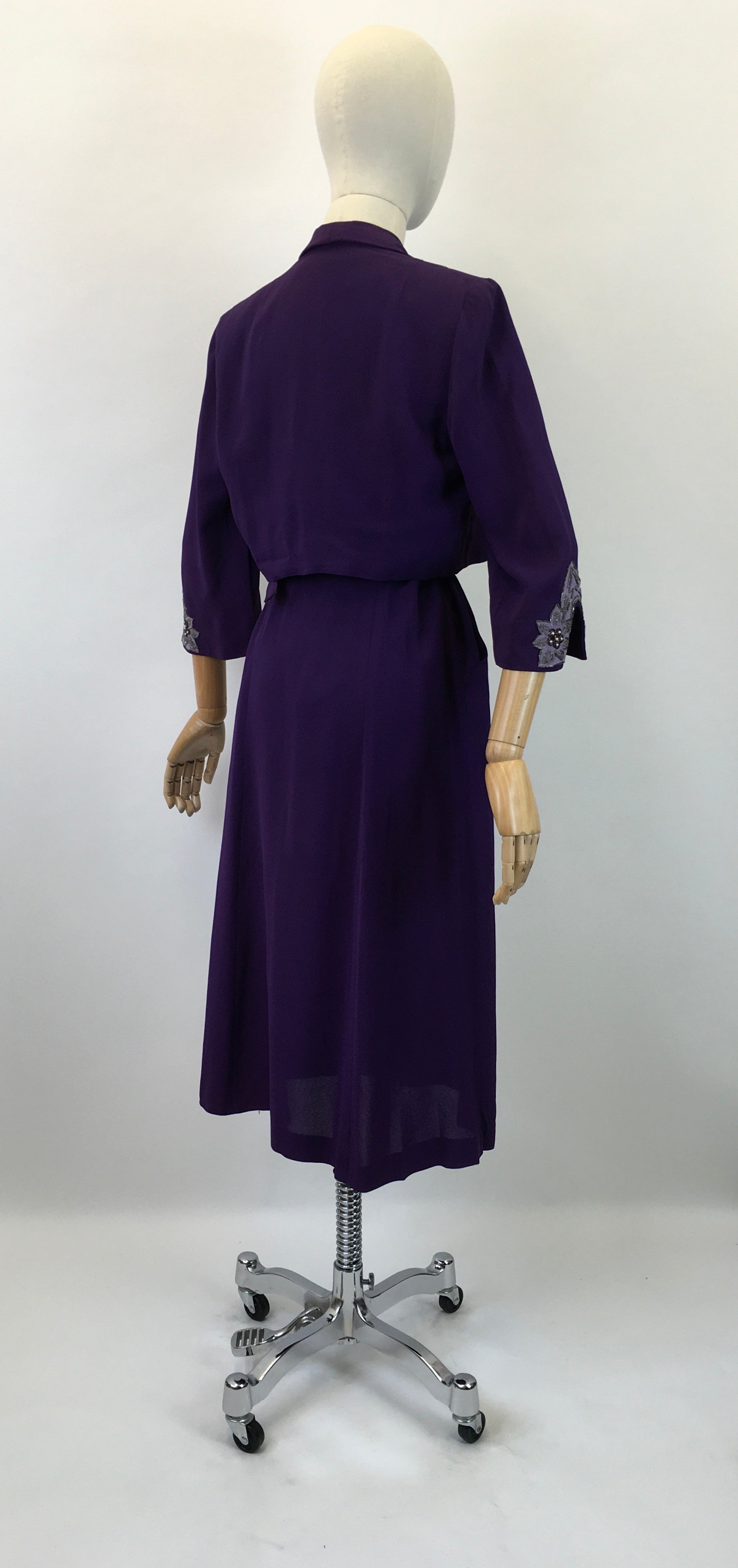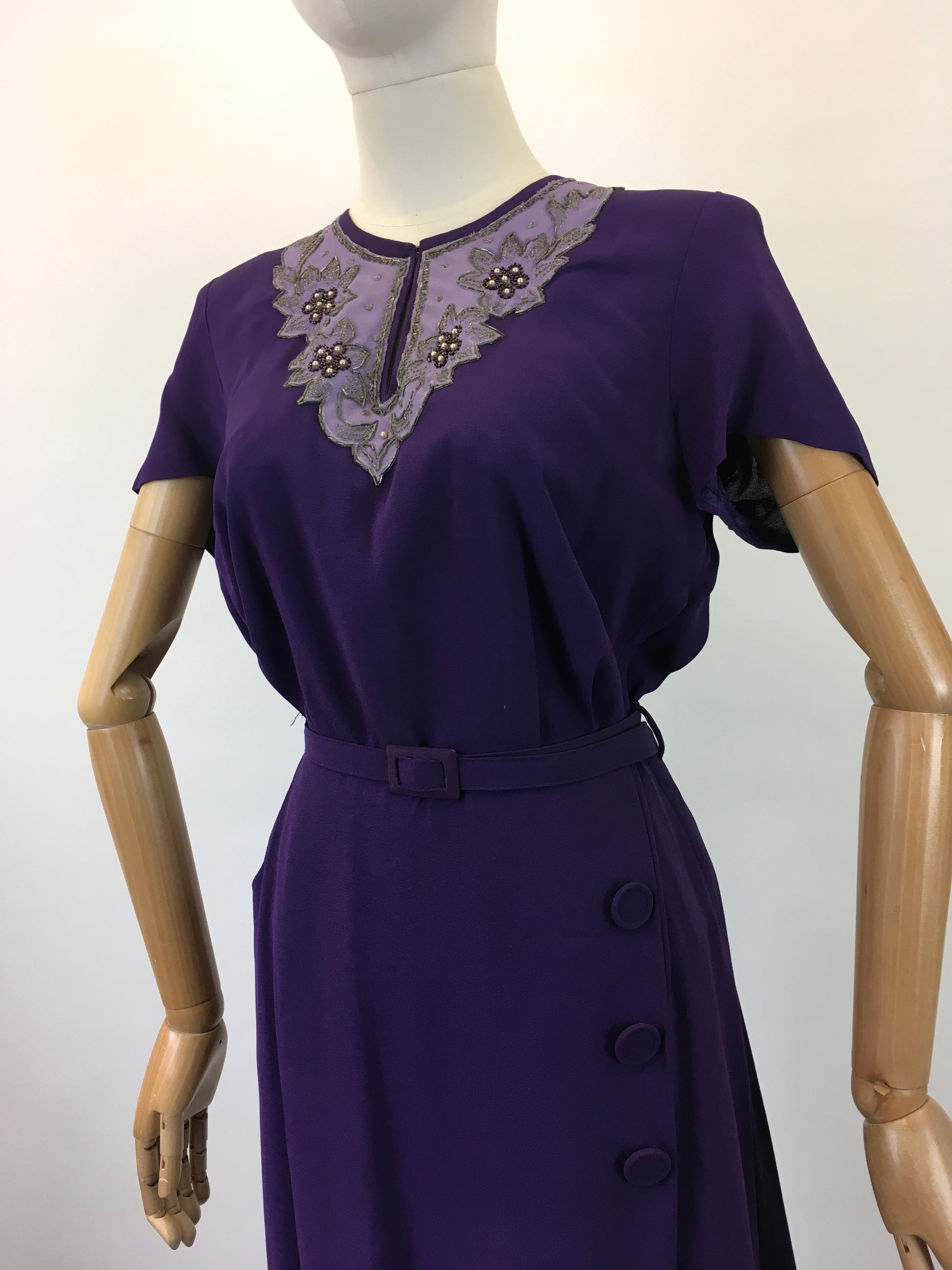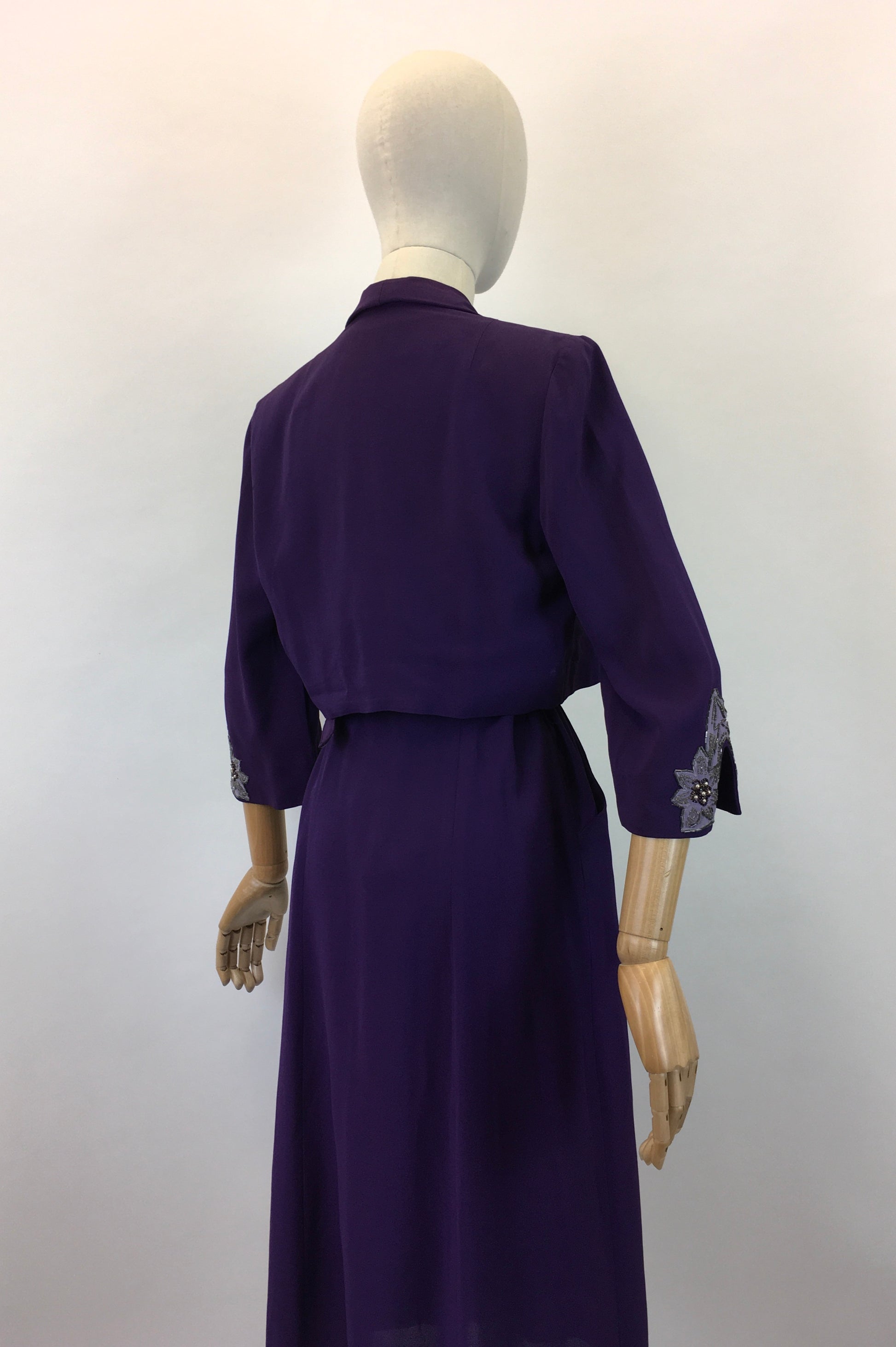 Vintage 1940's amazing 3pc set in Cadbury purple with sensational beadwork detailing. This set is a beautiful example from its time and has such lovely detailing. The set consists of a dress, bolero and matching belt and it's so lovely to find all piece still together. The dress has a stunning silhouette and features short sleeve enhanced by a shoulder pad, bodice with keyhole neckline detailing and contrast soft lilac yoke panel with beadwork, the dress pulls in at the waist with its matching belt and fastens with a metal side zip. The skirt has a beautiful drape and has buttons to the side, another divine extra detailing. The beadwork is exquisitely done and is layered up on a softer lilac shade of crepe, it's made up of deeper purple bugle beads and clear and silver beads which swirl into florals and leaves. The matching bolero has a 3/4 sleeve and has the complimenting beadwork to its sleeve hem. This is a beautiful 3 piece which would look lovely worn for a number of occasions.