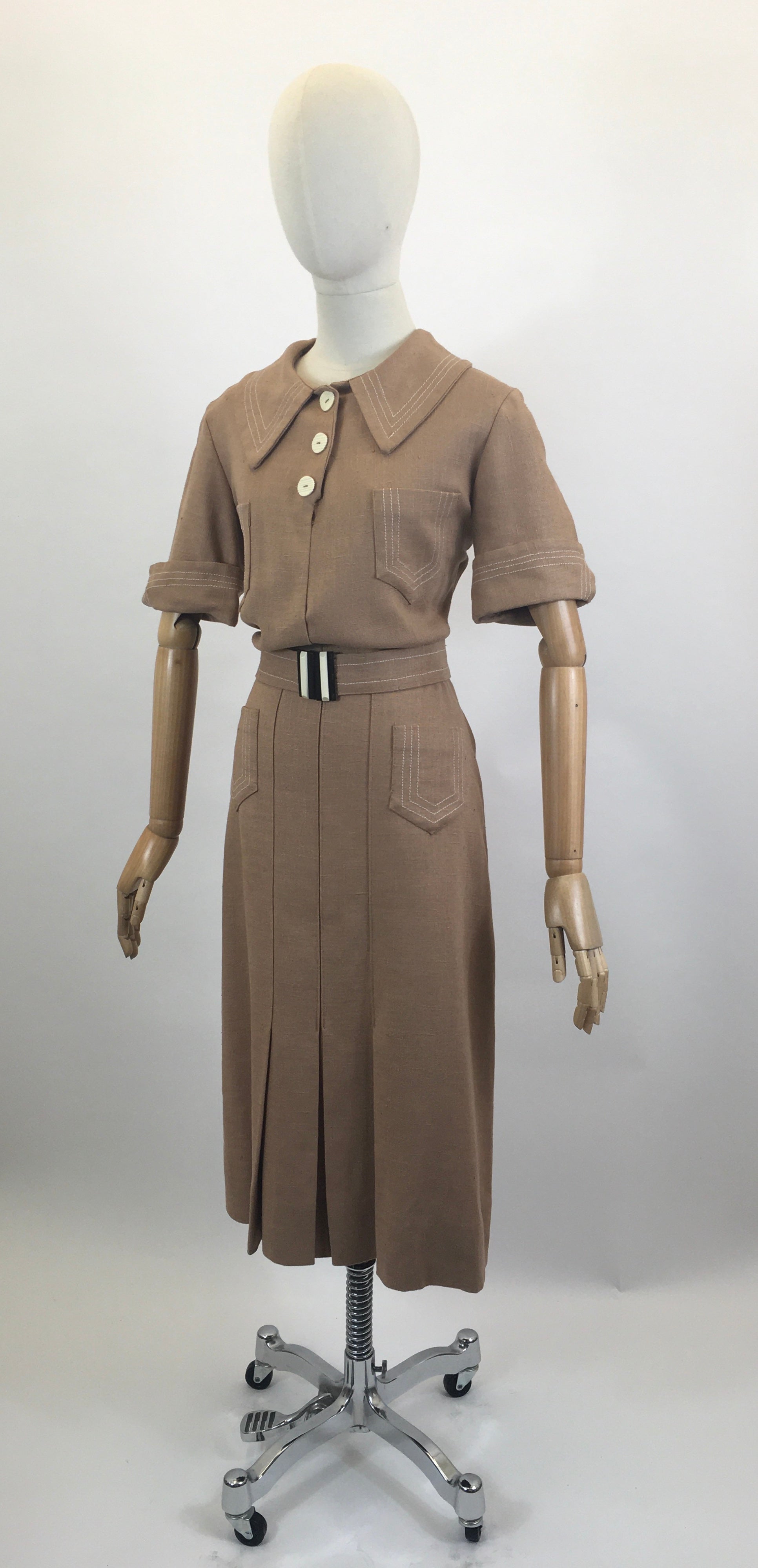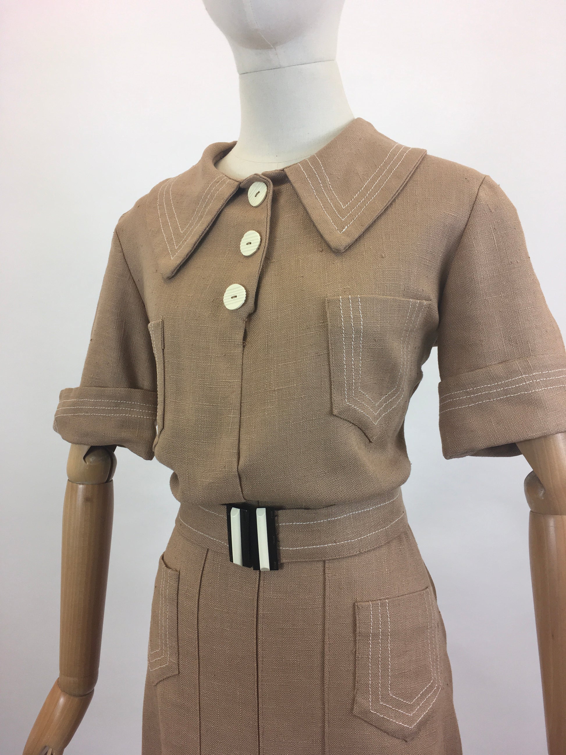 Vintage CC41 1940's fabulous Moygashel Linen dress in a soft caramel. Fabulous show stopping dress with all the features and quality of the 1940's. Moygashel linen, so lovely to wear and comfortable throughout. Original Belt with a fabulous contrast buckle ( this was unlikely to be the original ) suits perfectly. Exquisite contrast top stitching detailing to the collar, pockets, sleeve cuffs and belt. 3 x original button detailing down the front. Side metal zip opening. To the skirt there are double pleats to the front and a small kick pleat to the back. Again so iconic of the time.