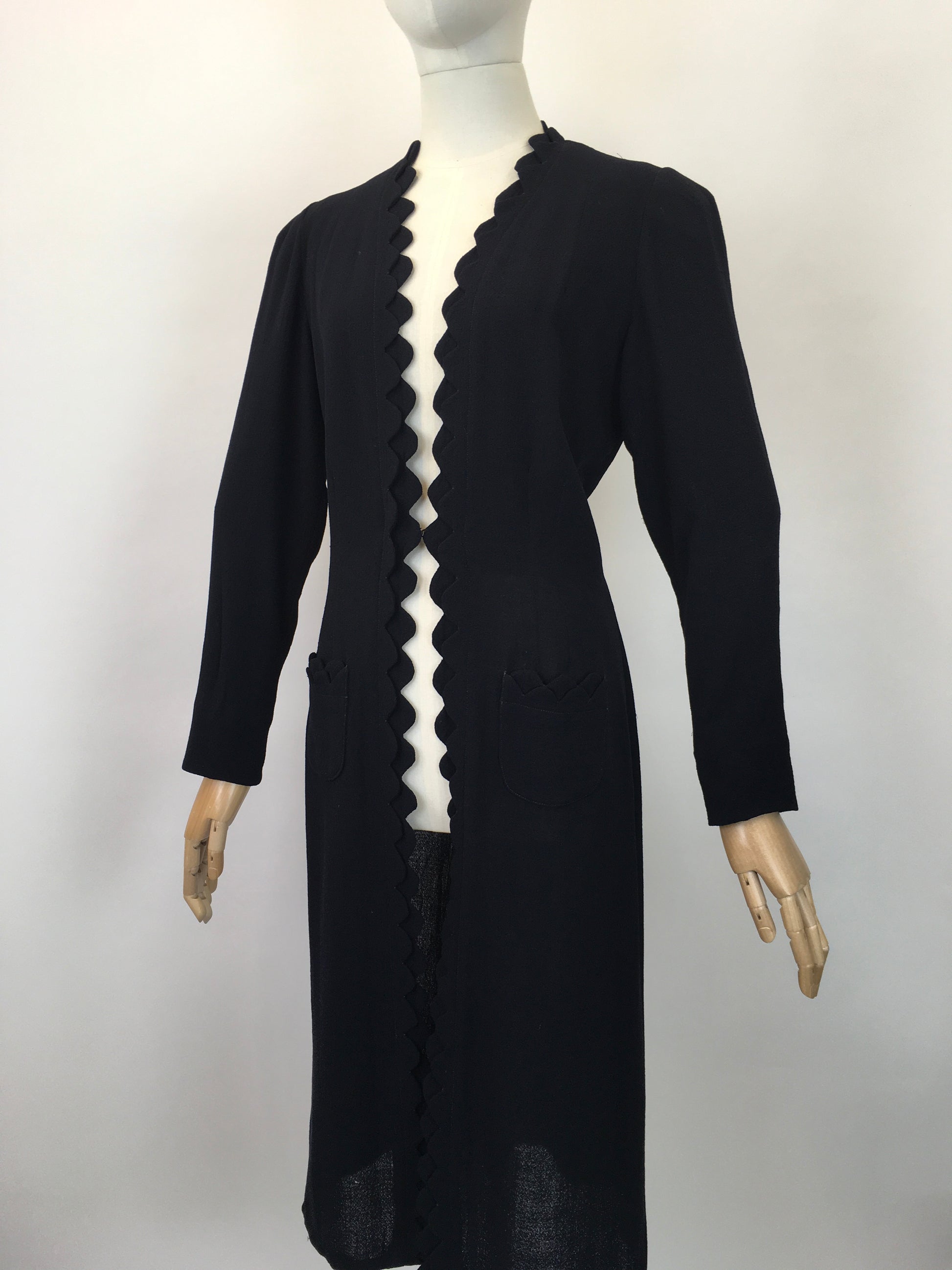 Vintage 1930's exquisite double scalloped edge to edge overcoat in a classic navy crepe. This is a divine piece of fashion and oozes the elegant sophistication of the thirties era. It has a typical 30's silhouette and features a double scalloped edging, long sleeve with small inverted cut out to the sleeve edge, pockets with matching scallop detail and it has a central hook and eye clasp fastening. These garments look fabulous worn over the top of cotton lawn dresses, knit sets or chore dresses for authentic styling.