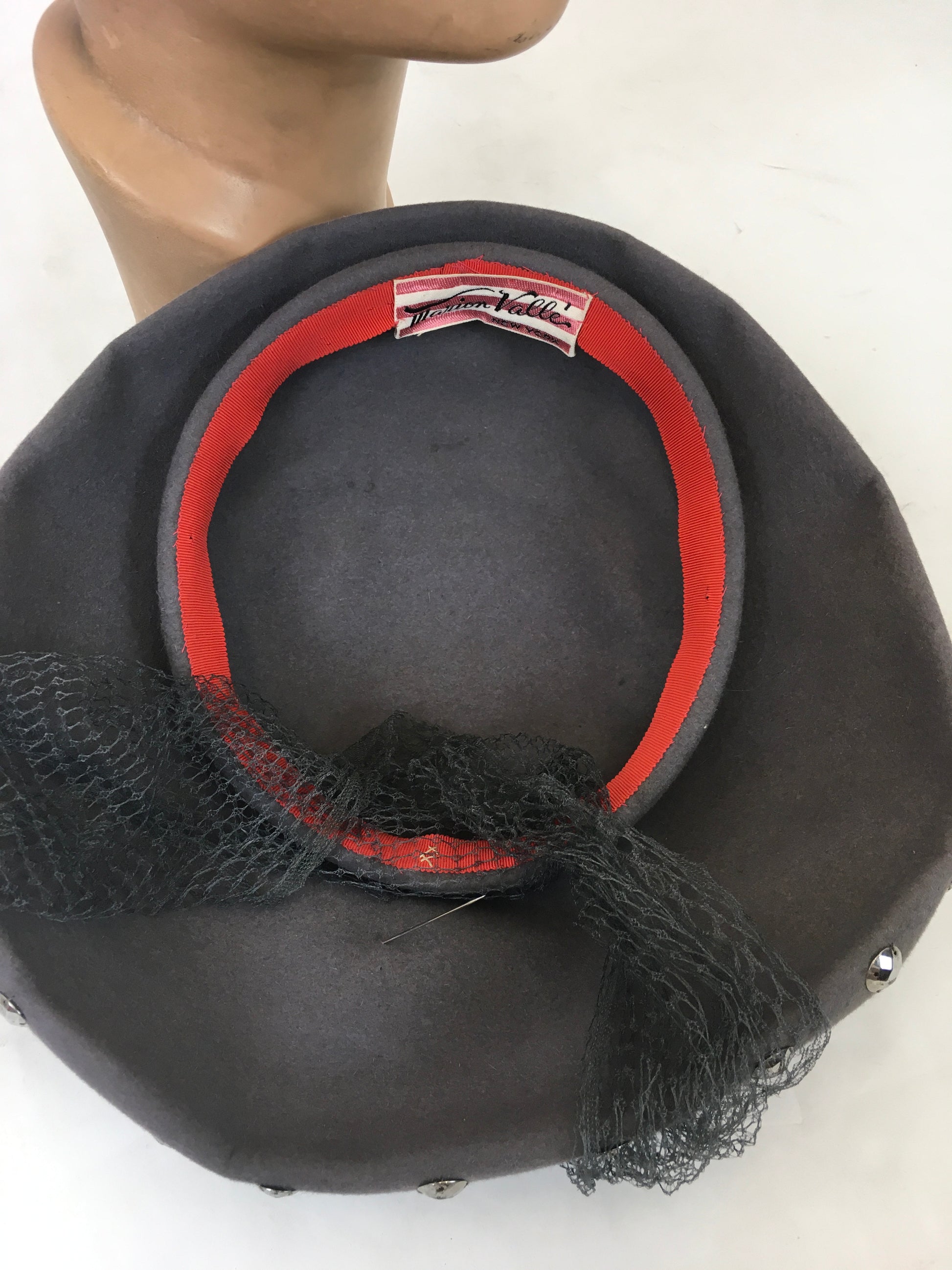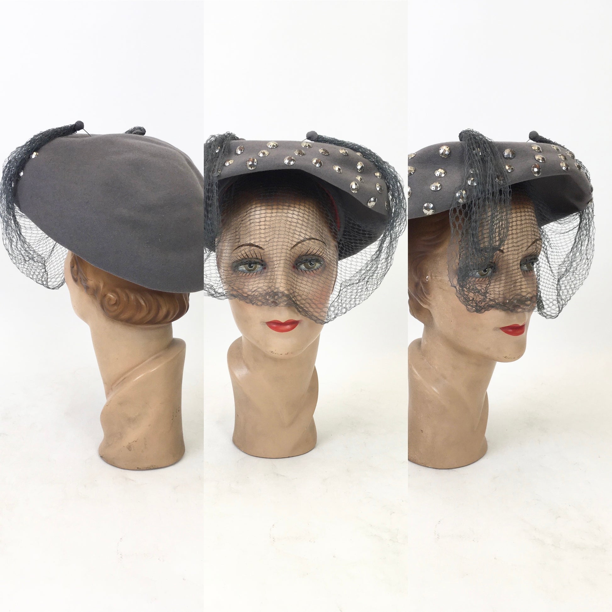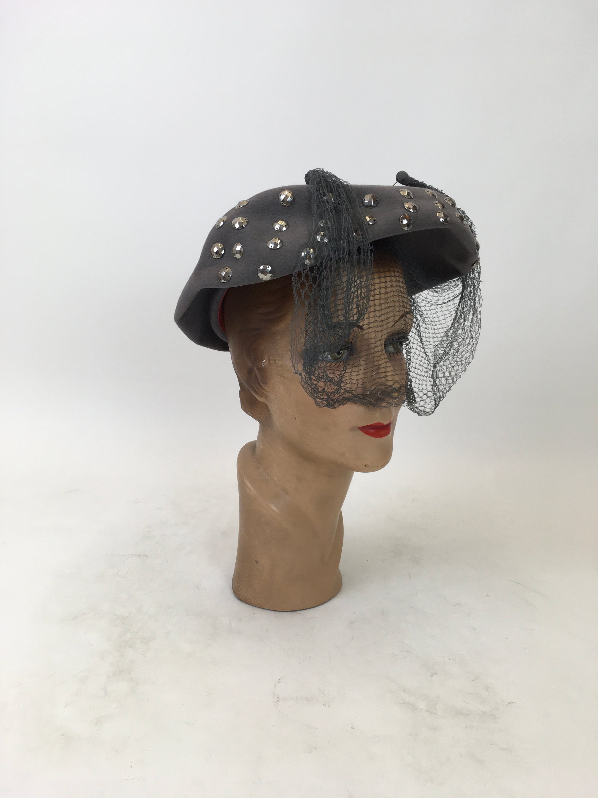Original 1940's Stunning Studded Hat with Veiling - In A Powdered Grey