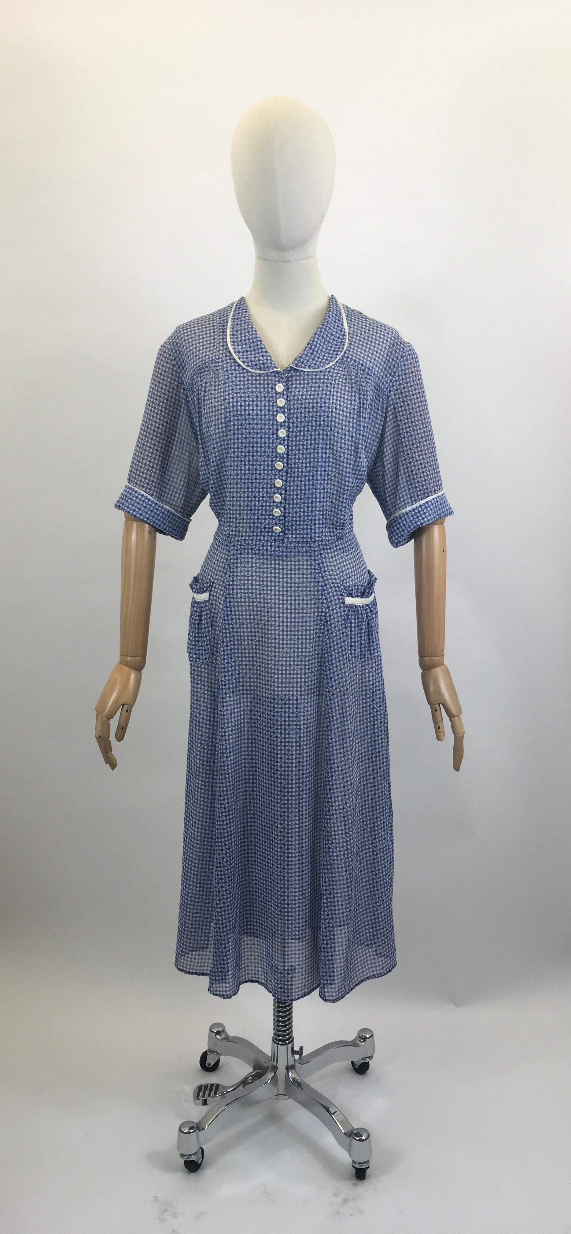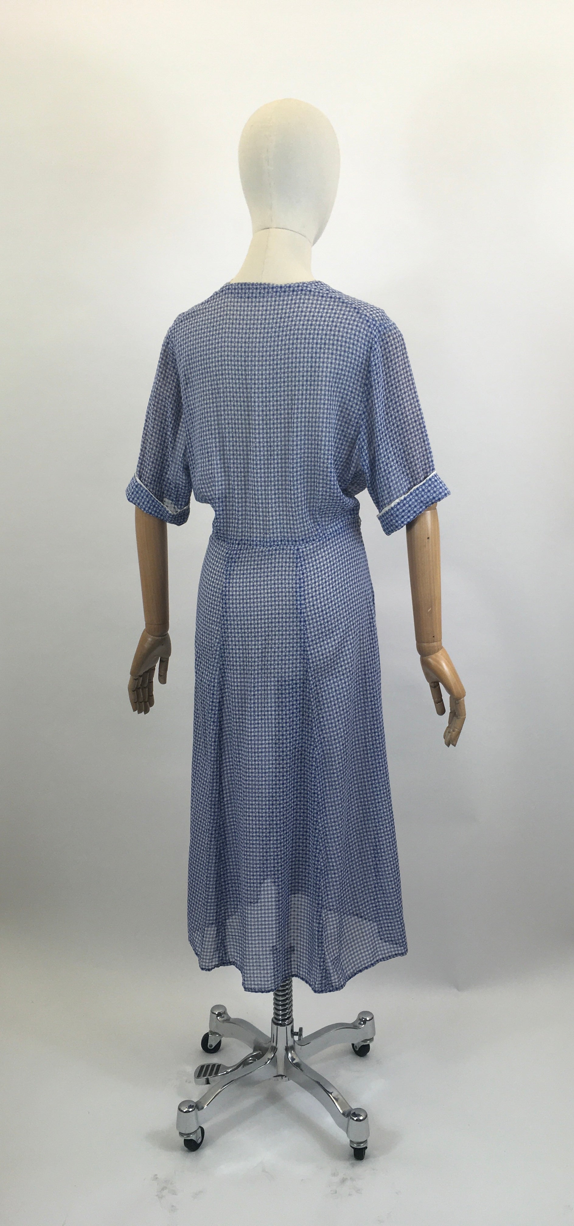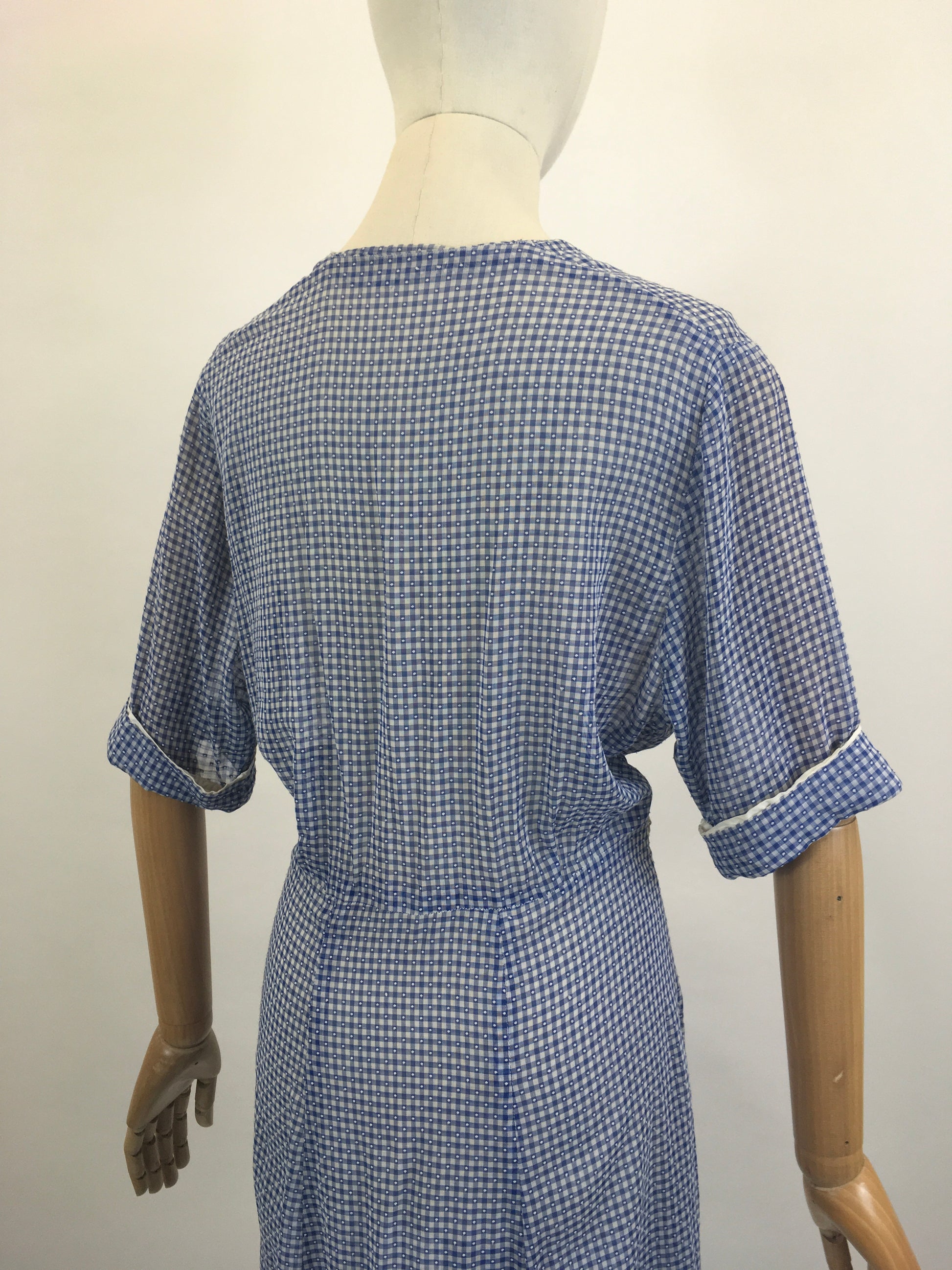Vintage late 30’s / early 40’s gorgeous day dress in Royal blue and White gingham. Flocked Cotton Lawn, drapes beautifully.