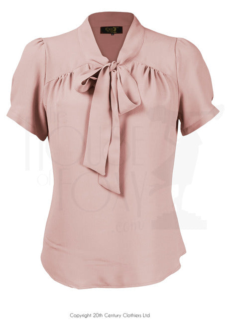A 1930’s divine example of a pussy bow blouse. This beautiful example features a short sleeve with pin tuck, slanted front yoke with gathers and long ties which can be tied into the pussy bow. It’s made from a beautiful 100% rayon crepe which drapes beautifully. It styles beautifully tucked into high waisted slacks, skirts or jeans.