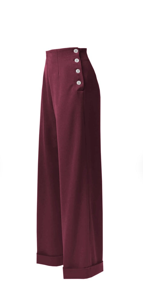 Perfect for everyday wear or dressed up for an evening soiree. Adapted from an original late 1930's pattern, House of Foxy's bestselling 1940s swing pants. Featuring 4 shell button side left fastening, fabulous wide leg and classic turn ups these trousers are perfect for dancing and extremely comfortable.