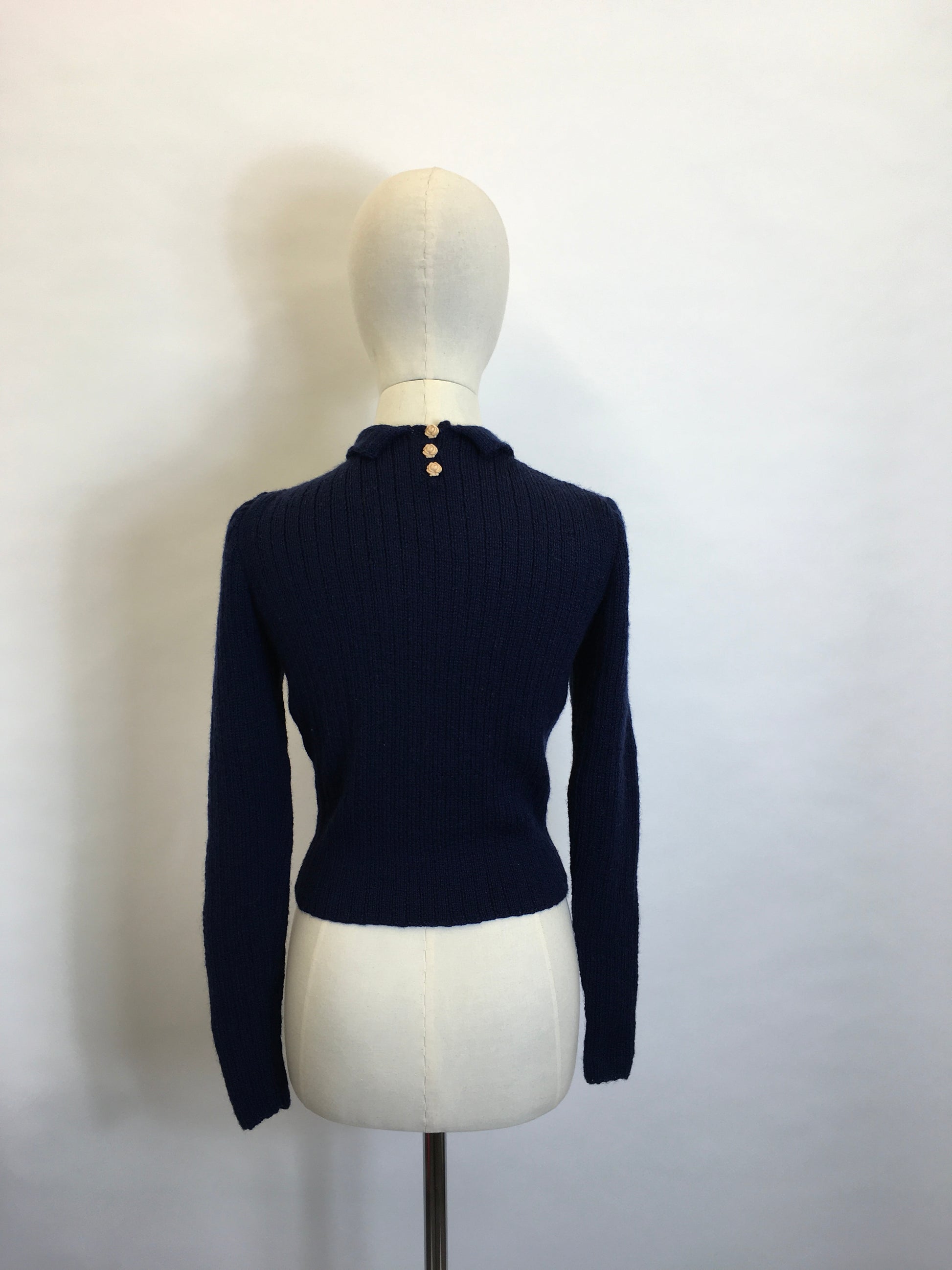Made from an original 1940s pattern by the very talented Linda at Knitting For Victory, we have this exquisite Jumper from an original ' Stitchcraft' magazine in October 1945. Made from a mix of modern yarns this piece is fully washable and features greens, a rose pink and a deep claret on a bed of navy. It fastens with 3 tiny little original rose buttons on the nape of the neck and has long sleeves and a ribbed waistband.