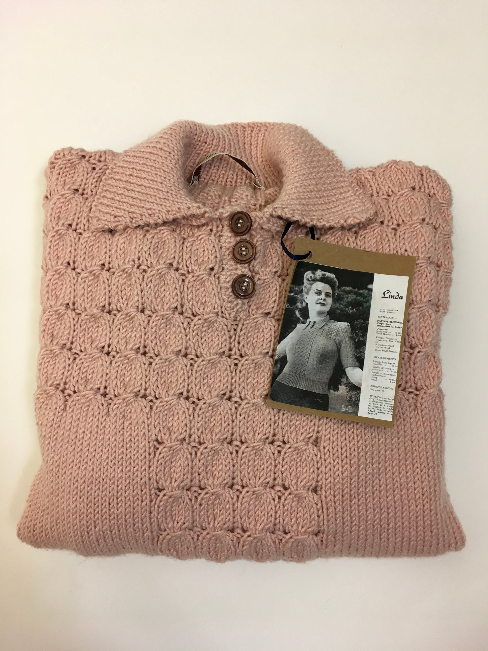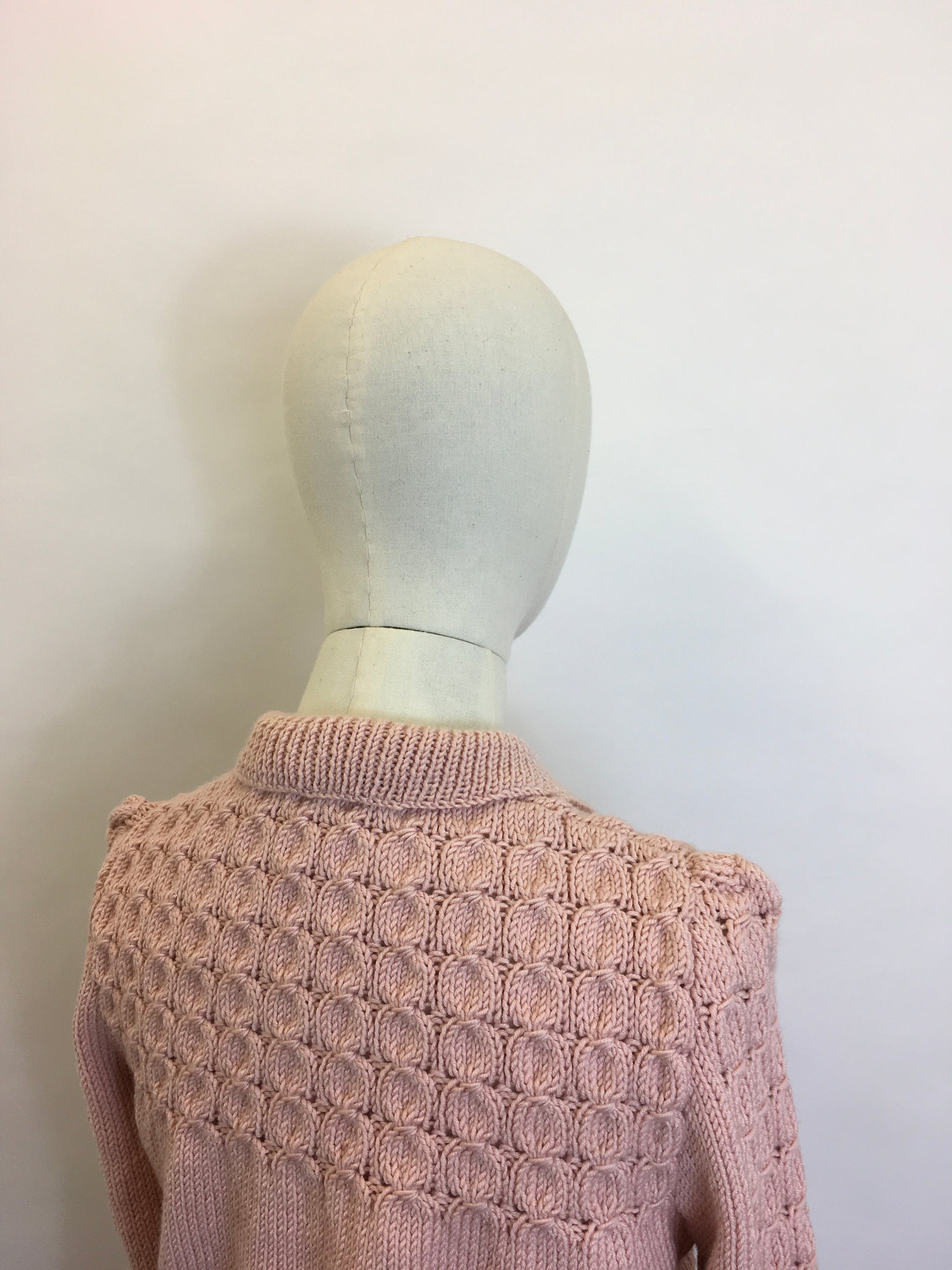Made from an original 1940's pattern by the very talented Linda at Knitting for Victory, we have this exquisite Jumper, knitted from a pattern named after the lady herself 'Linda' she just had to get her knitting needles going for this one! Created using the most beautiful modern pale pink silk / merino wool mix this jumper is so soft and shares so much detailing. She fastens with 3 original buttons to the top middle and has a lovely collar detailing, shoulder pads, longer line body and full length sleeves.