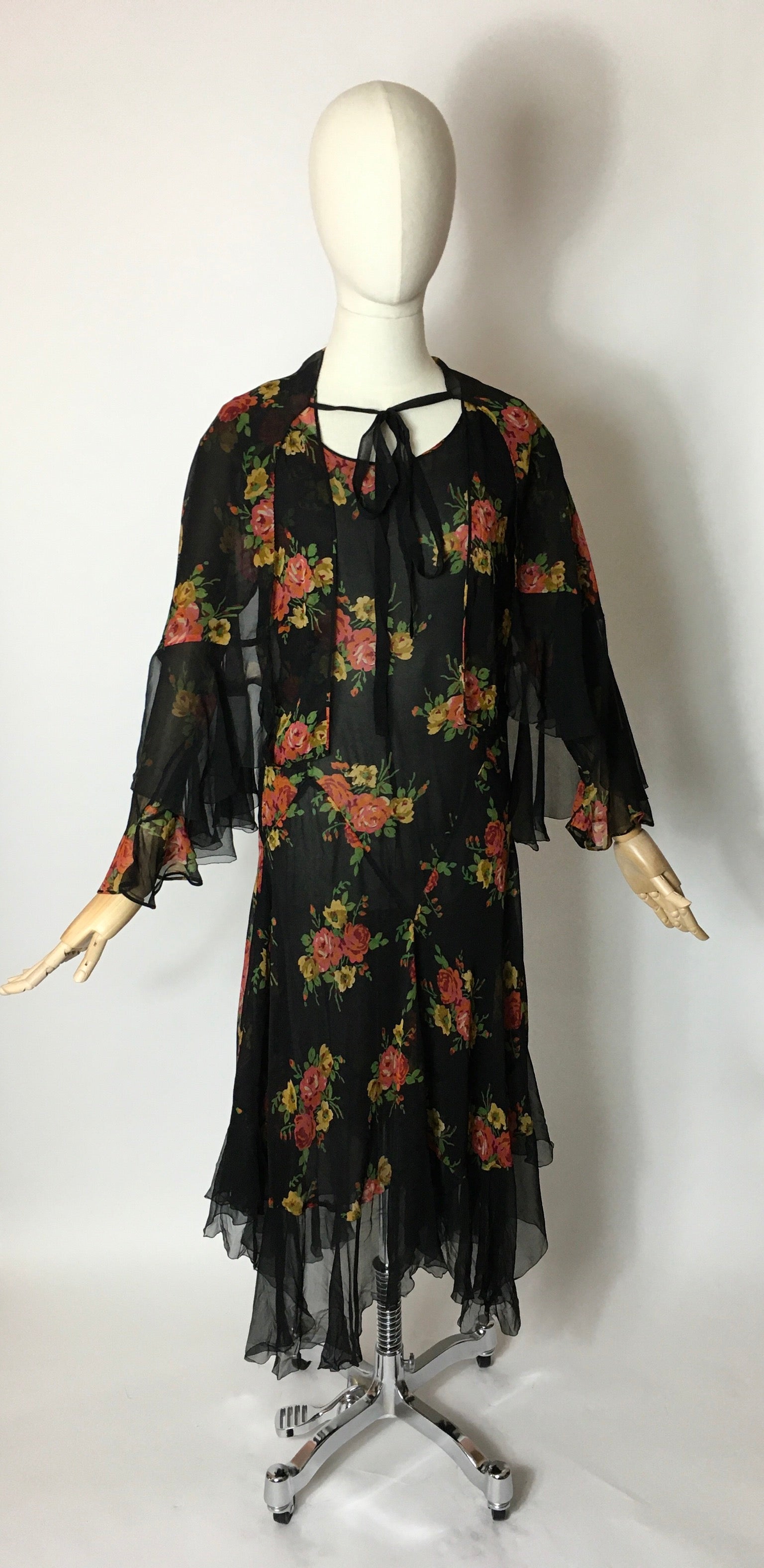 Original 1930’s SENSATIONAL 3pc Set in A Floral Chiffon - Dress, Jacket & Caplet Set