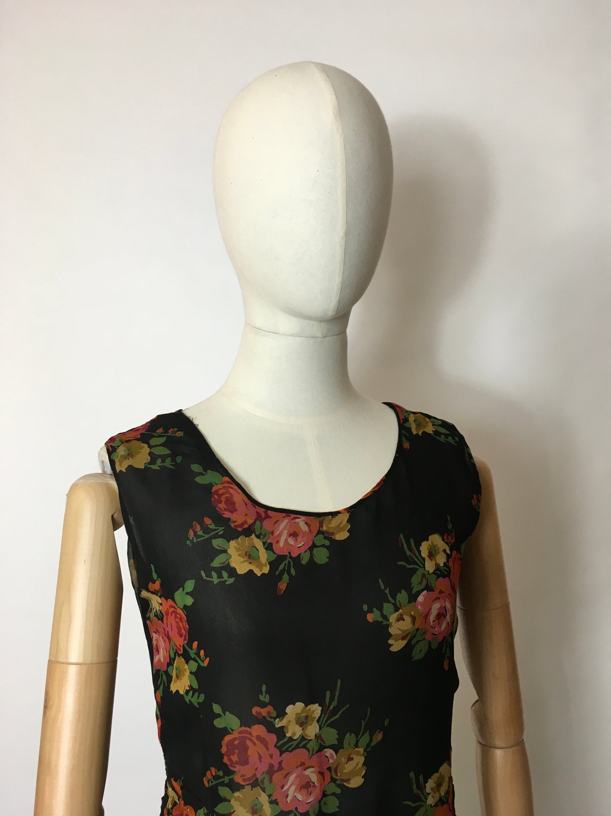 Vintage 1930’s SENSATIONAL 3 pc set consisting of dress, jacket & caplet. Made from a divine floral chiffon with autumnal colourings of oranges, yellows, pinks and greens on a bed of black. A versatile set which can be worn together or equally as lovely as separates. A true collectors piece for its beauty and silhouette alone. Please see condition report below for flaws.