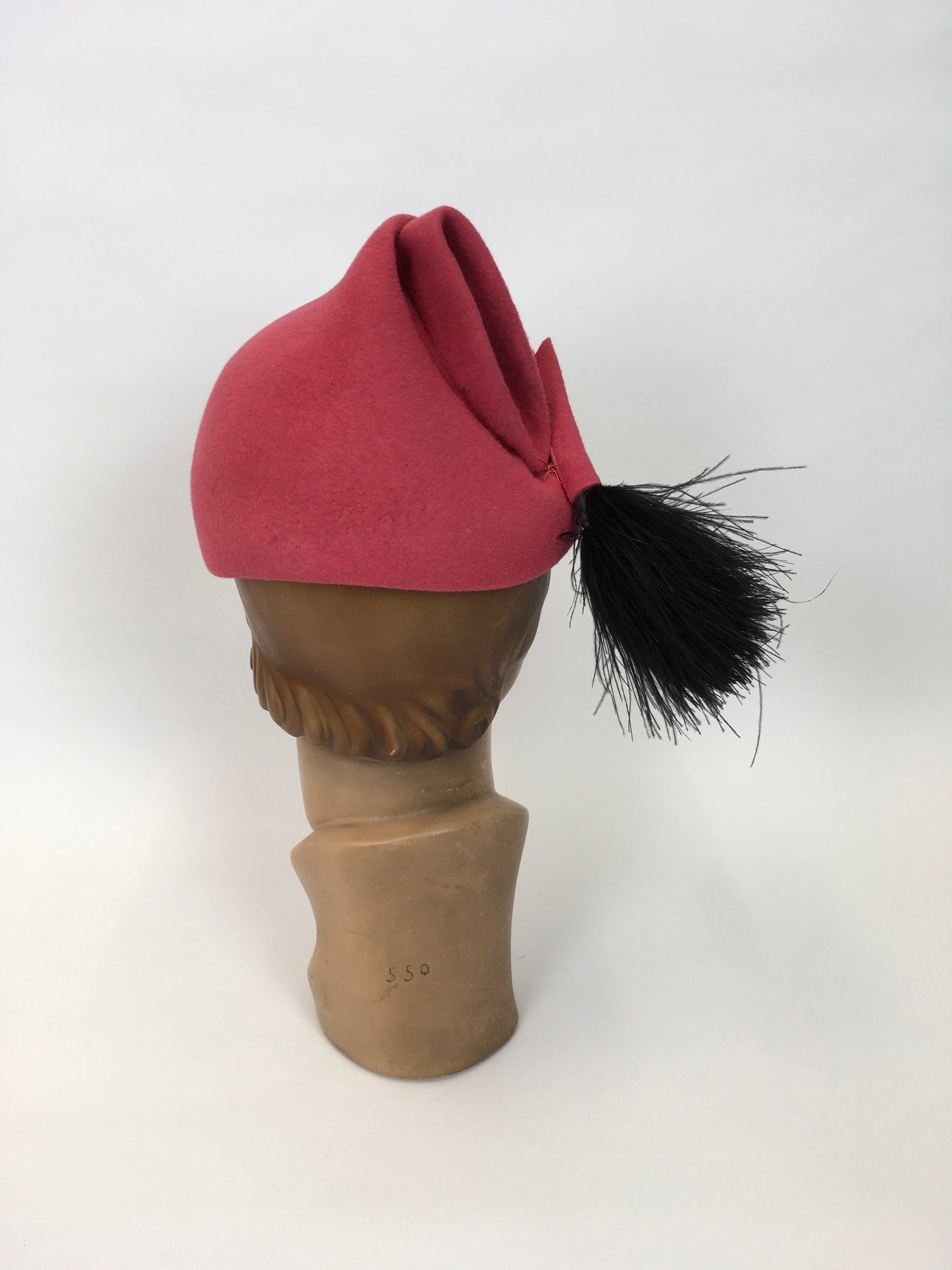 Original 1930’s AMAZING Raspberry Pink Pixie Hat - With a Fabulous Ostrich Feather Plume In Black