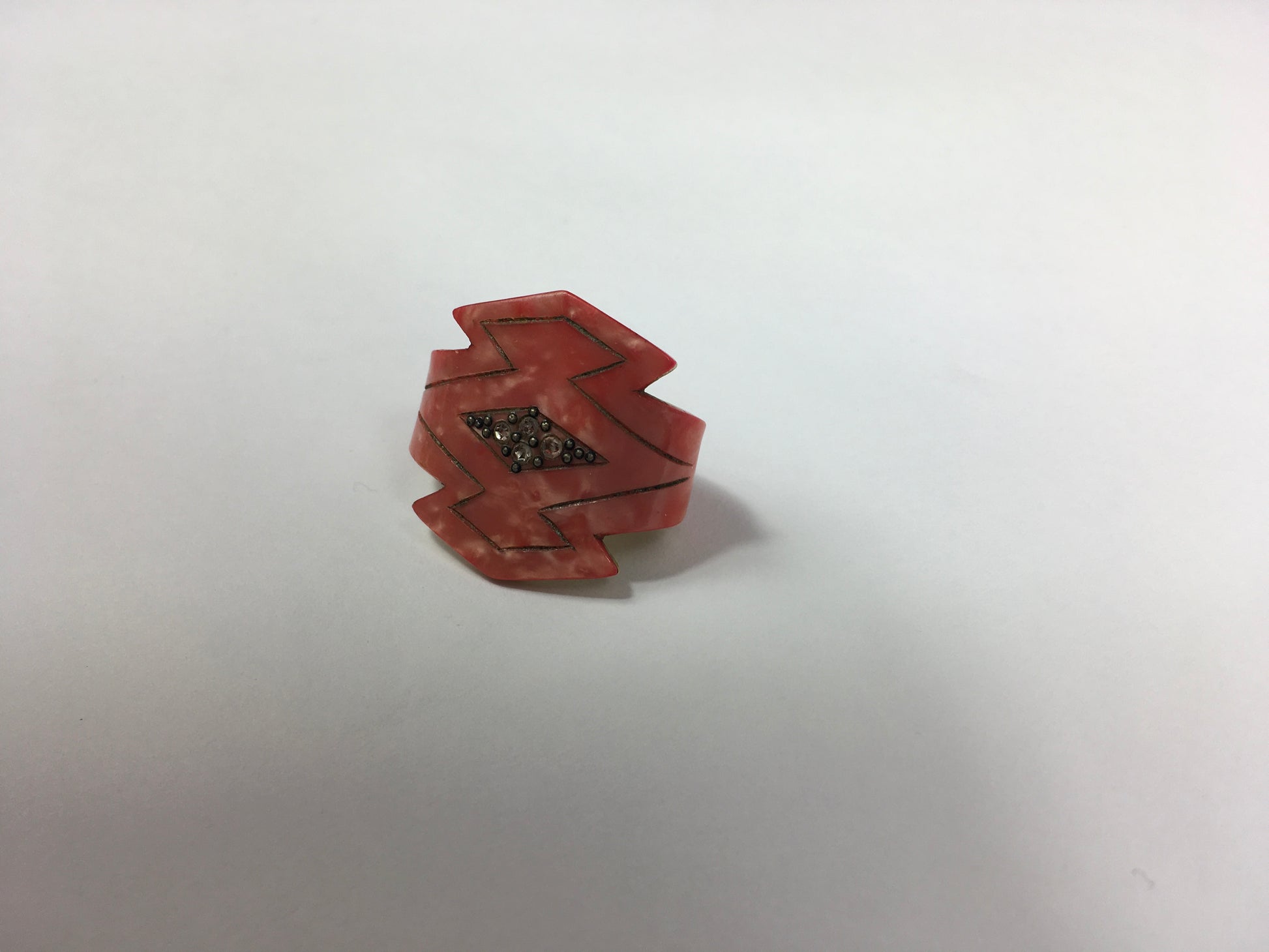 Original 1930’s Art Deco Celluloid Scarf Ring - In A Beautiful Coral Colouring With Paste Detailing