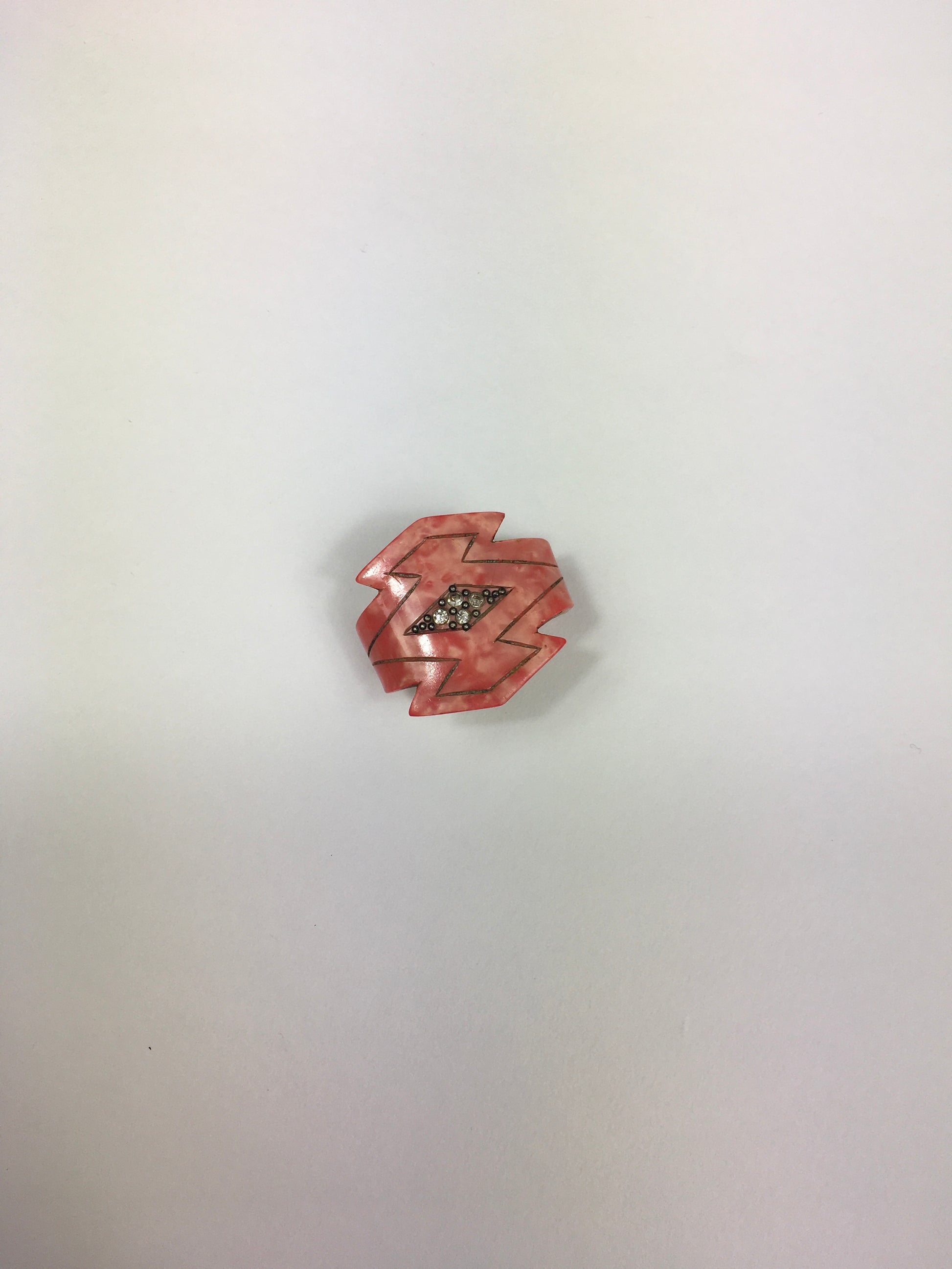 Vintage 1930’s Art Deco celluloid scarf ring in a beautiful coral colouring with inset paste detailing. A lovely addition to a deco scarf if you wanted to wear it round the neck for some extra detailing and period authenticity.