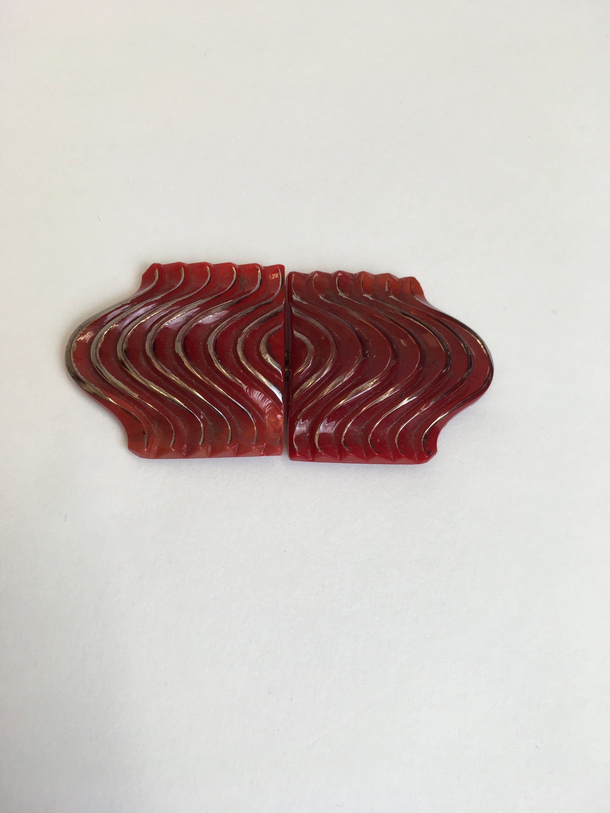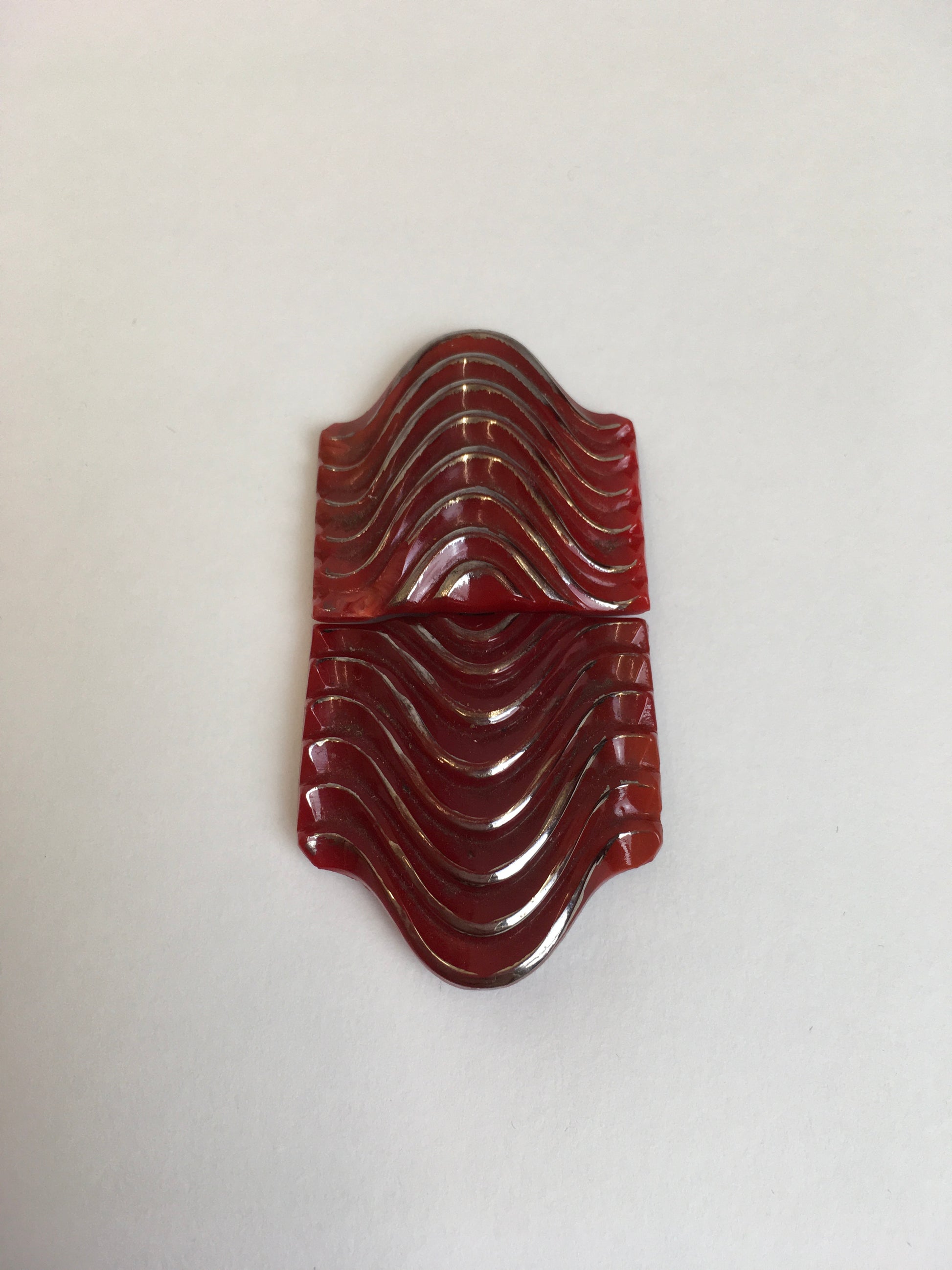 Vintage 1930’s Art Deco red glass buckle with fabulous detailing. In a lovely warm red this piece would look great as a statement on a plain or floral dress. A lovely piece to add to your haberdashery stash for an up and coming project.