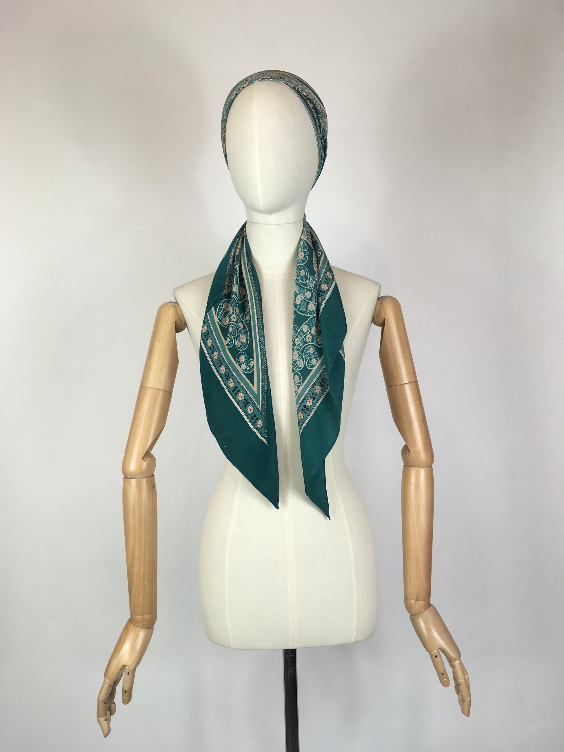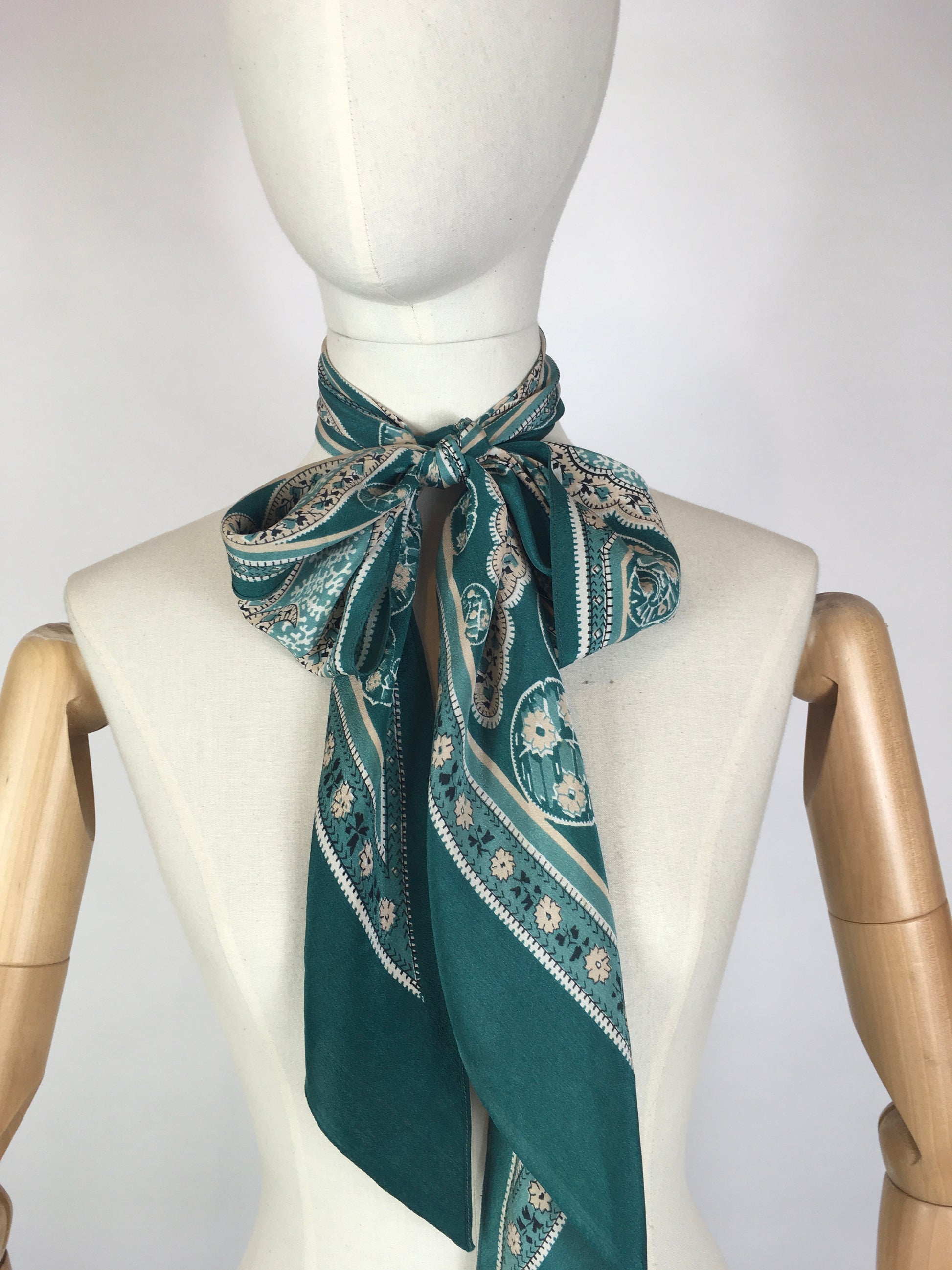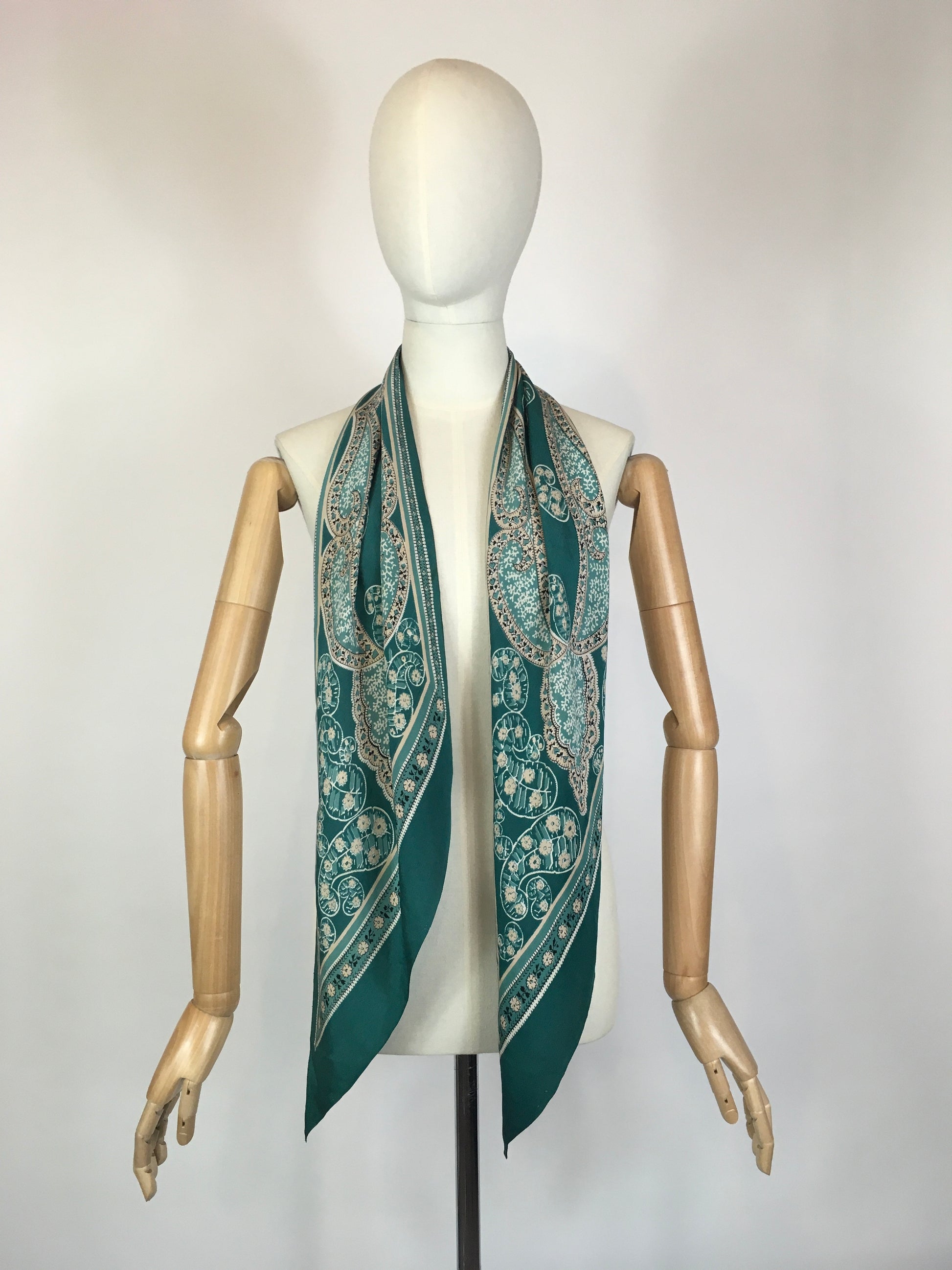 Vintage 1930’s beautiful deco pointed scarf in an exquisite colour way of rich jade green, pastel pink, ivory and black with an almost paisley and floral print. Made from a flowing silk crepe, this is a stunning piece. Measuring 74’ total length this piece is very versatile, great to wear round the neck, in a bow, in the hair or even worn as a belt.
