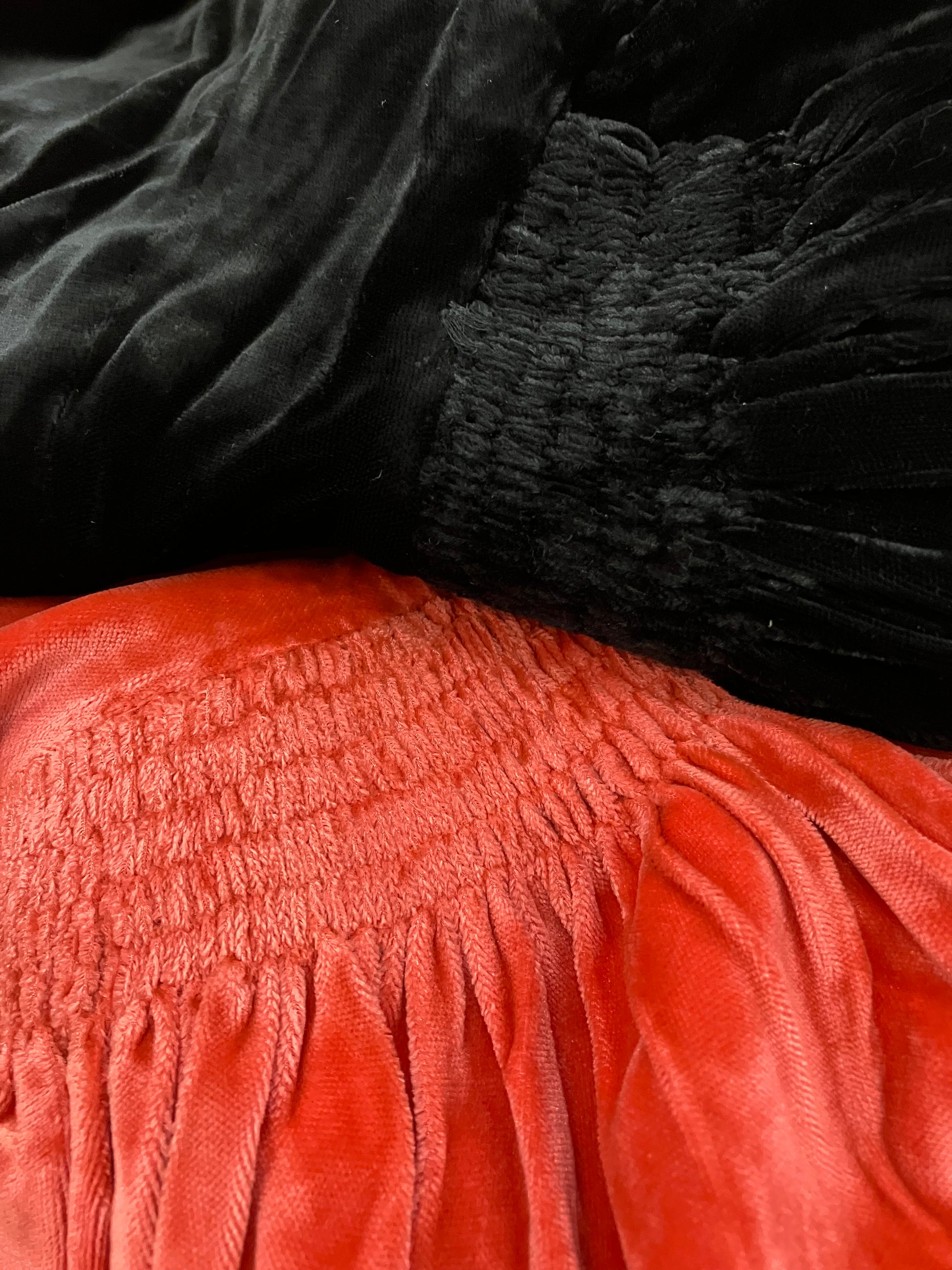The bolero, with its great shoulder pads, has amazing detailed ruching to the shoulders with slight short sleeves and is edge to edge. Fabulous that the bolero is reversible with black on red or visa versa.