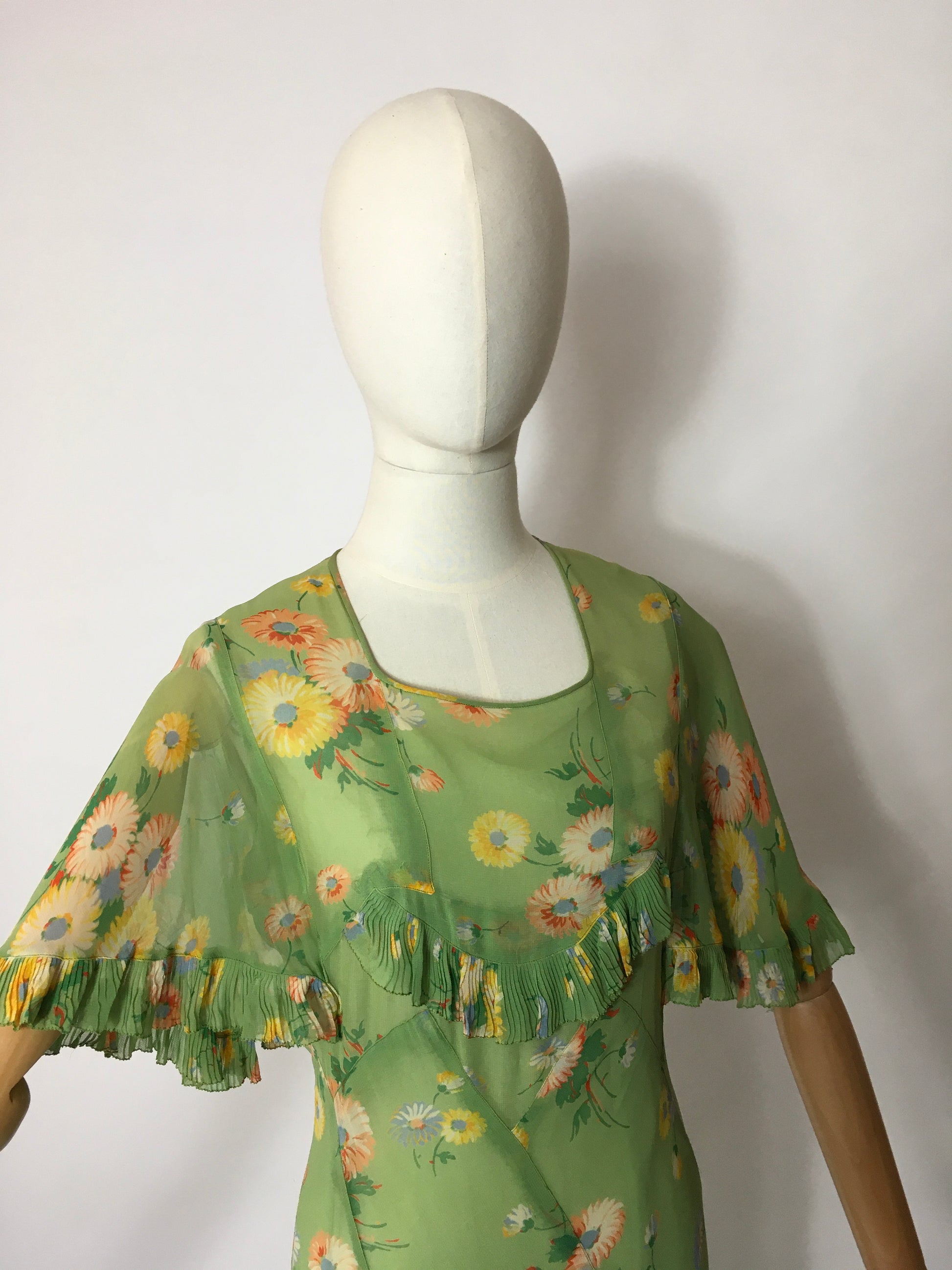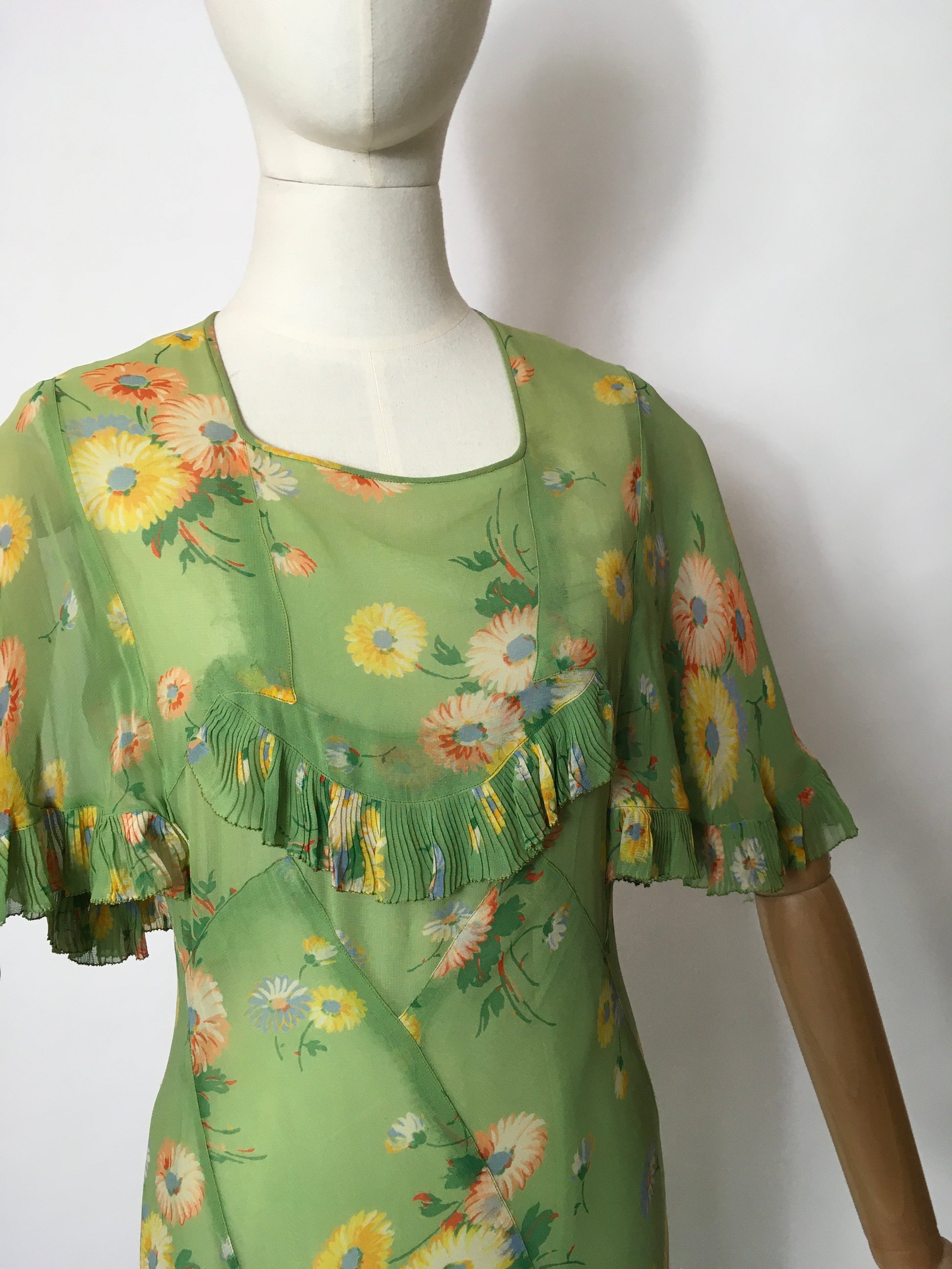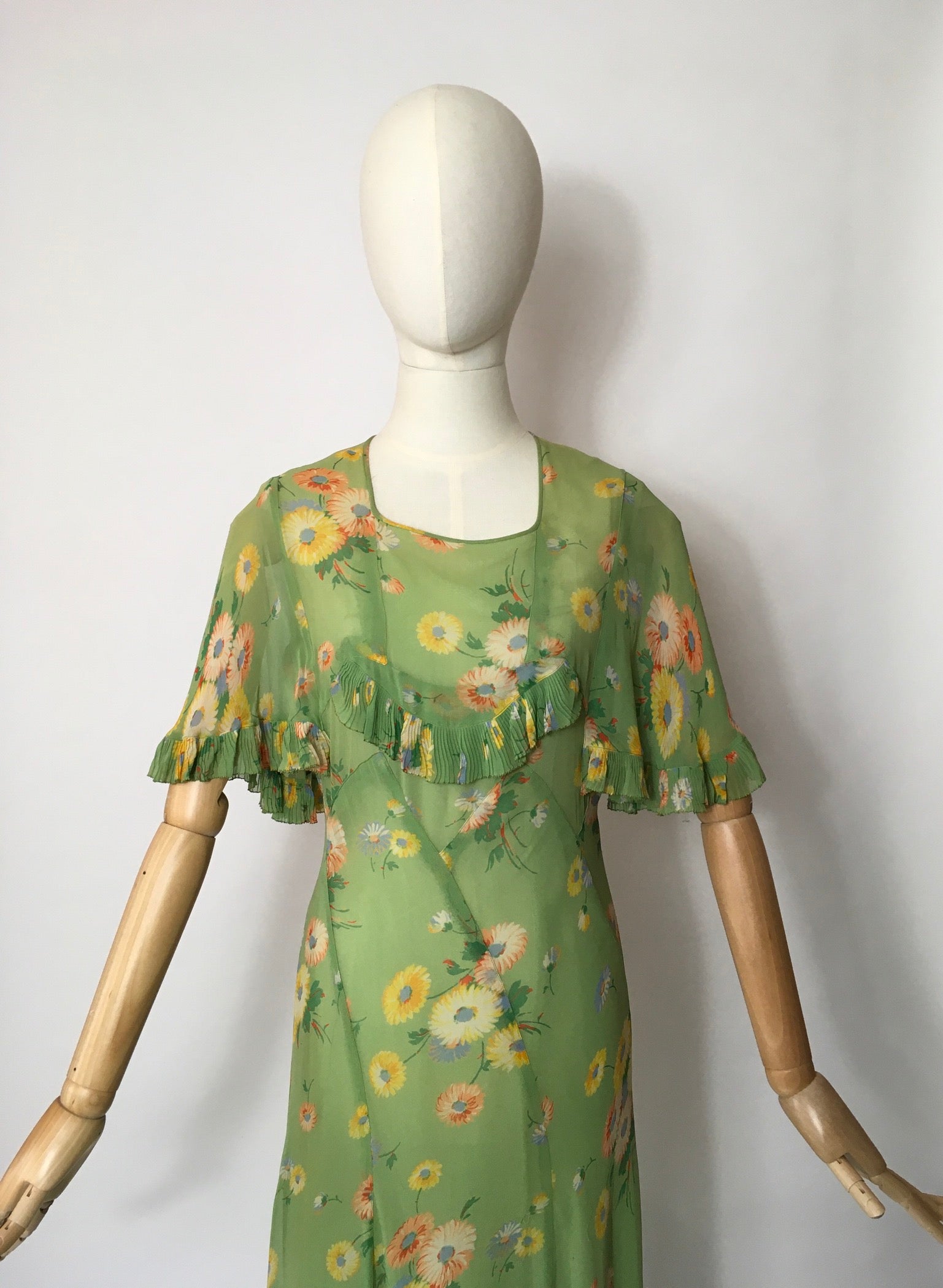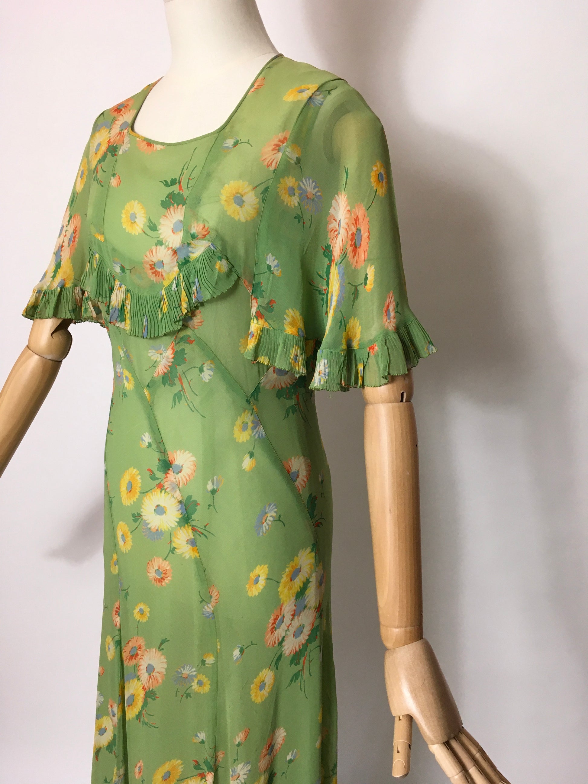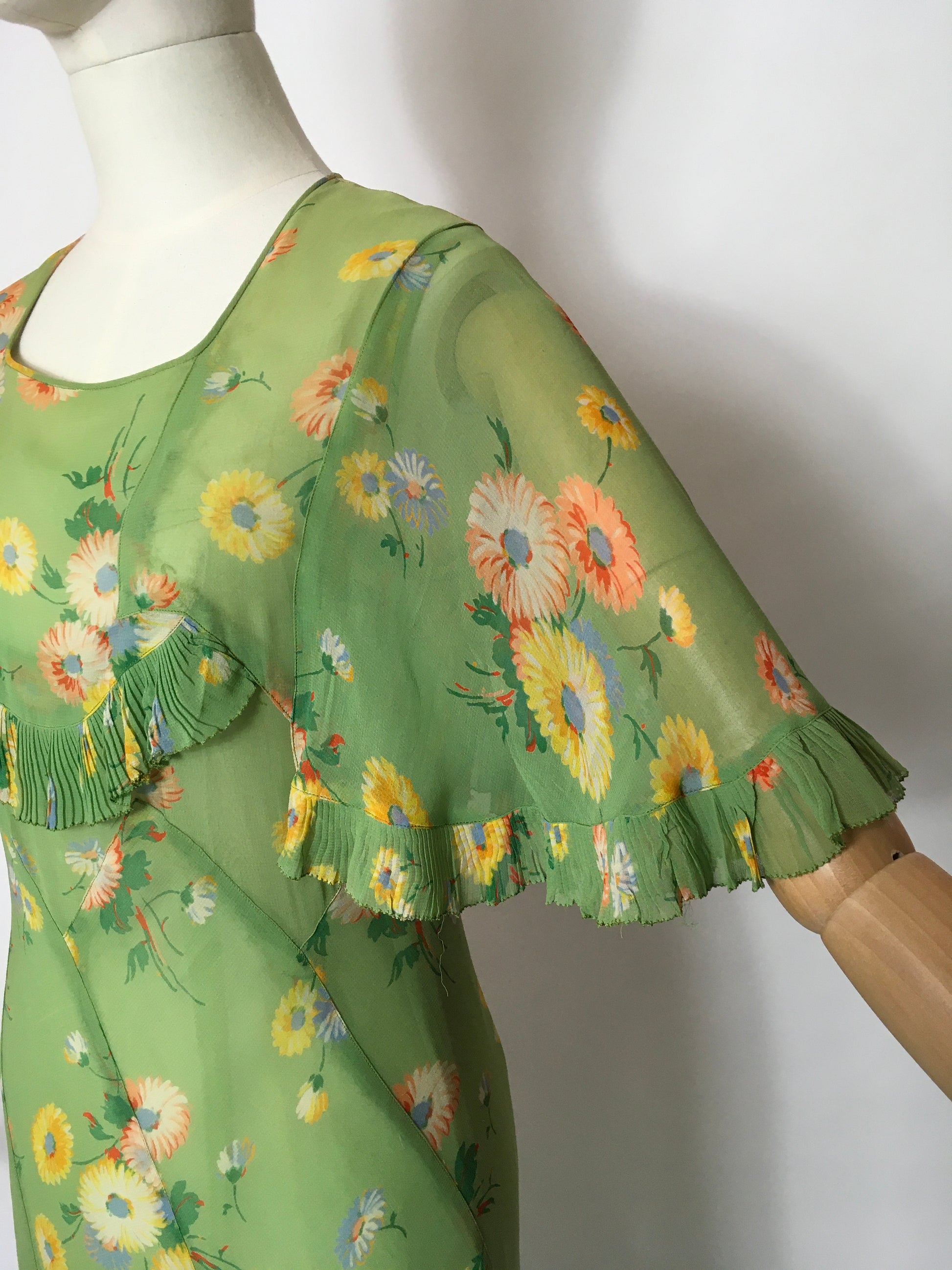 One of the pieces from our curated collection for the fashion show ‘ A look into 1930’s Fashions’ exclusive to the Festival of Vintage, York is this phenomenal 1930’s chiffon gown. The epitome of its era this exquisite dress features an effortless silhouette, with overlay sleeve with pleated detailing, almost square neckline which falls into a stylish bias cut flowing skirt. Full of the imagery of times gone by this dress oozes glimpses from summer lawn parties of the era and walks in the gardens.