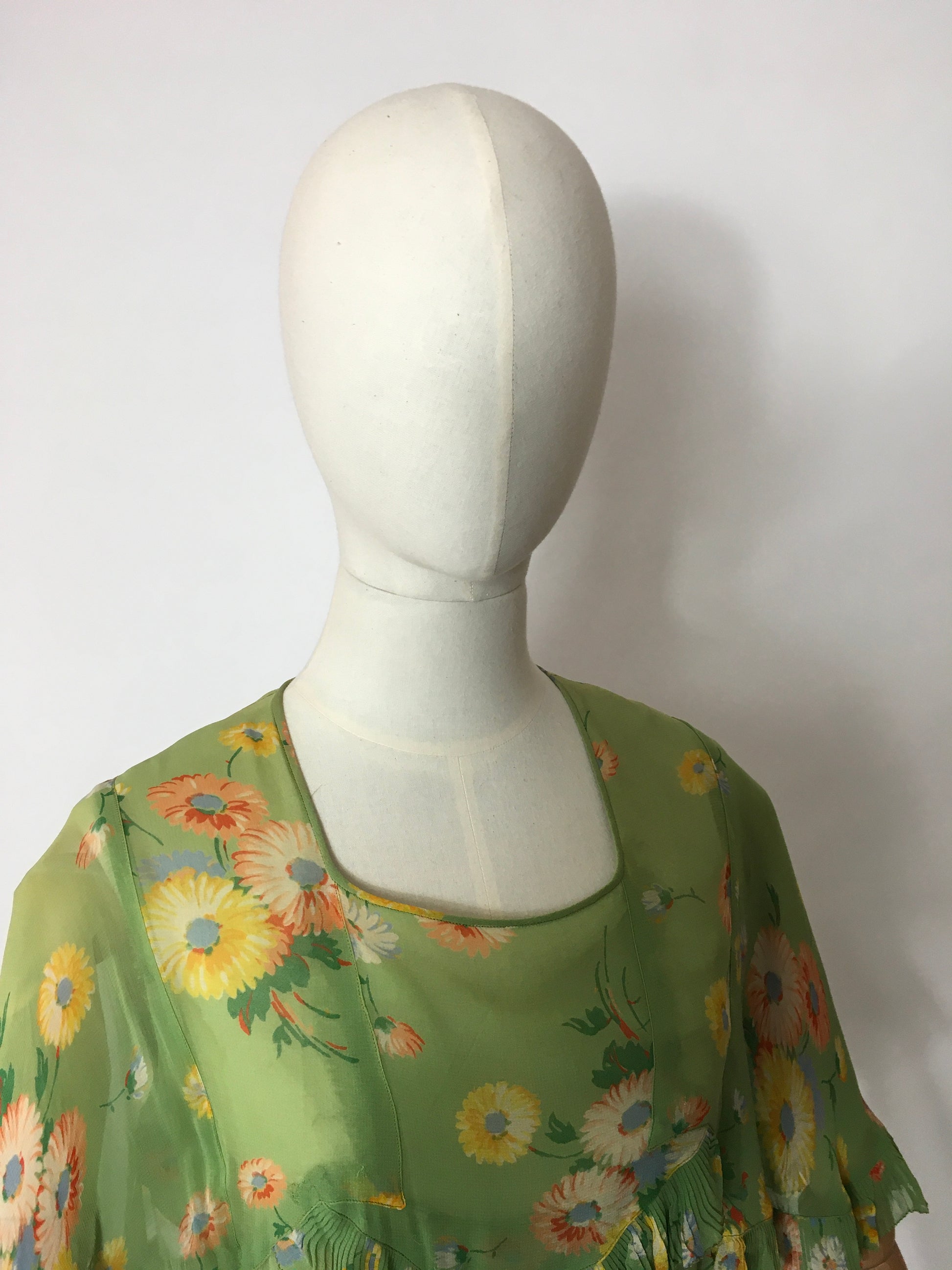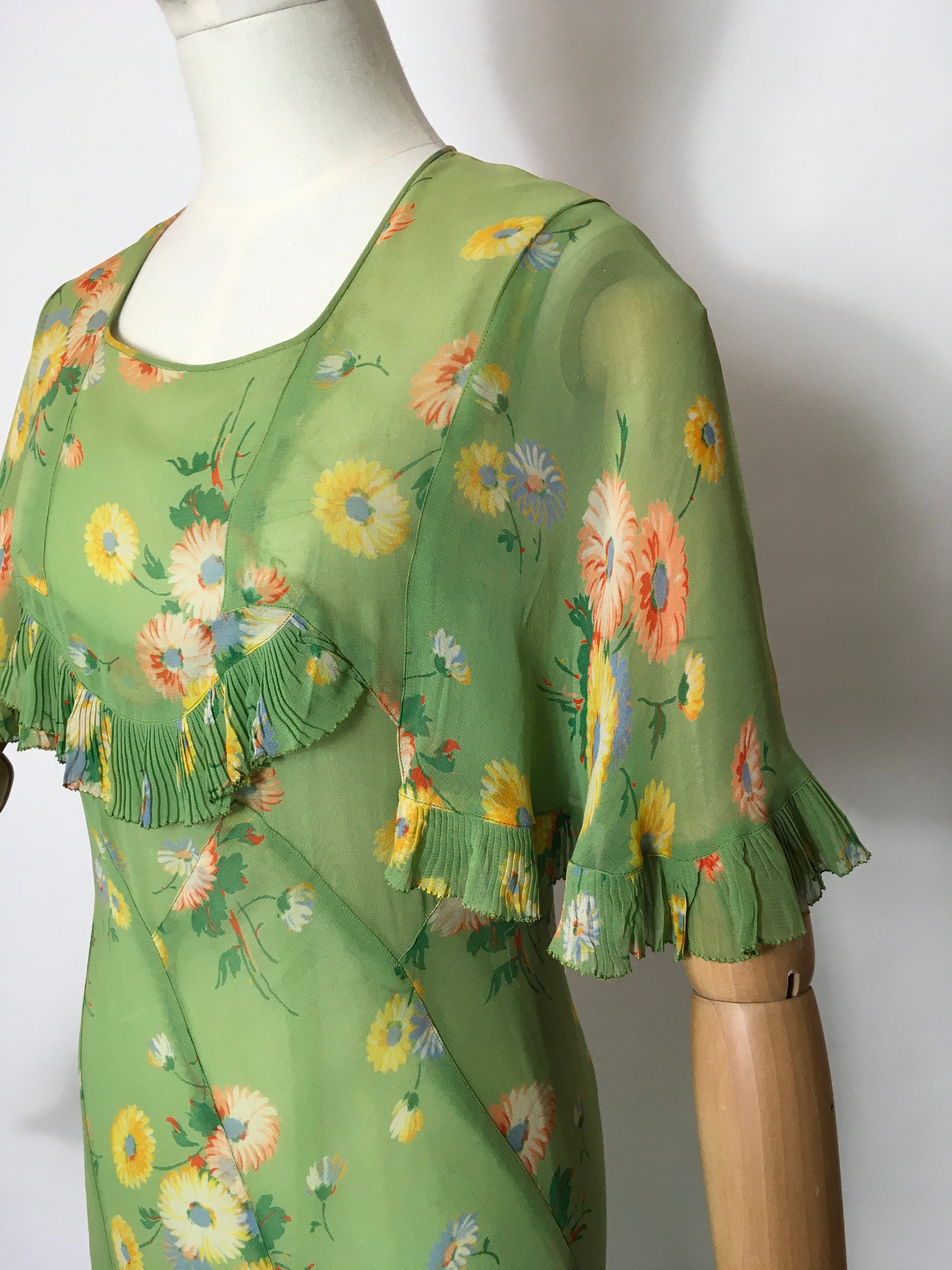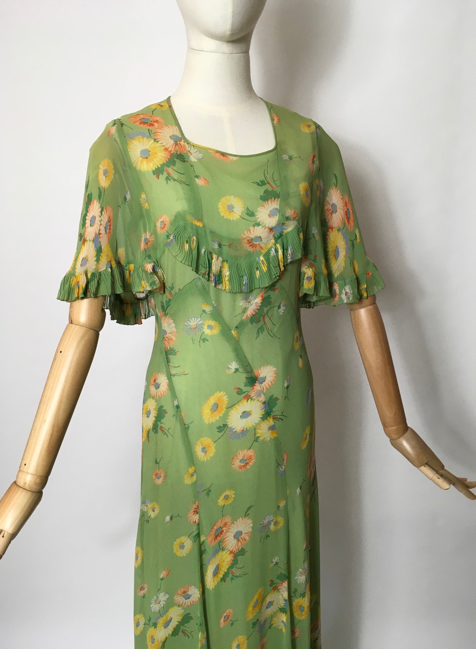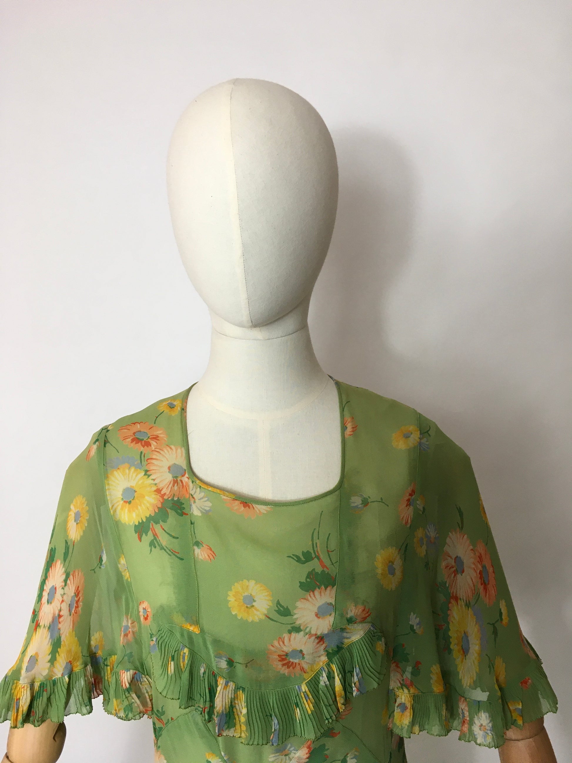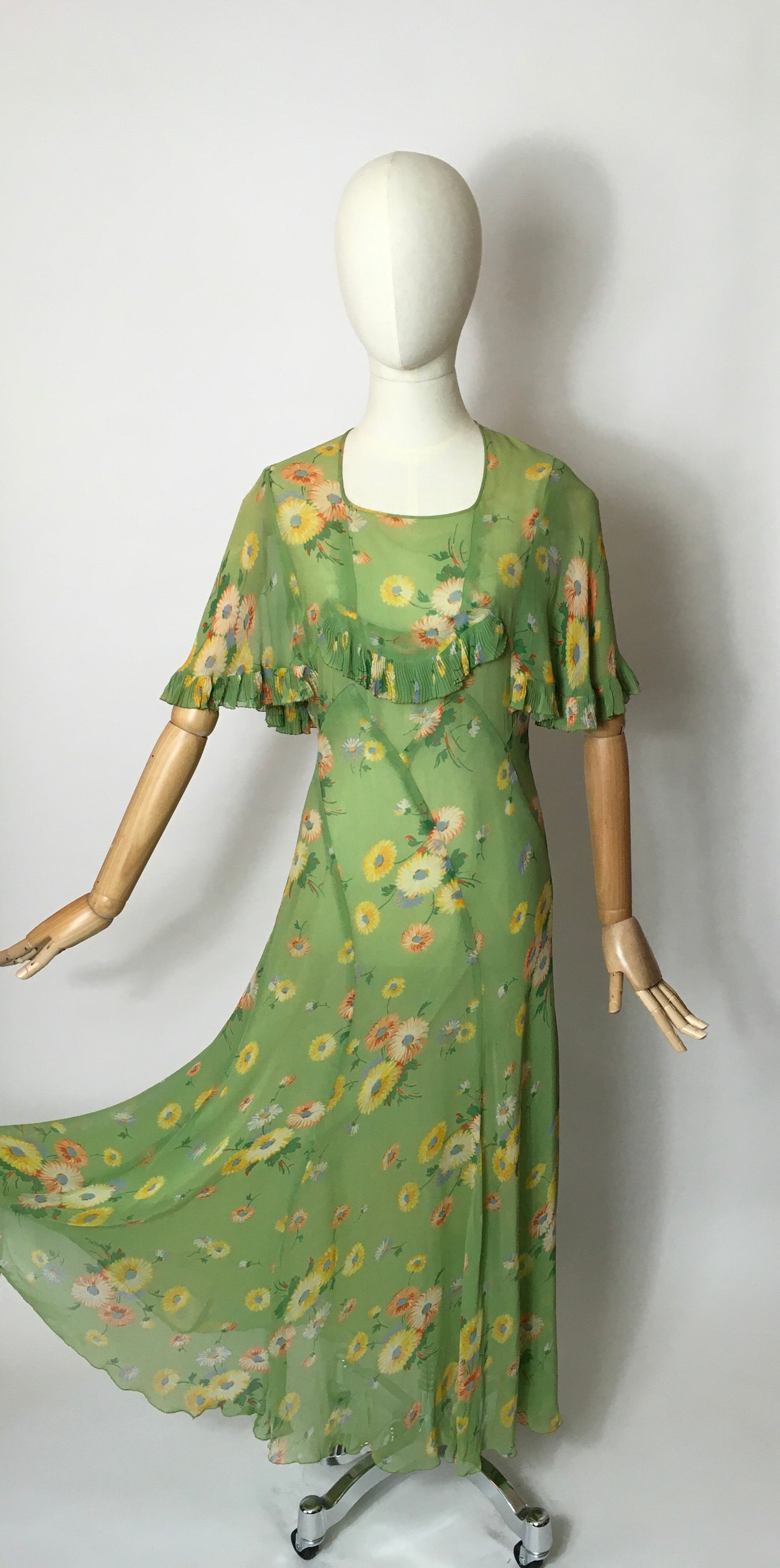 One of the pieces from our curated collection for the fashion show ‘ A look into 1930’s Fashions’ exclusive to the Festival of Vintage, York is this phenomenal 1930’s chiffon gown. The epitome of its era this exquisite dress features an effortless silhouette, with overlay sleeve with pleated detailing, almost square neckline which falls into a stylish bias cut flowing skirt. Full of the imagery of times gone by this dress oozes glimpses from summer lawn parties of the era and walks in the gardens.