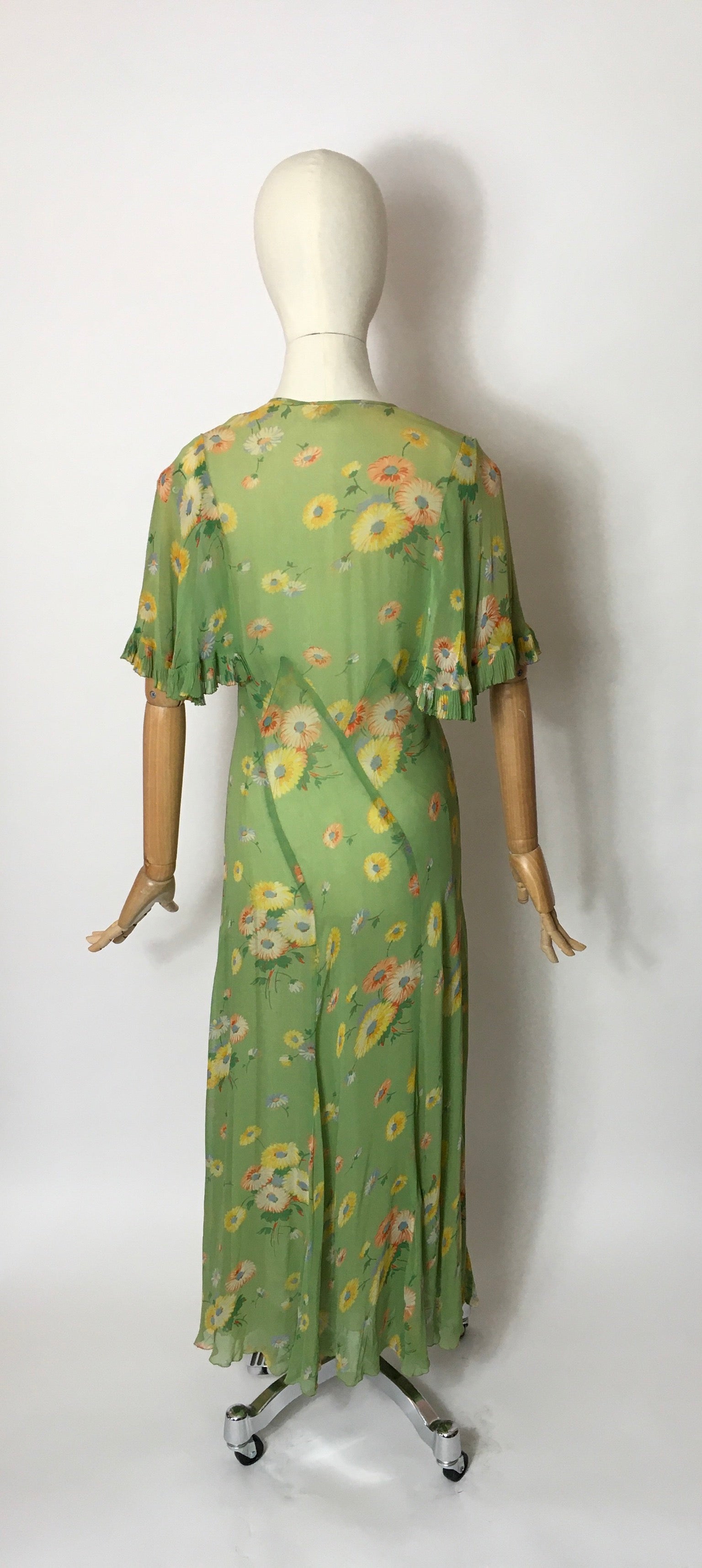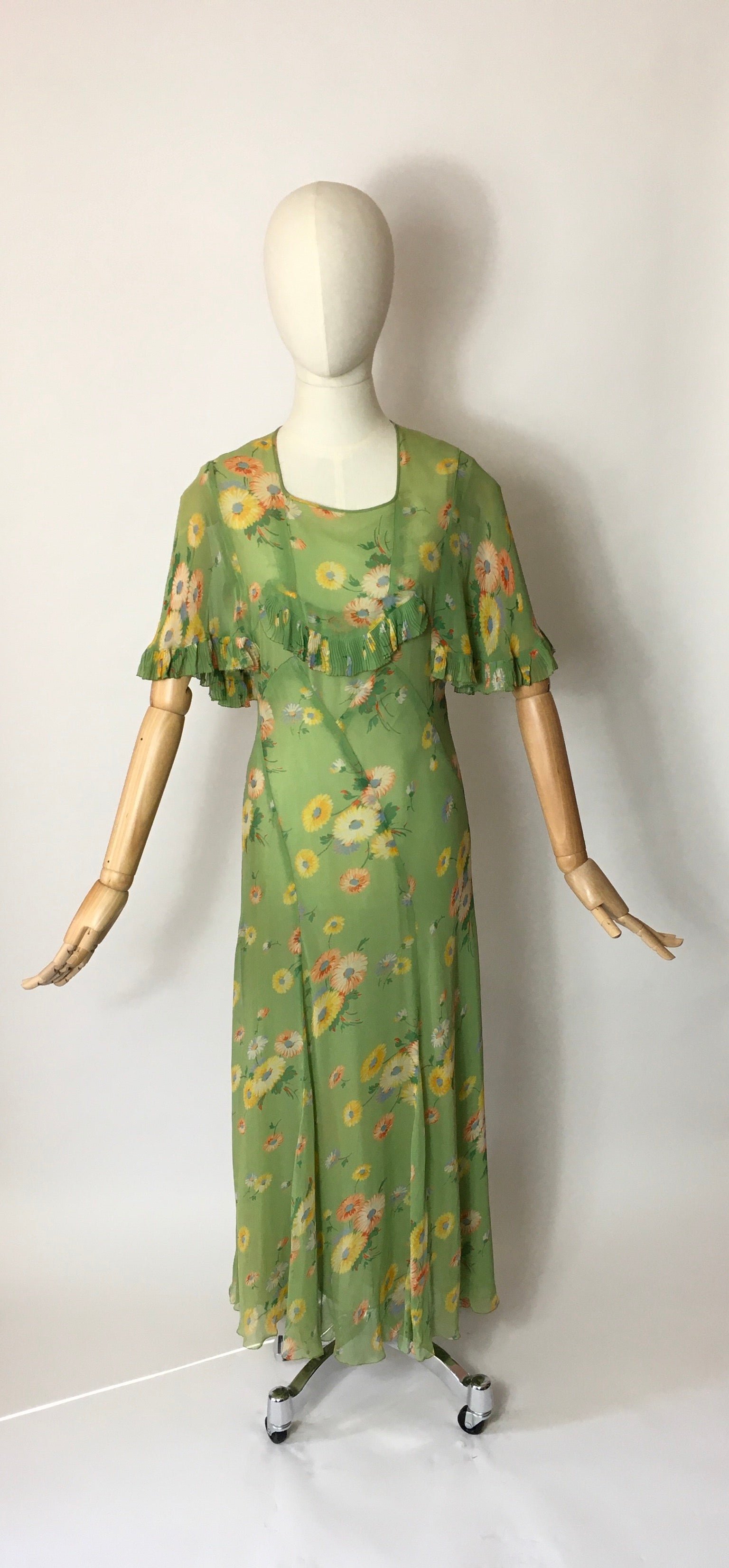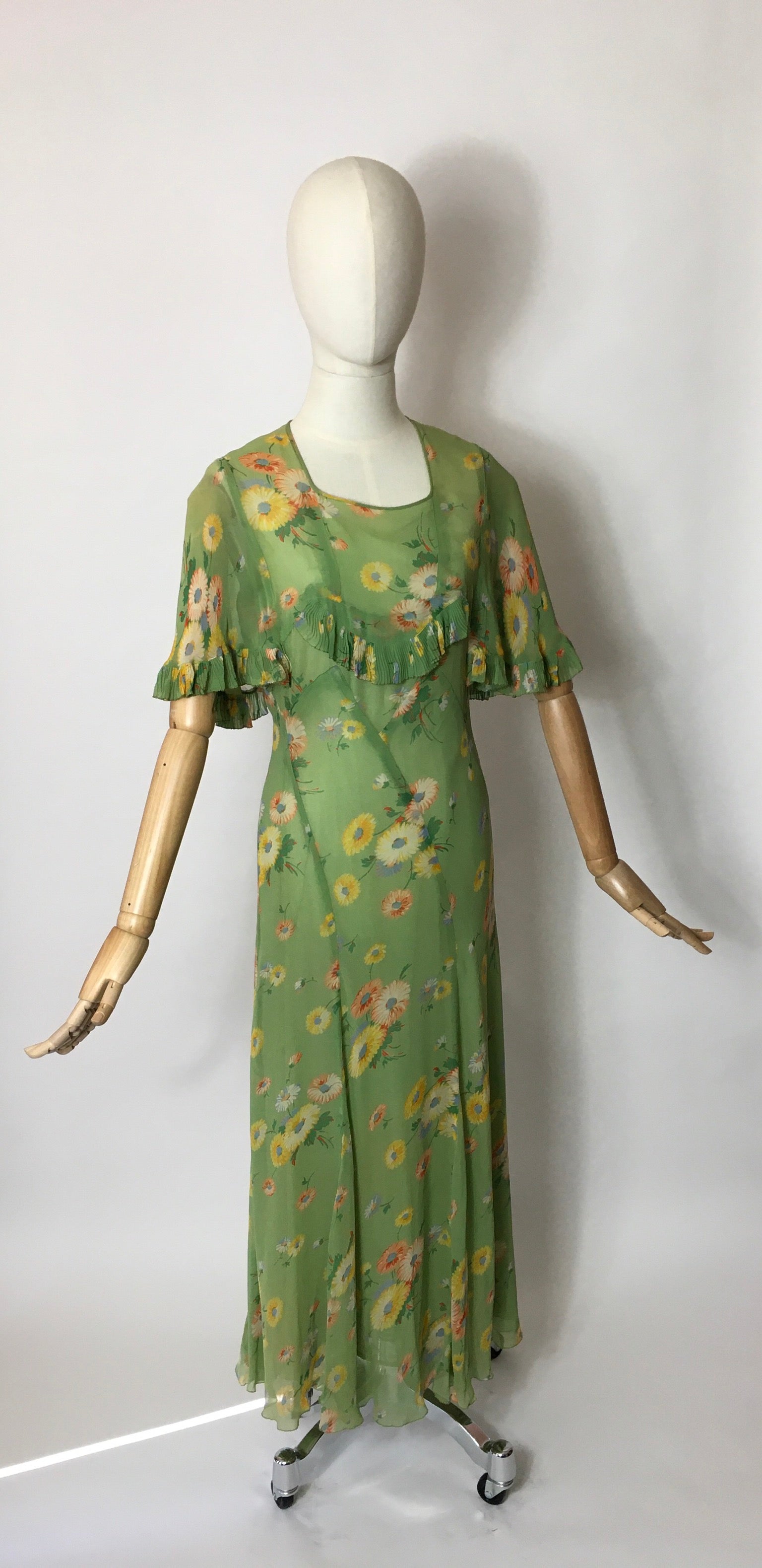 Original 1930’s Bias Cut Gown In An Exquisite Colour Pallet of Deco Green, soft blues, oranges and yellows - A Festival Of Vintage Fashion Show Exclusive