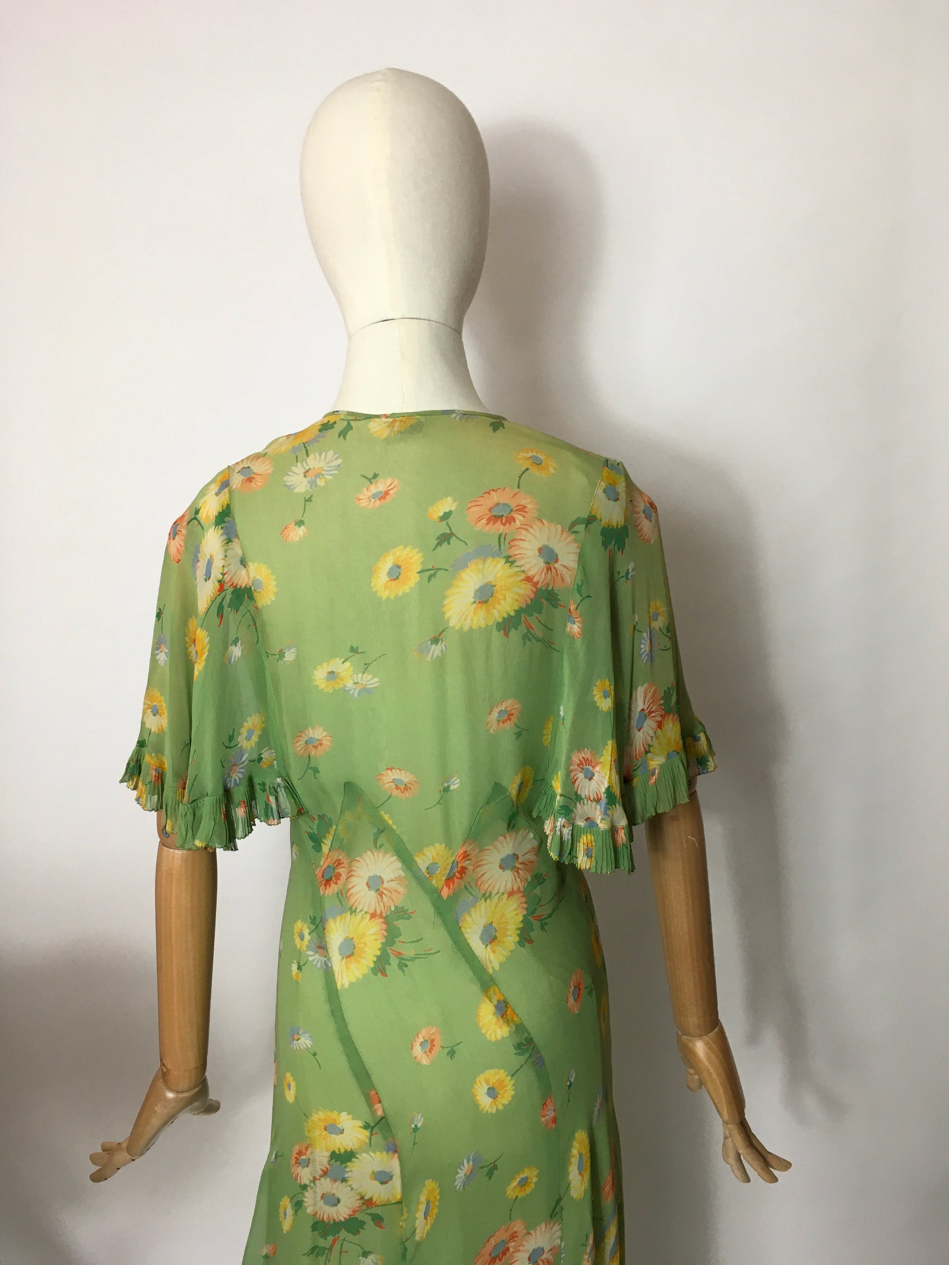 A piece we could lovingly look at for endless years due to its amazing fabric choice. A floral chiffon in the perfect 30’s green with pops of soft blues, oranges and yellows. This dress is pure quality and is fully lined in a lovely green chiffon. This piece will make a fabulous addition to any vintage lover. Wouldn’t look out of place worn with a huge straw brimmed hat, crochet gloves and a parasol in the summer months.