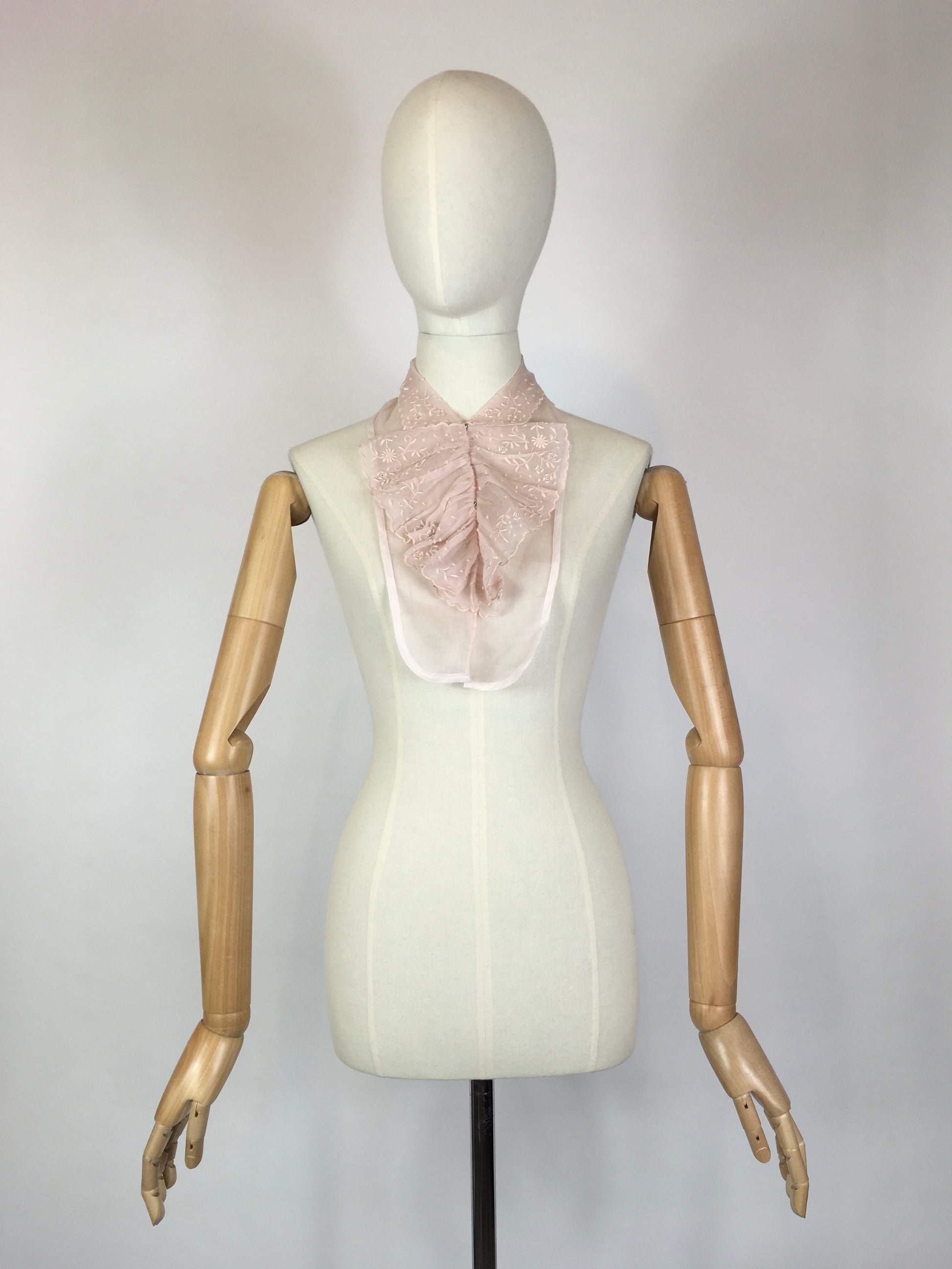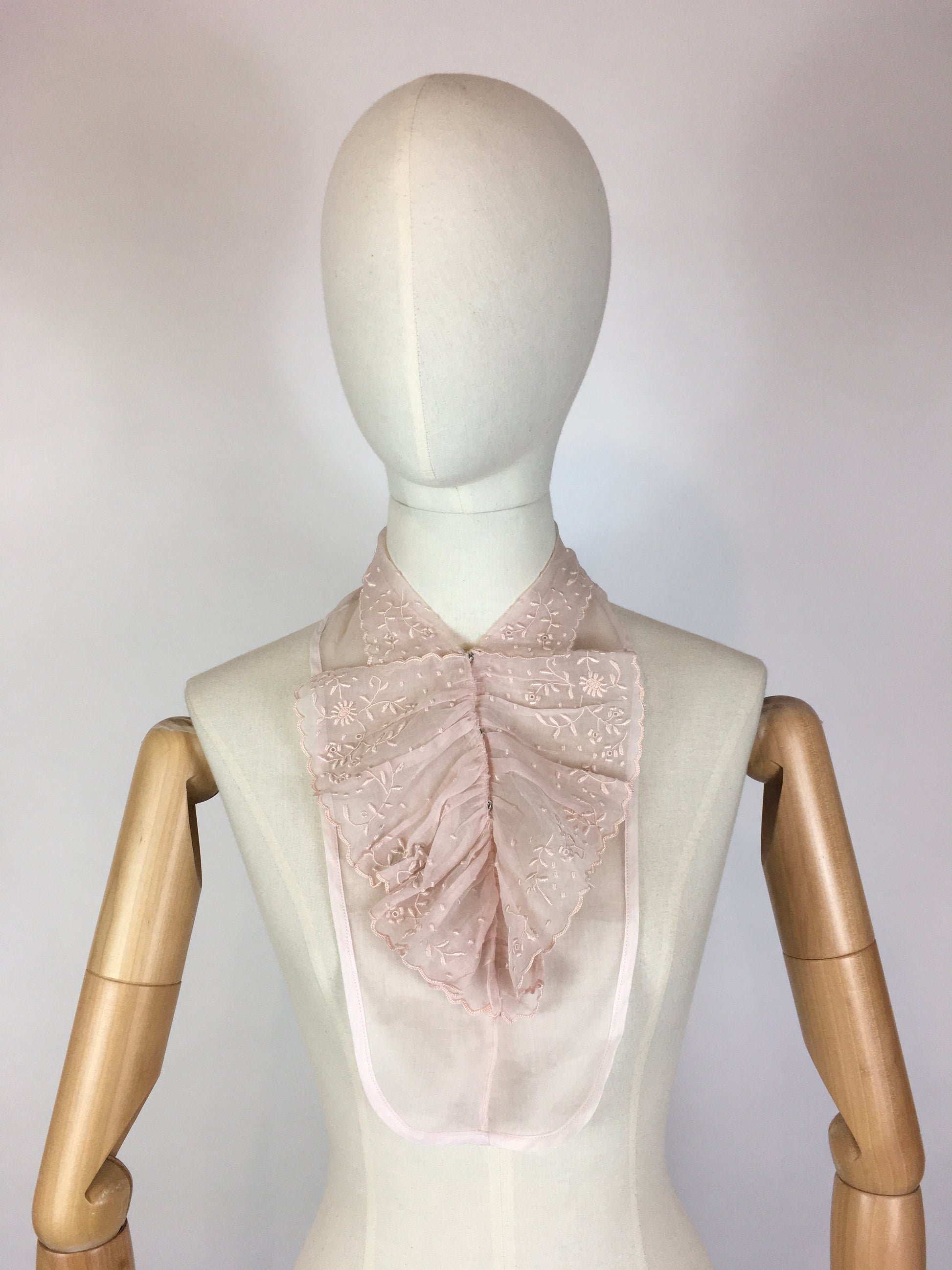 Vintage 1930’s beautiful fine chiffon dickie with Broderie anglaise trim in a soft powdered pink made by Saks Fifth Avenue. Designed to be worn underneath suits for extra detailing without expense. A lovely soft detailing.