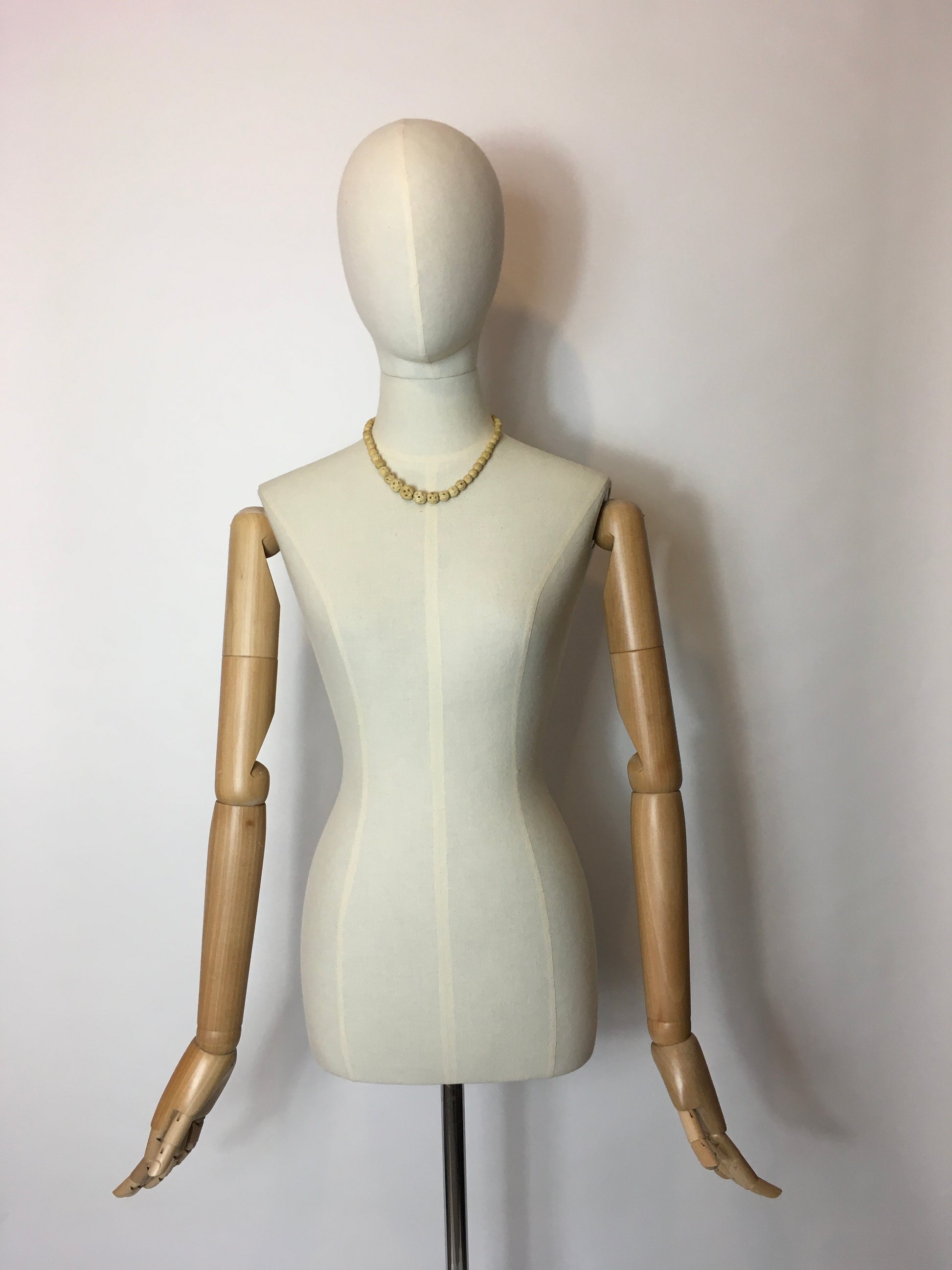 Part of our curated collection from the fashion show ‘ A look into 1930’s Fashions ‘ exclusive to the Festival Of Vintage, York we have this beautiful 1930’s celluloid necklace. In a lovely buttermilk cream with carved detailing to the beadwork and a screw back fastening.
