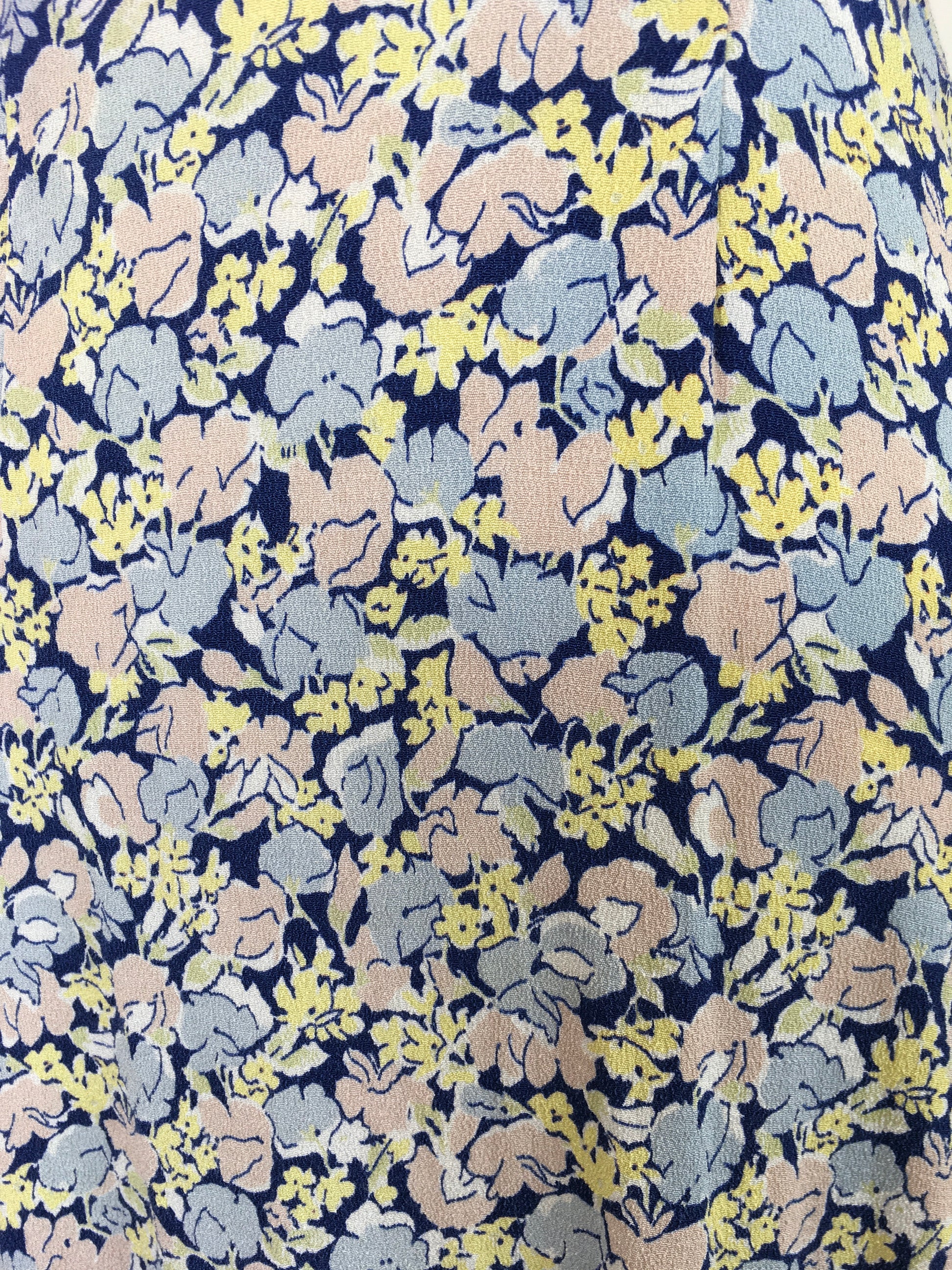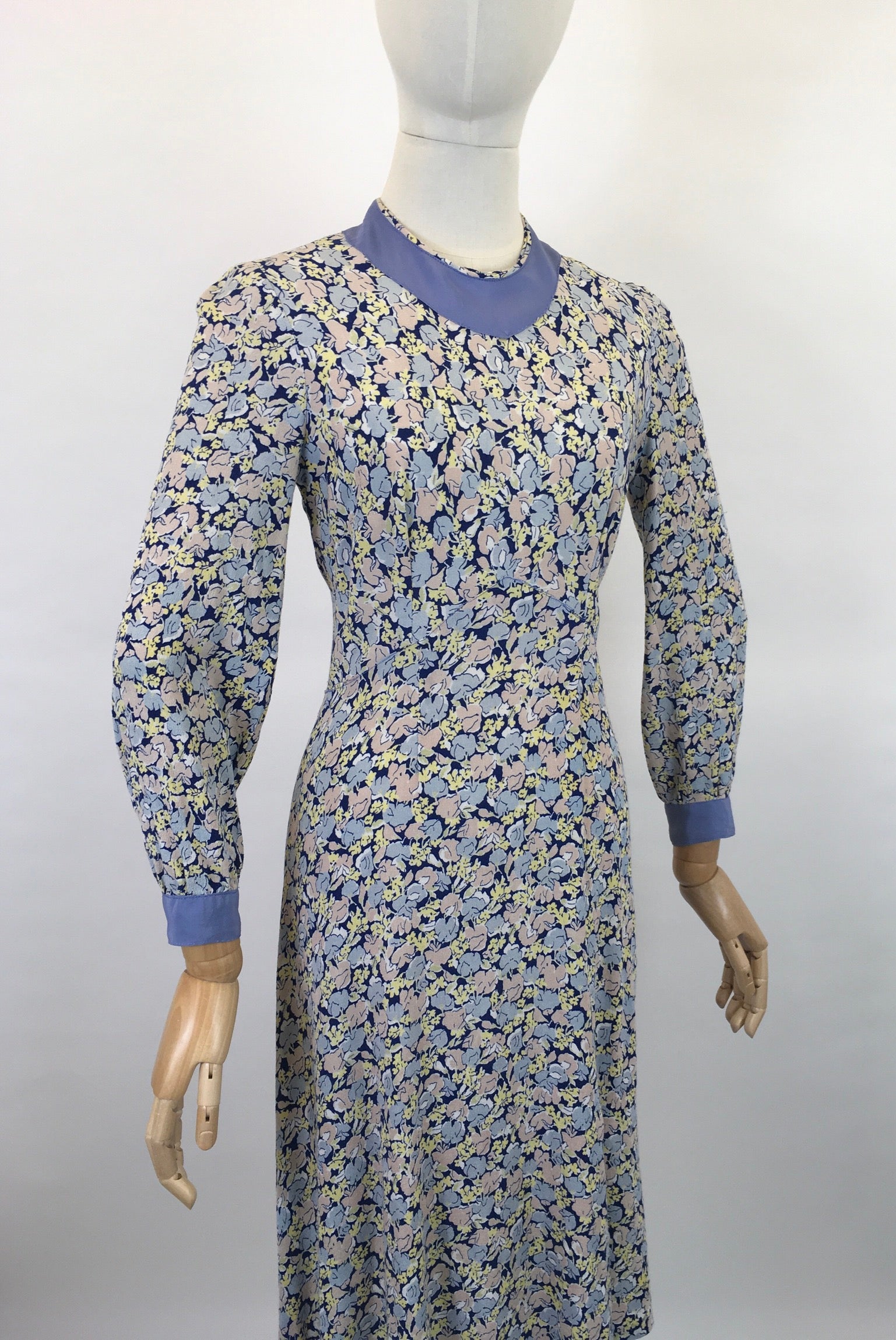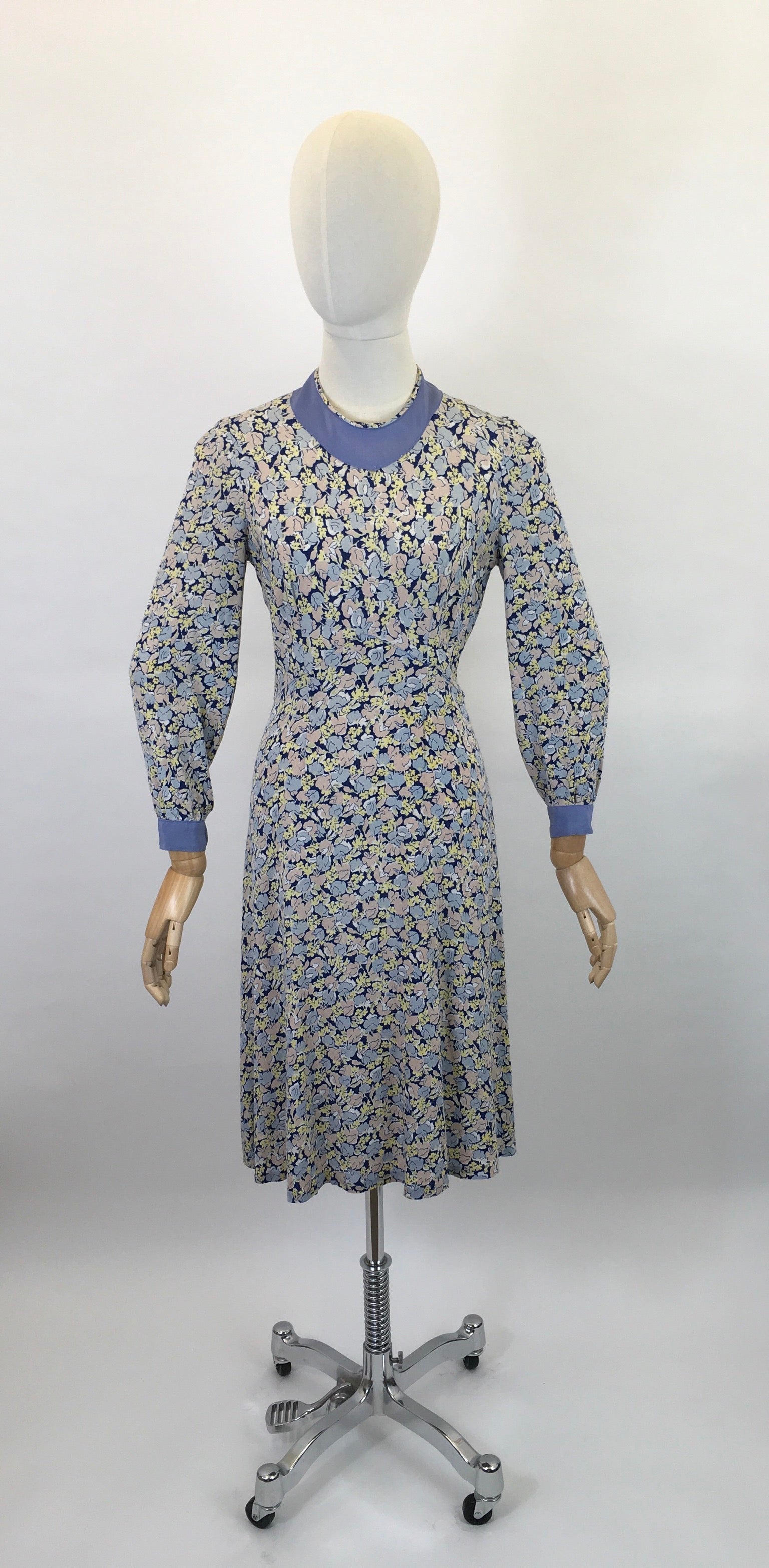 Original 1930’s Crepe Floral Day Dress - In A Pallet of Soft Pastels : Powdered Blue, Delicate Rose and Buttery Yellow