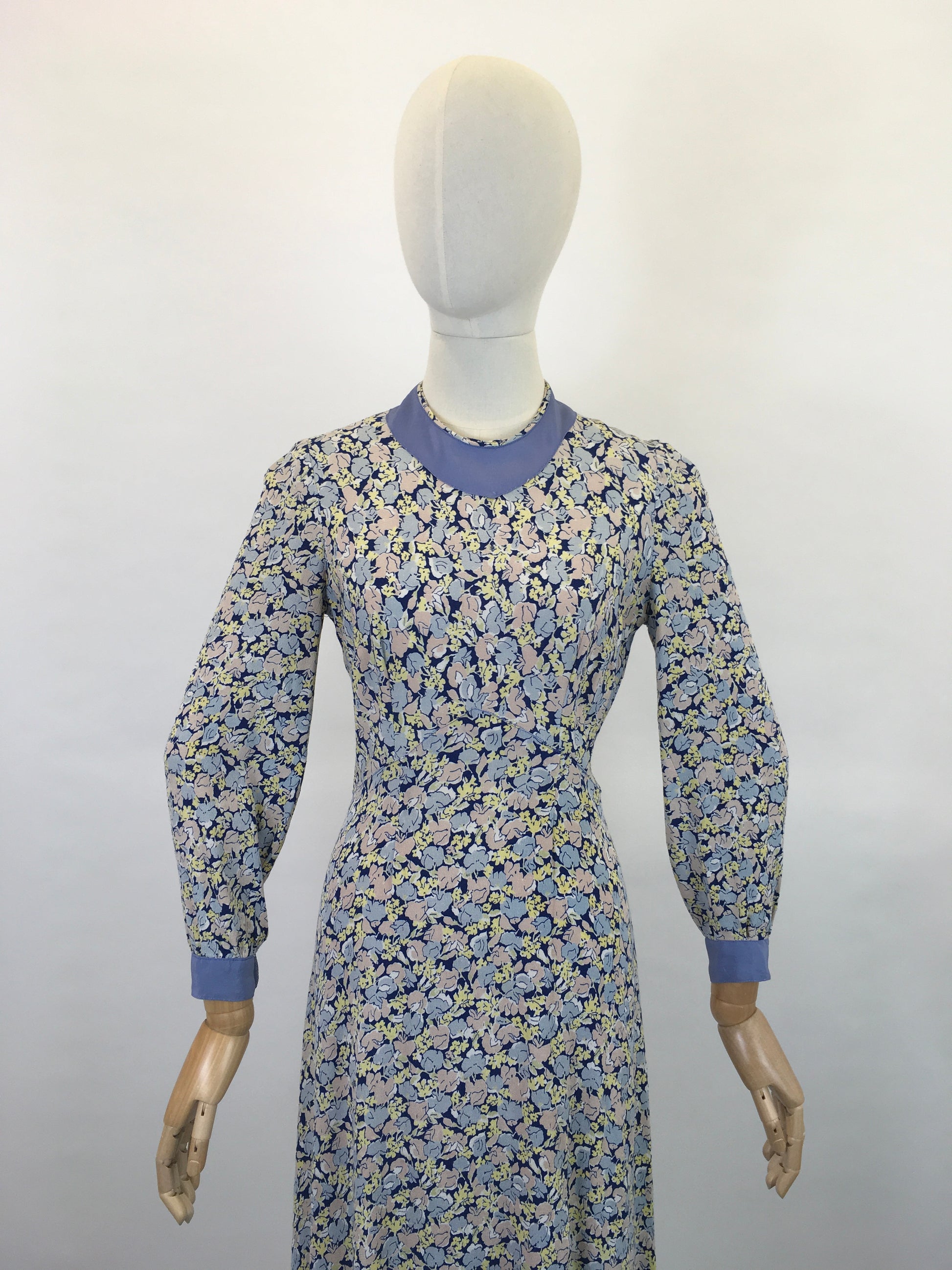 Vintage 1930’s darling day dress in a beautiful floral crepe in soft pastels. Hues of soft powdered blues, delicate rose and buttery yellows create a very flattering colour palette. A simple yet elegant silhouette this dress features a high neck with contrast plain fabric detailing, long sleeves, bias cut and a metal back zip fastening. A stunning piece to wear on its own or fabulous paired with a 30’s summer coat, pixie hat and Mary Jane shoes.