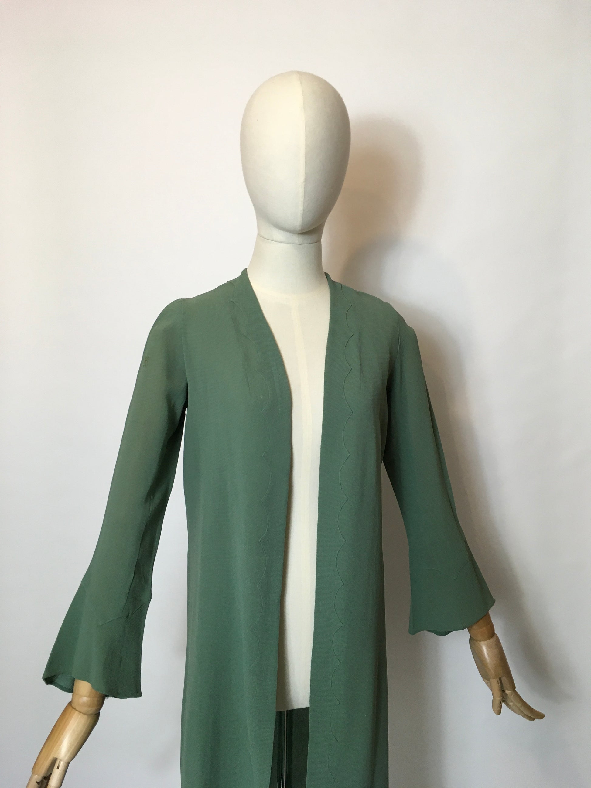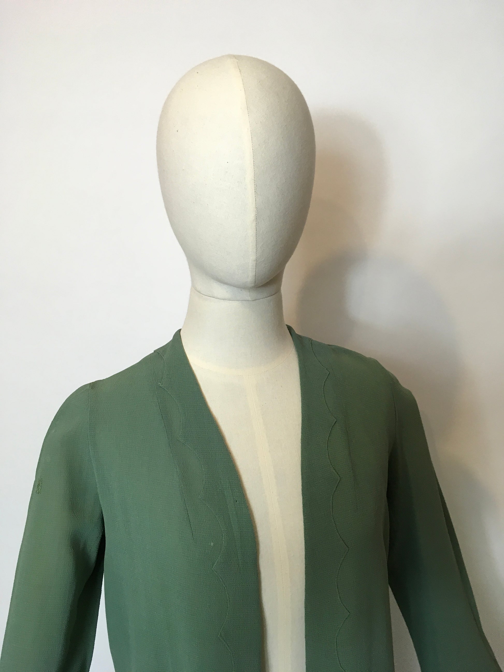 One of the pieces from our curated collection for the fashion show ‘ A look into 1930’s fashions ‘ exclusive to the Festival of Vintage, York is this beautiful 1930’s summer overcoat in the most delicate eau de nil crepe. Popular I’m the mid 1930’s the summer overcoat was a lightweight layer to keep you warm in the spring and autumnal months ... this iconic piece features a classic simple silhouette with flounced sleeves and fabulous deco detailing stitching.