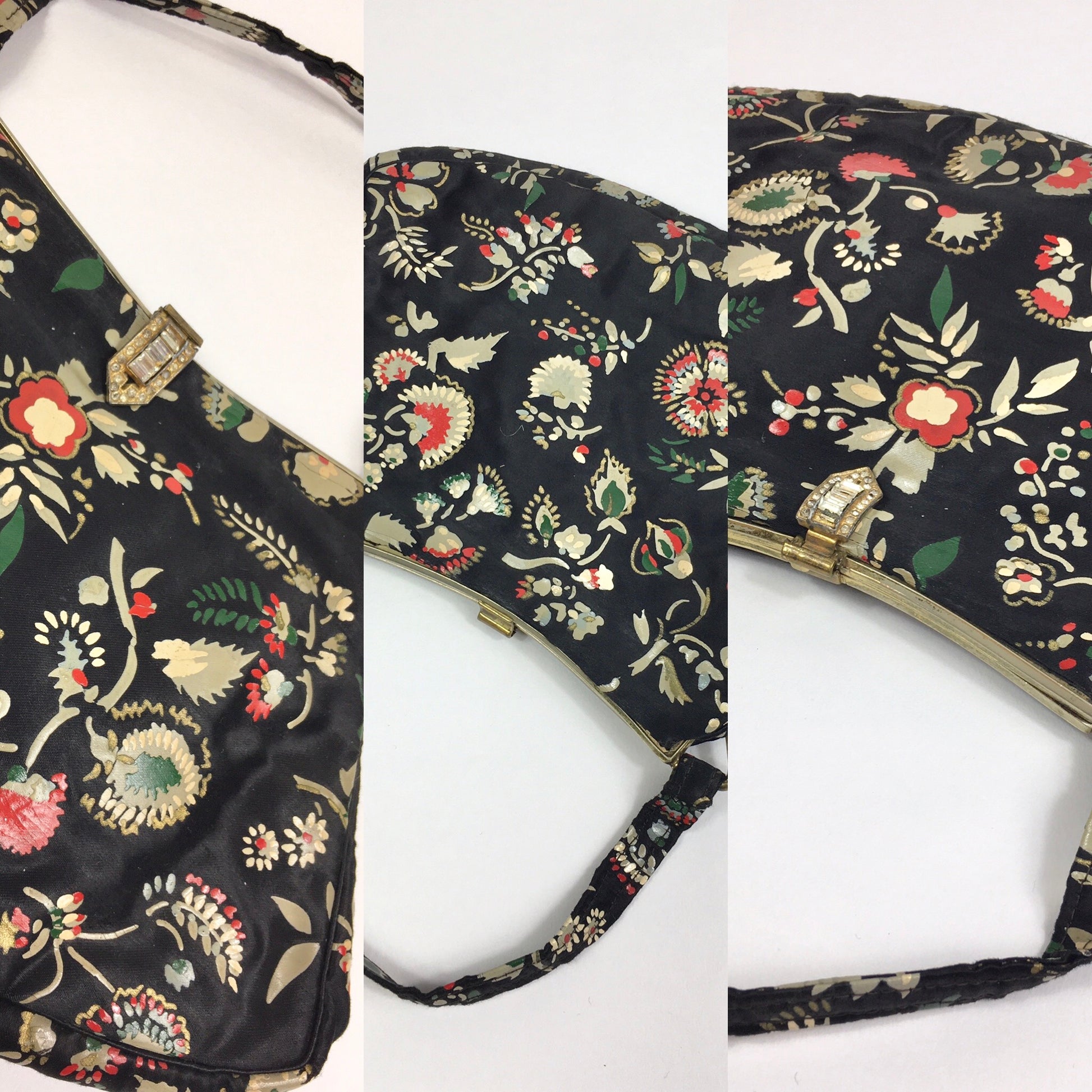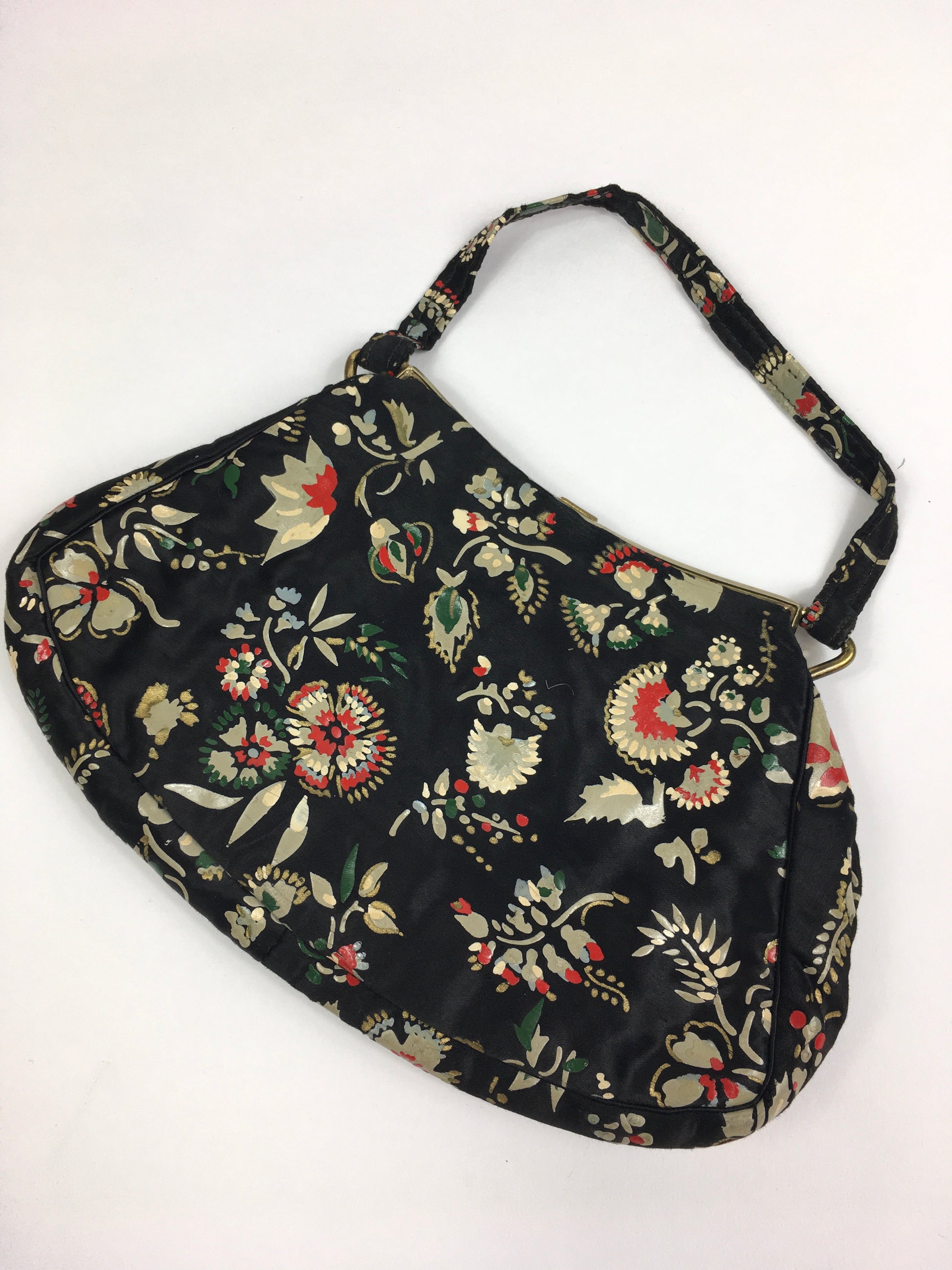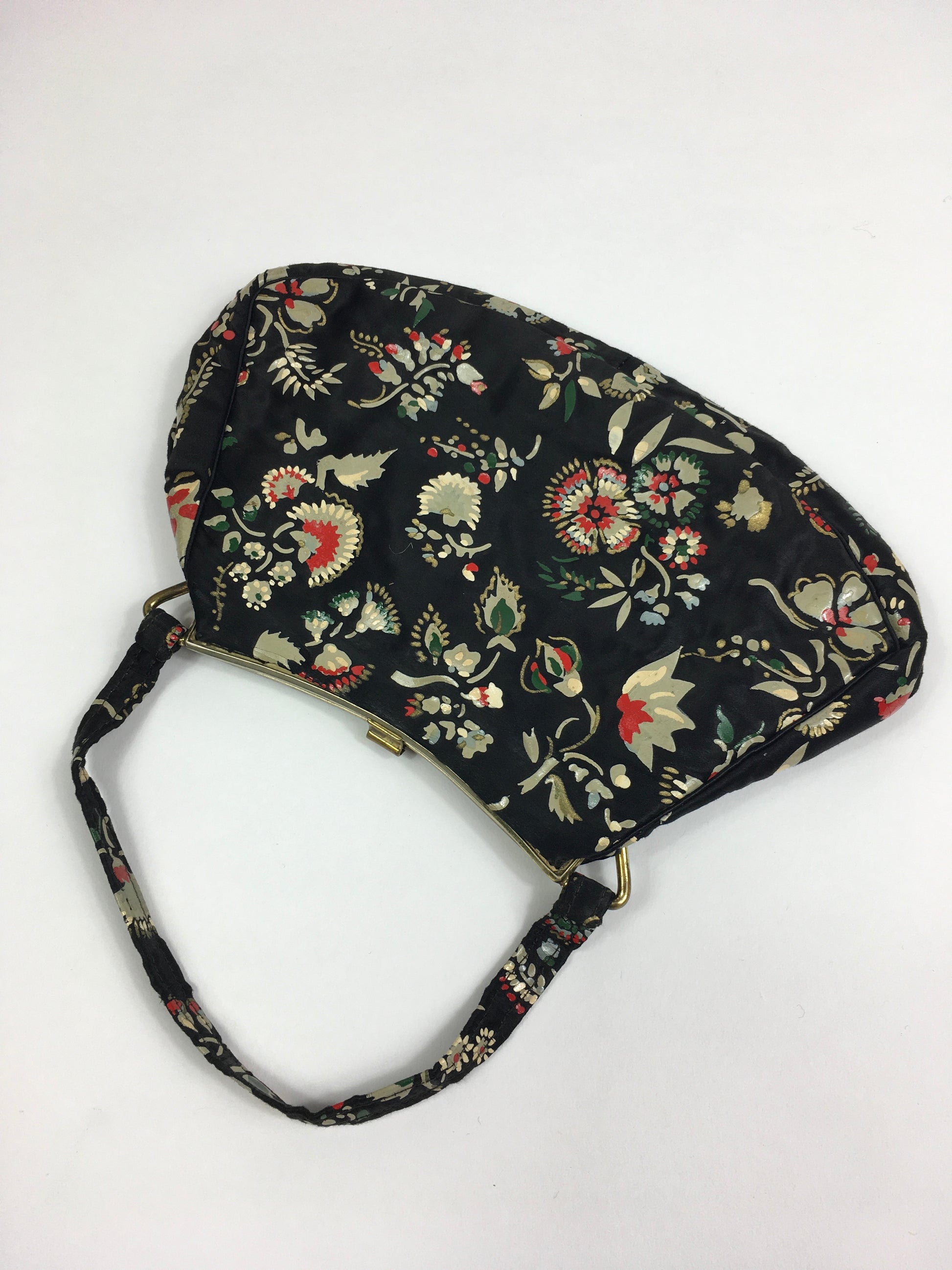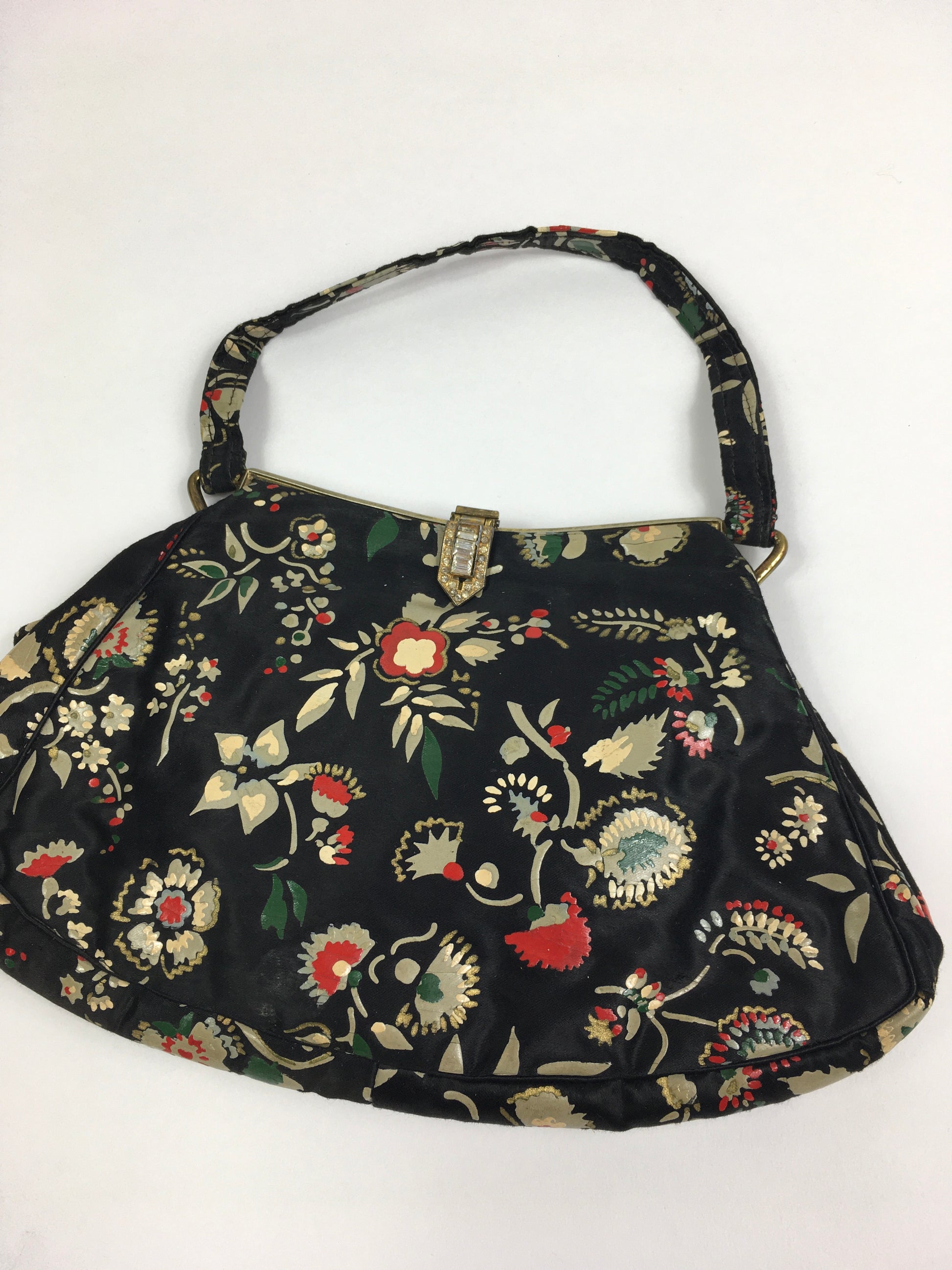 Vintage 1930’s exquisite evening bag in the most beautiful Handpainted delicate flora in reds, greens, whites and yellows. This darling bag has a matching handle, metal framework with Marquesite clasp and inside the bag has 2 internal pockets. This piece is the epitome of its era and oozes 1930’s Hollywood glamour. A stunning piece to accompany any outfit on an evening at the Ritz.