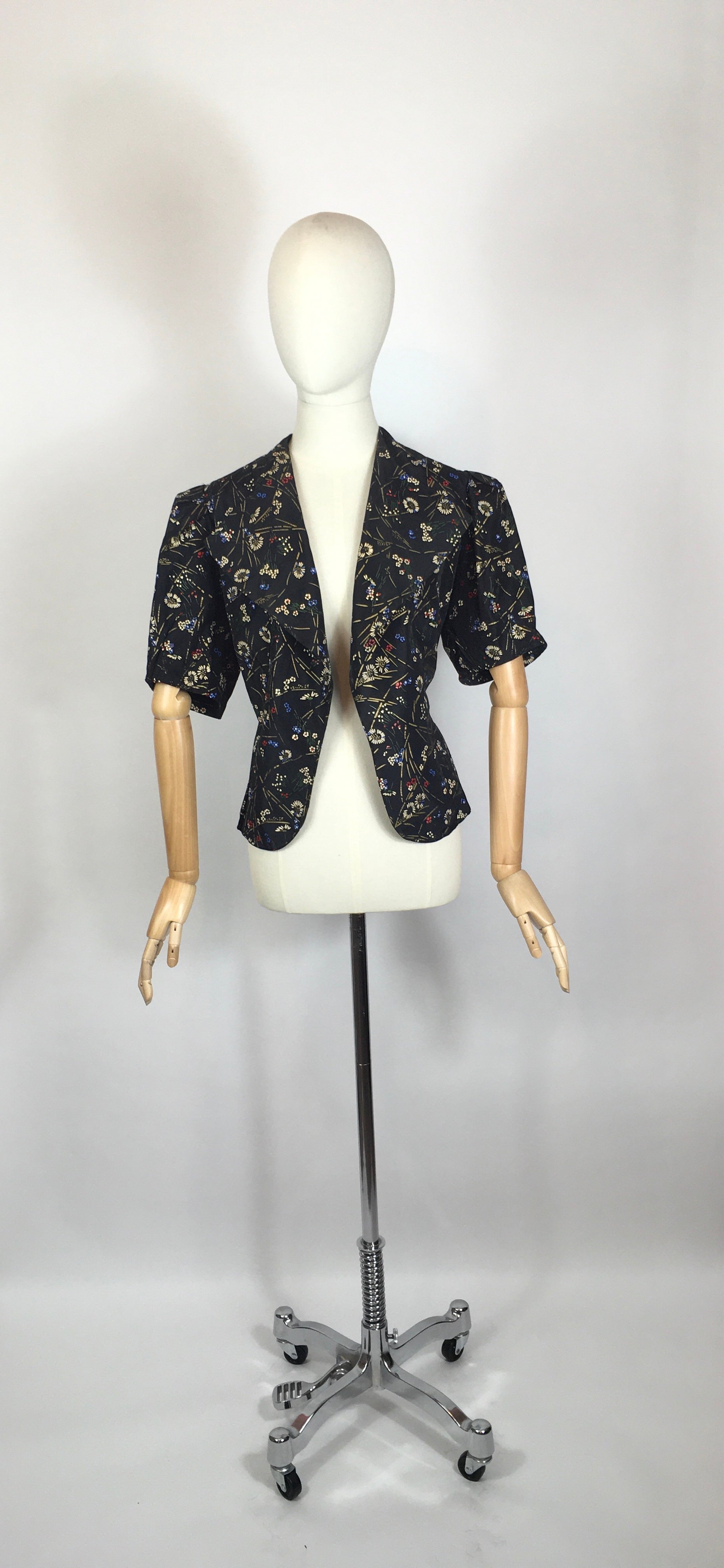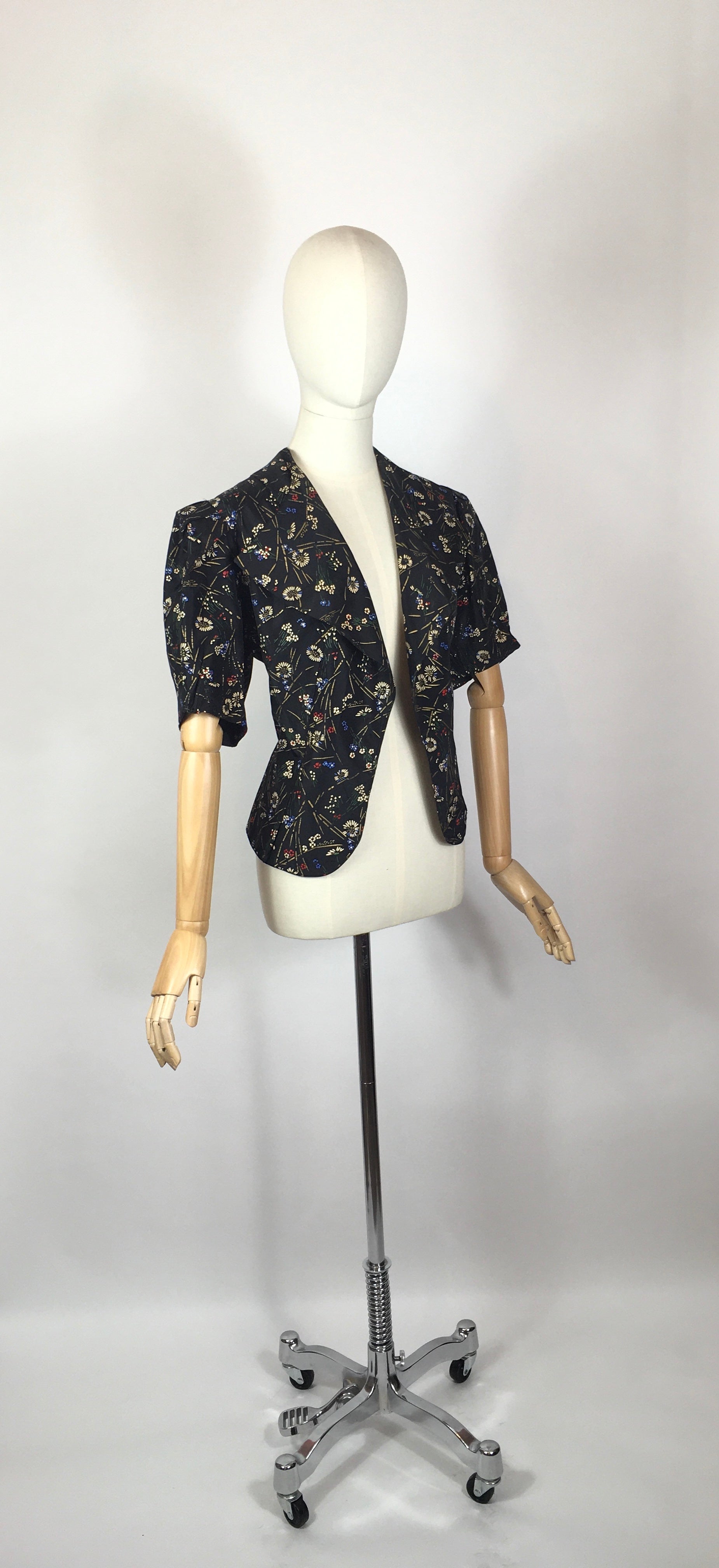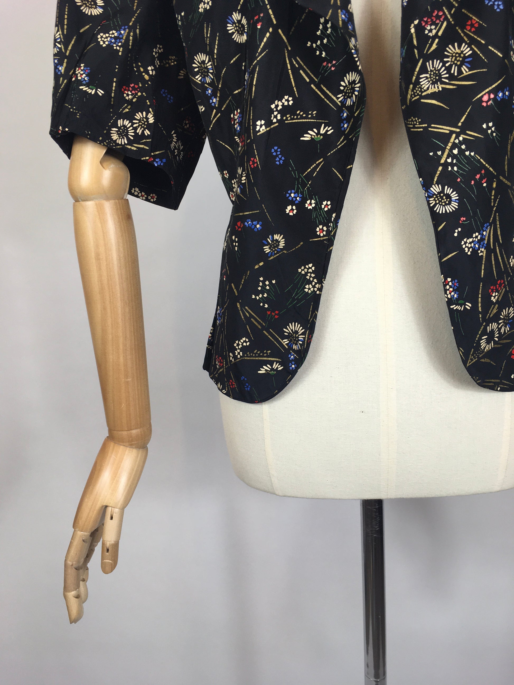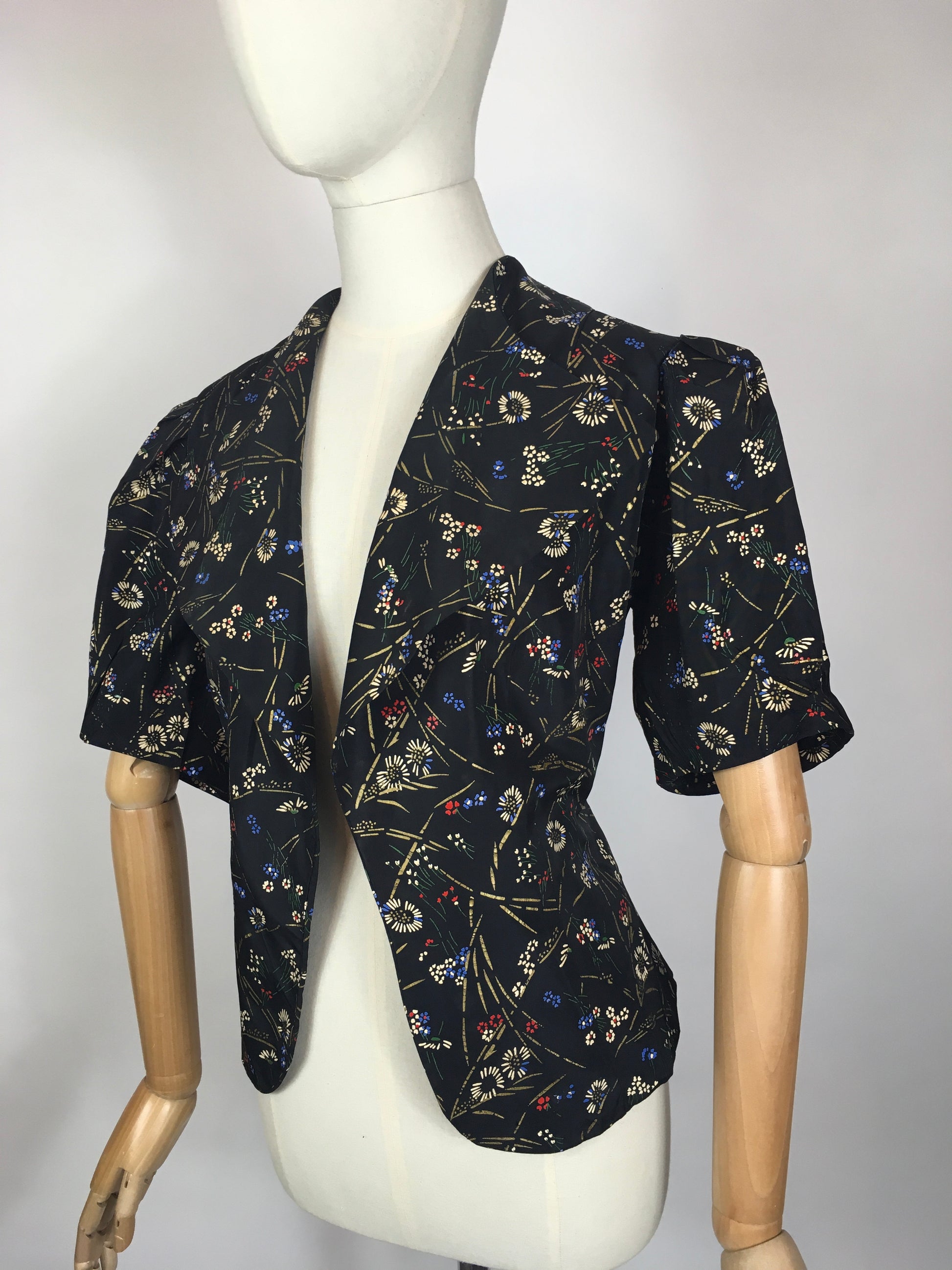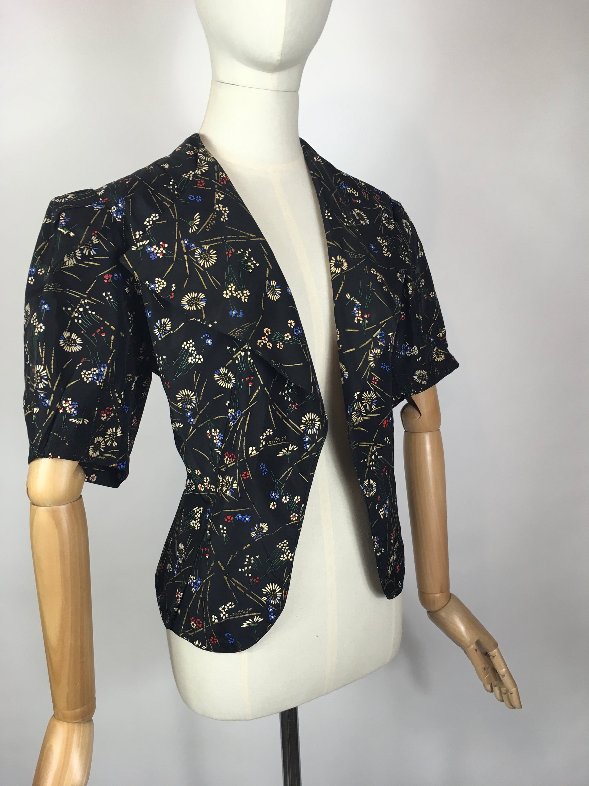 Vintage 1930’s exquisite evening jacket made from a beautiful Handpainted floral sateen with pops of rich reds, greens, blues and ivory on a bed of rich black. It features a classic 30’s silhouette with puff shoulder seam, short sleeve, draped waterfall bodice and a soft peplum detailing from the waistline. Fully lined and has a beautiful British Made by ‘ Bermella’ Label.