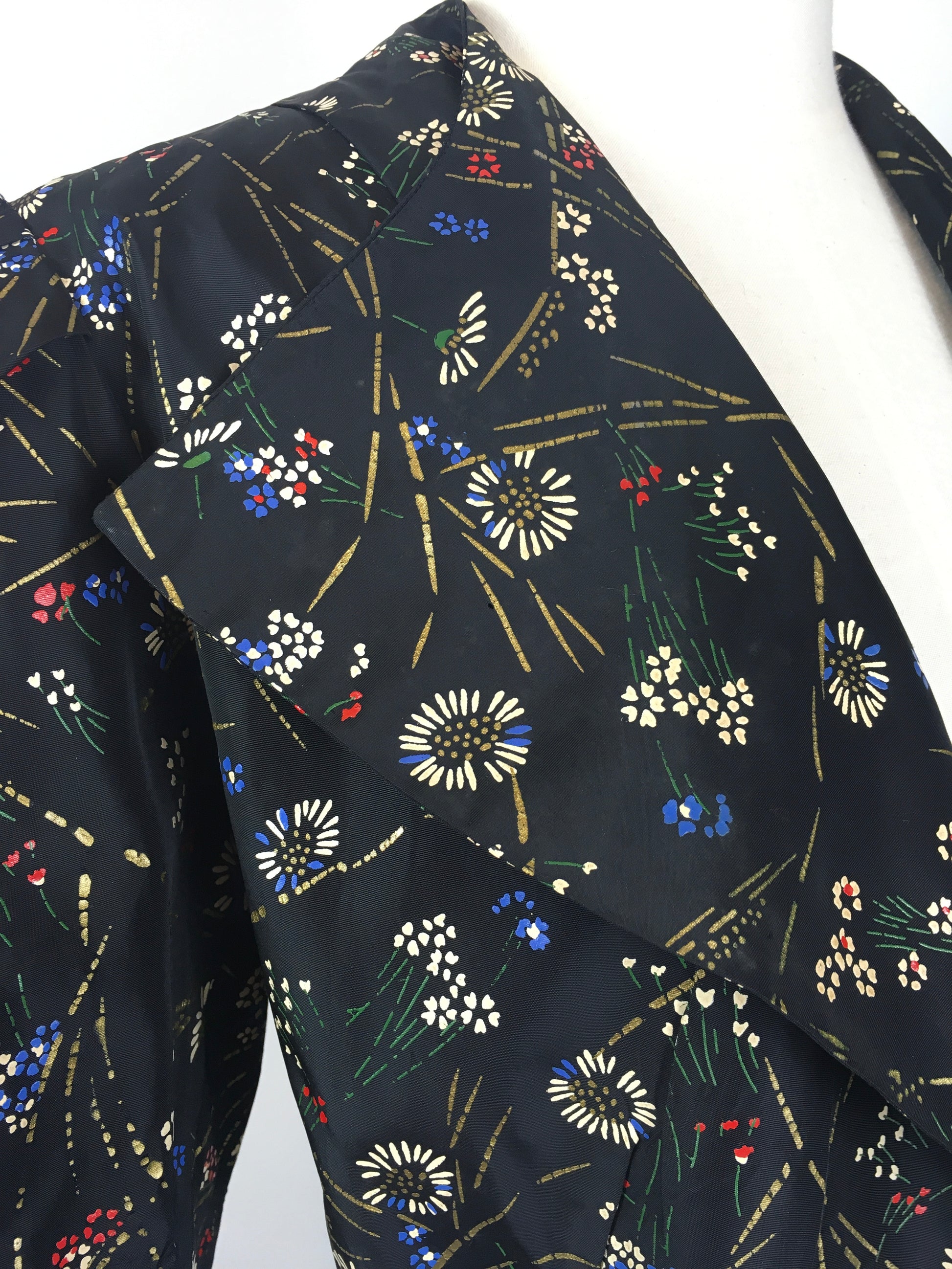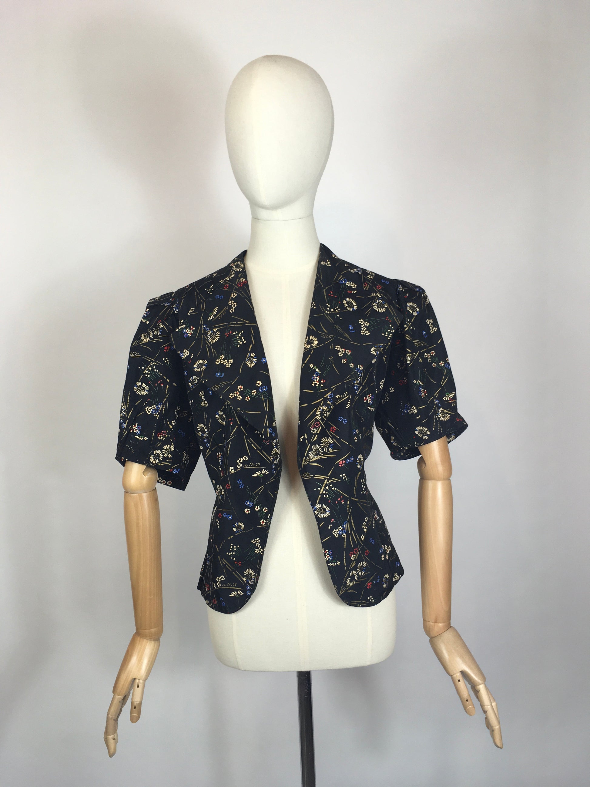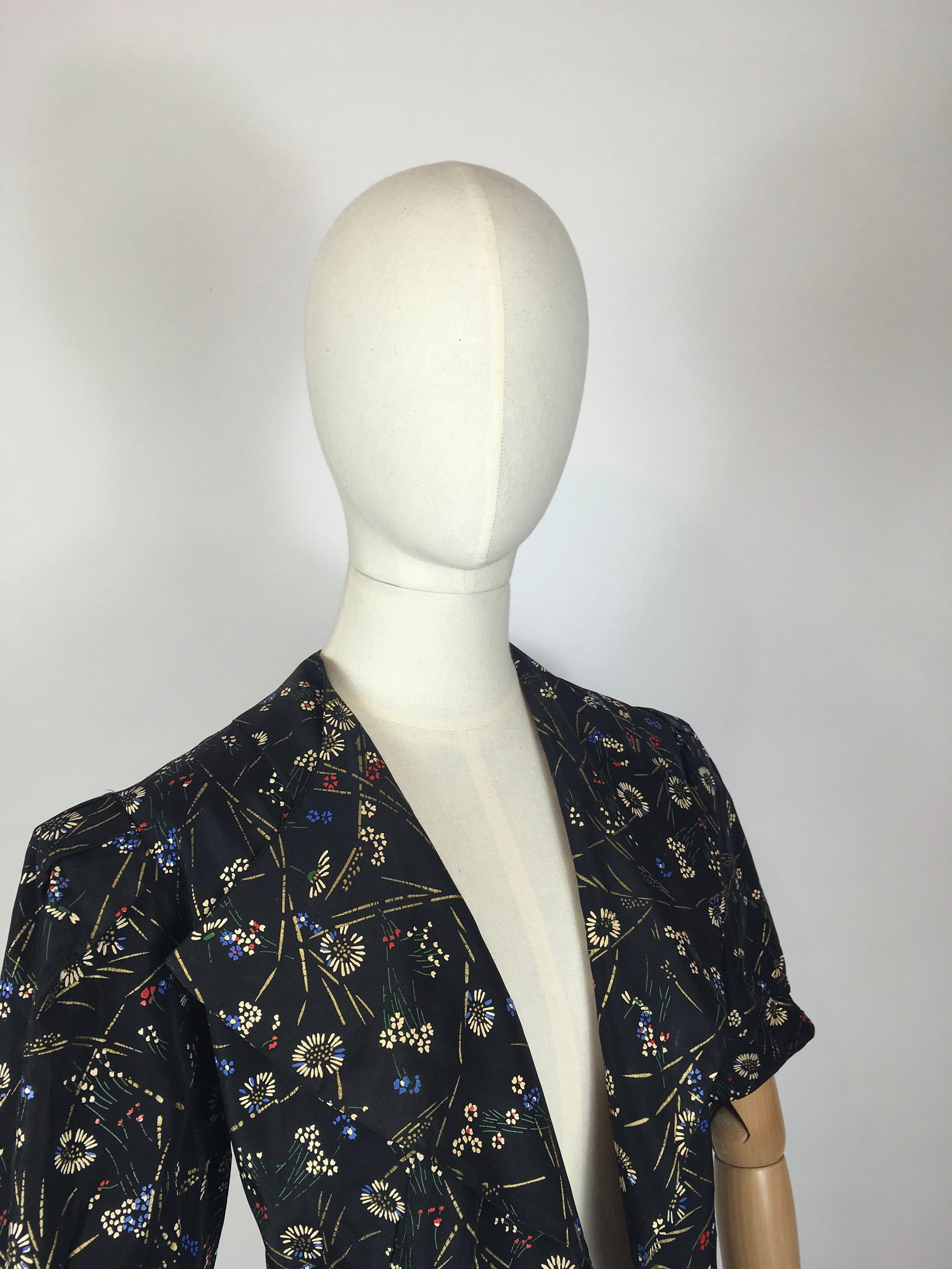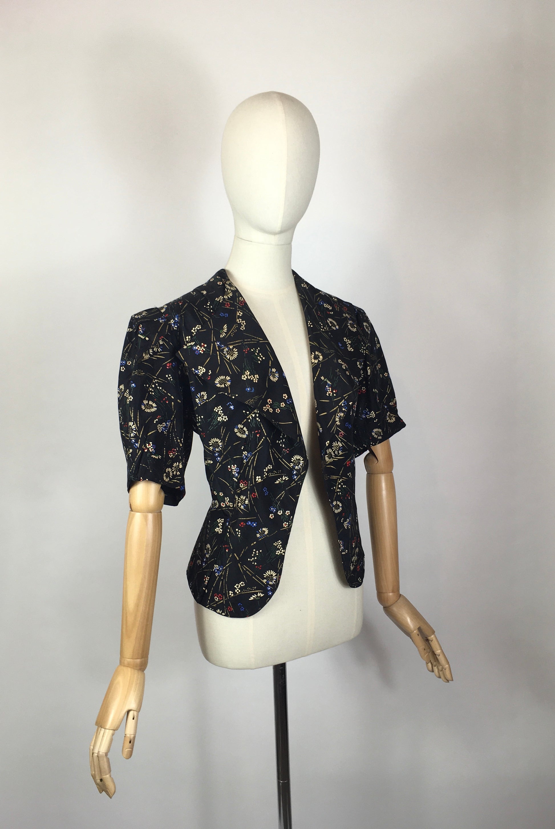 Vintage 1930’s exquisite evening jacket made from a beautiful Handpainted floral sateen with pops of rich reds, greens, blues and ivory on a bed of rich black. It features a classic 30’s silhouette with puff shoulder seam, short sleeve, draped waterfall bodice and a soft peplum detailing from the waistline. Fully lined and has a beautiful British Made by ‘ Bermella’ Label.