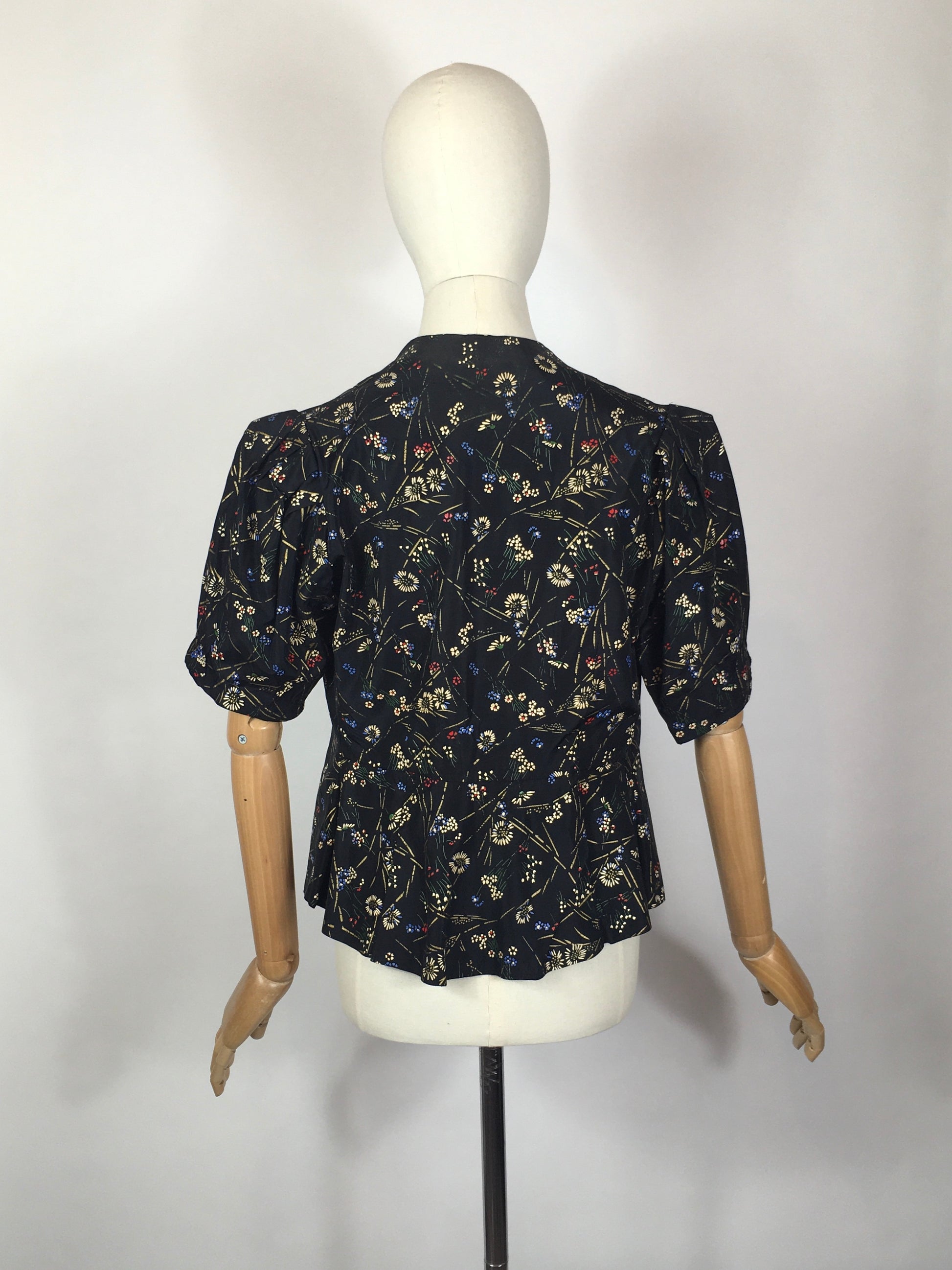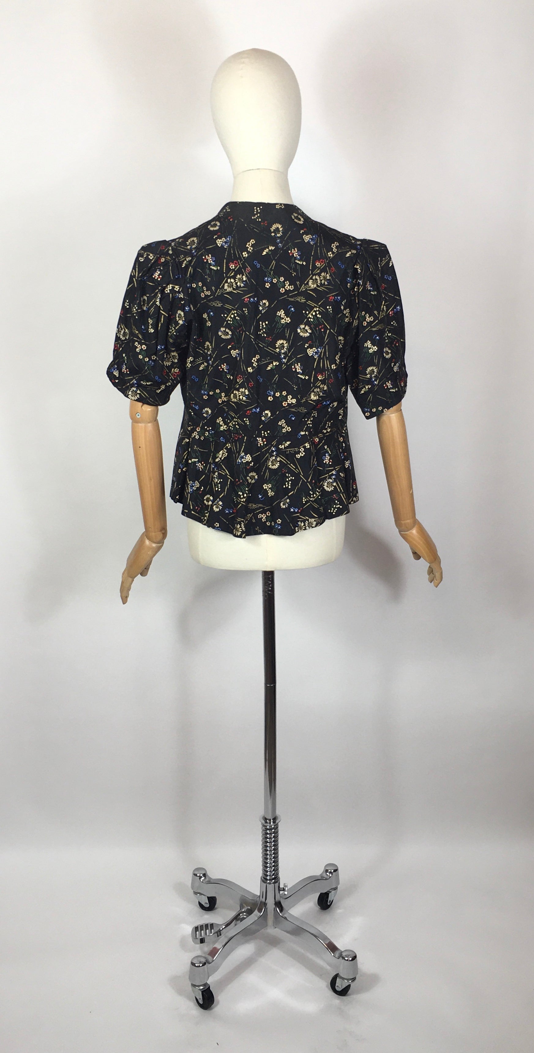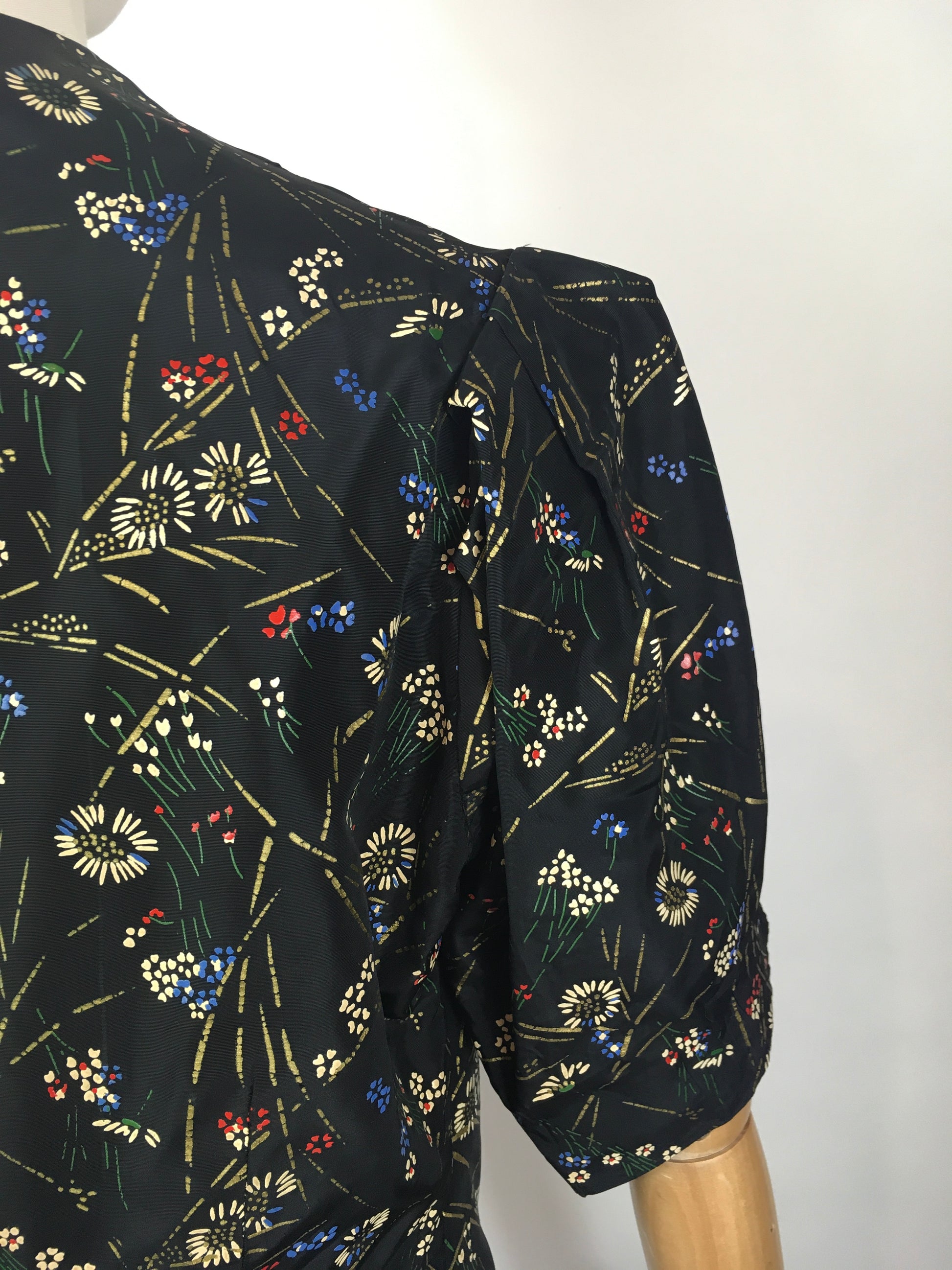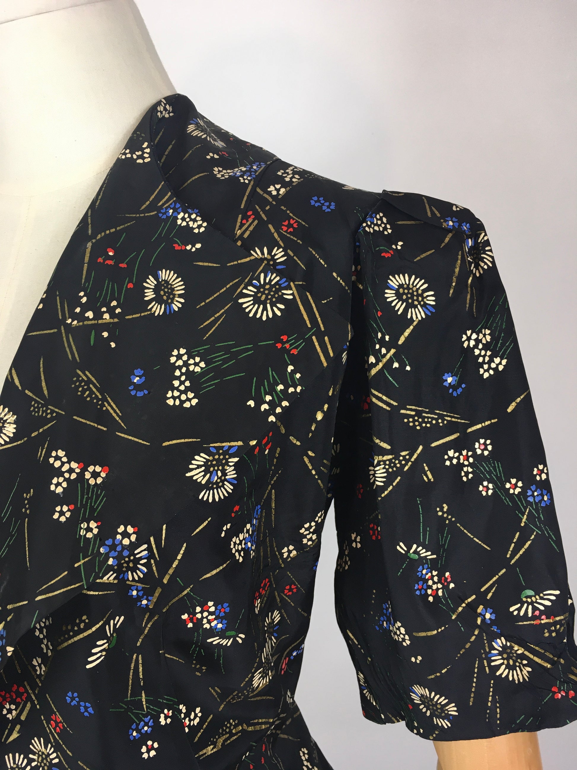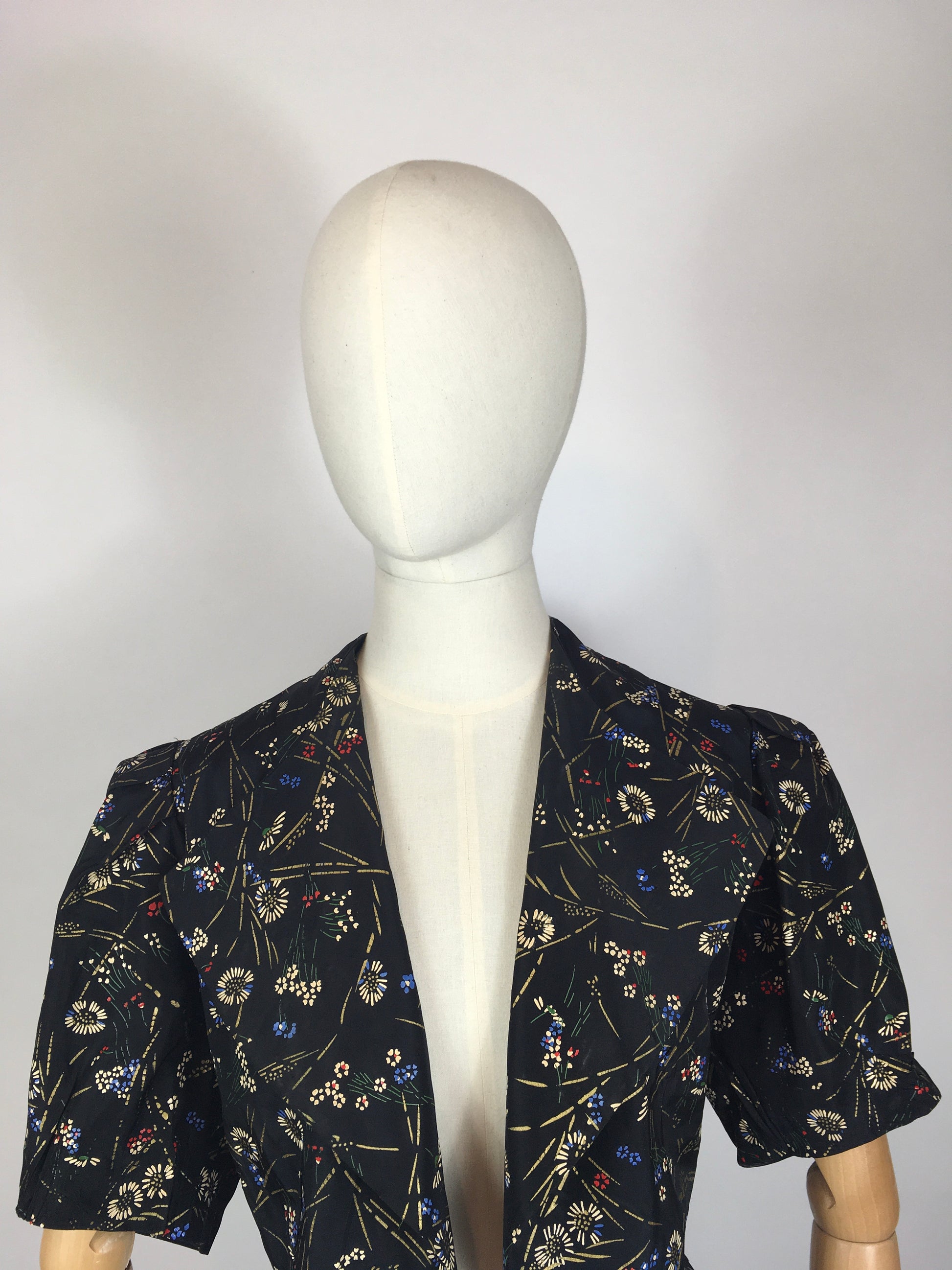 Vintage 1930’s exquisite evening jacket made from a beautiful Handpainted floral sateen with pops of rich reds, greens, blues and ivory on a bed of rich black. It features a classic 30’s silhouette with puff shoulder seam, short sleeve, draped waterfall bodice and a soft peplum detailing from the waistline. Fully lined and has a beautiful British Made by ‘ Bermella’ Label.