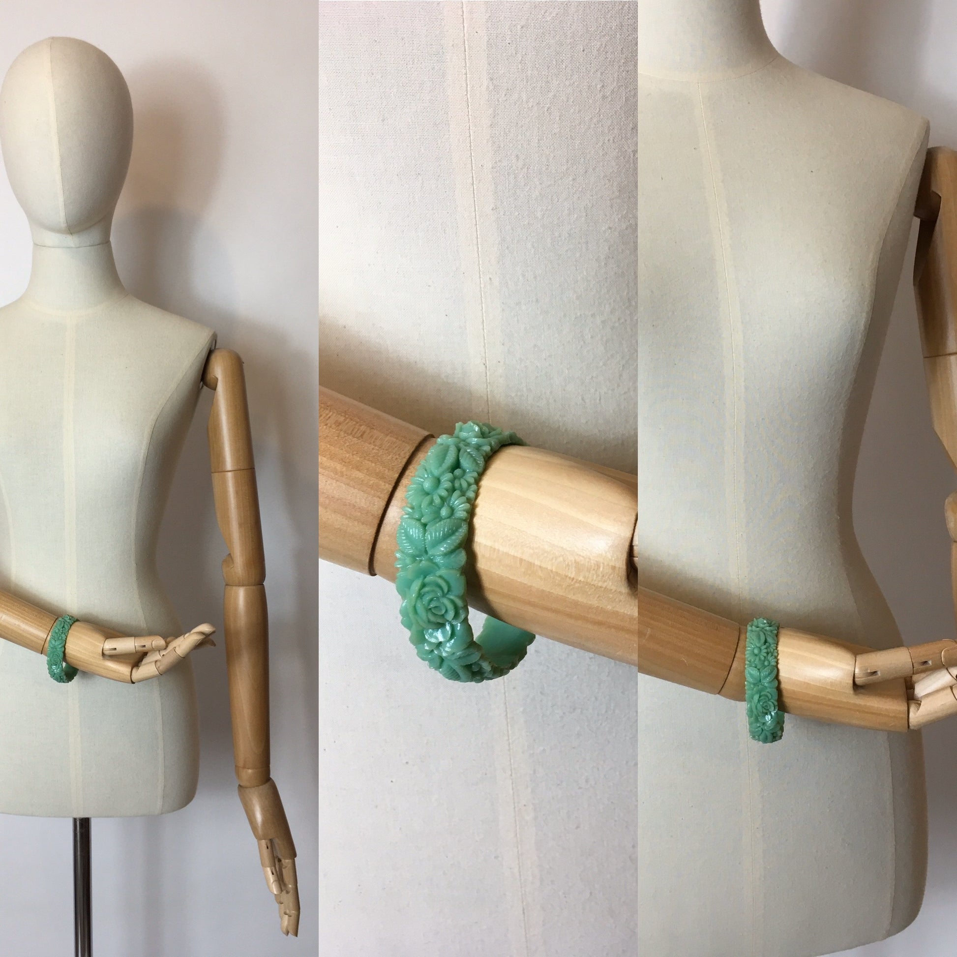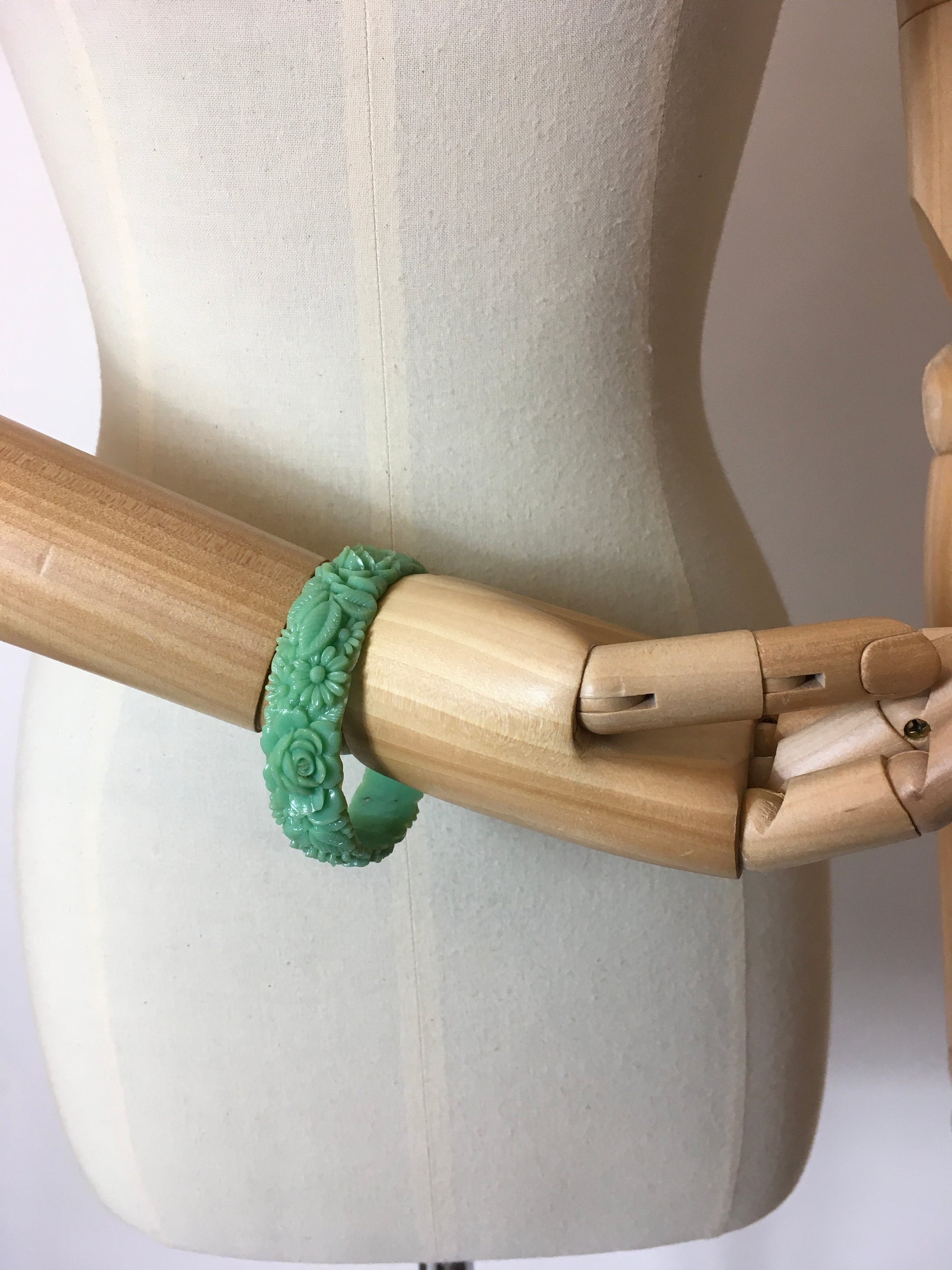 Original 1930’s Floral Carved Celluloid Bangle in Mint Green - Festival of Vintage Fashion Show Exclusive